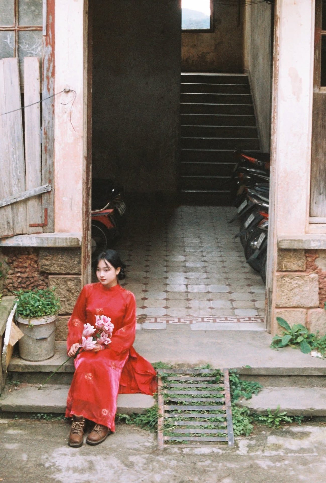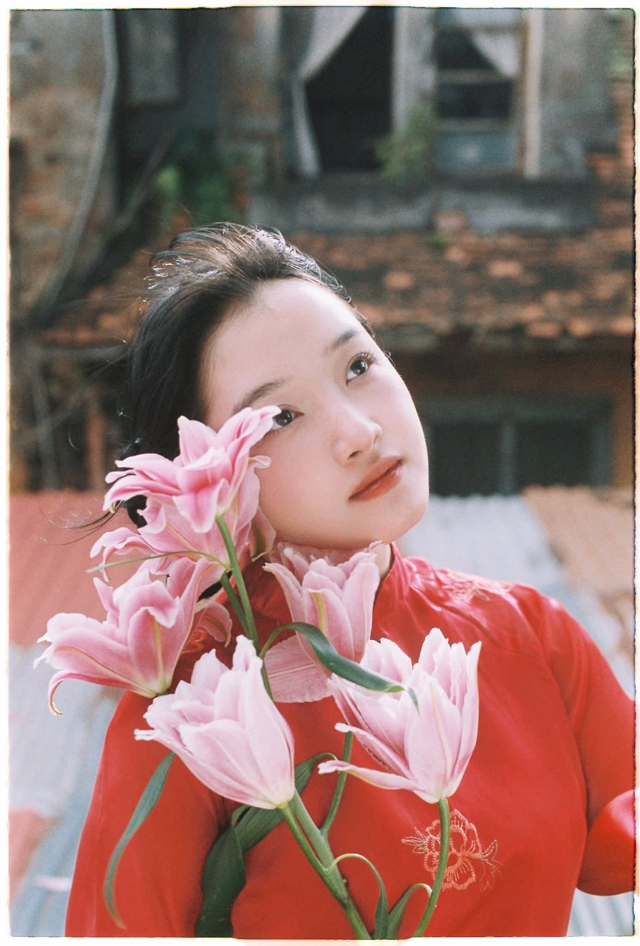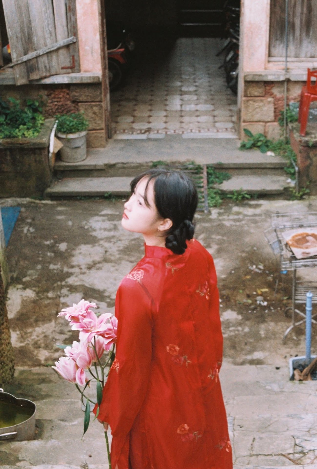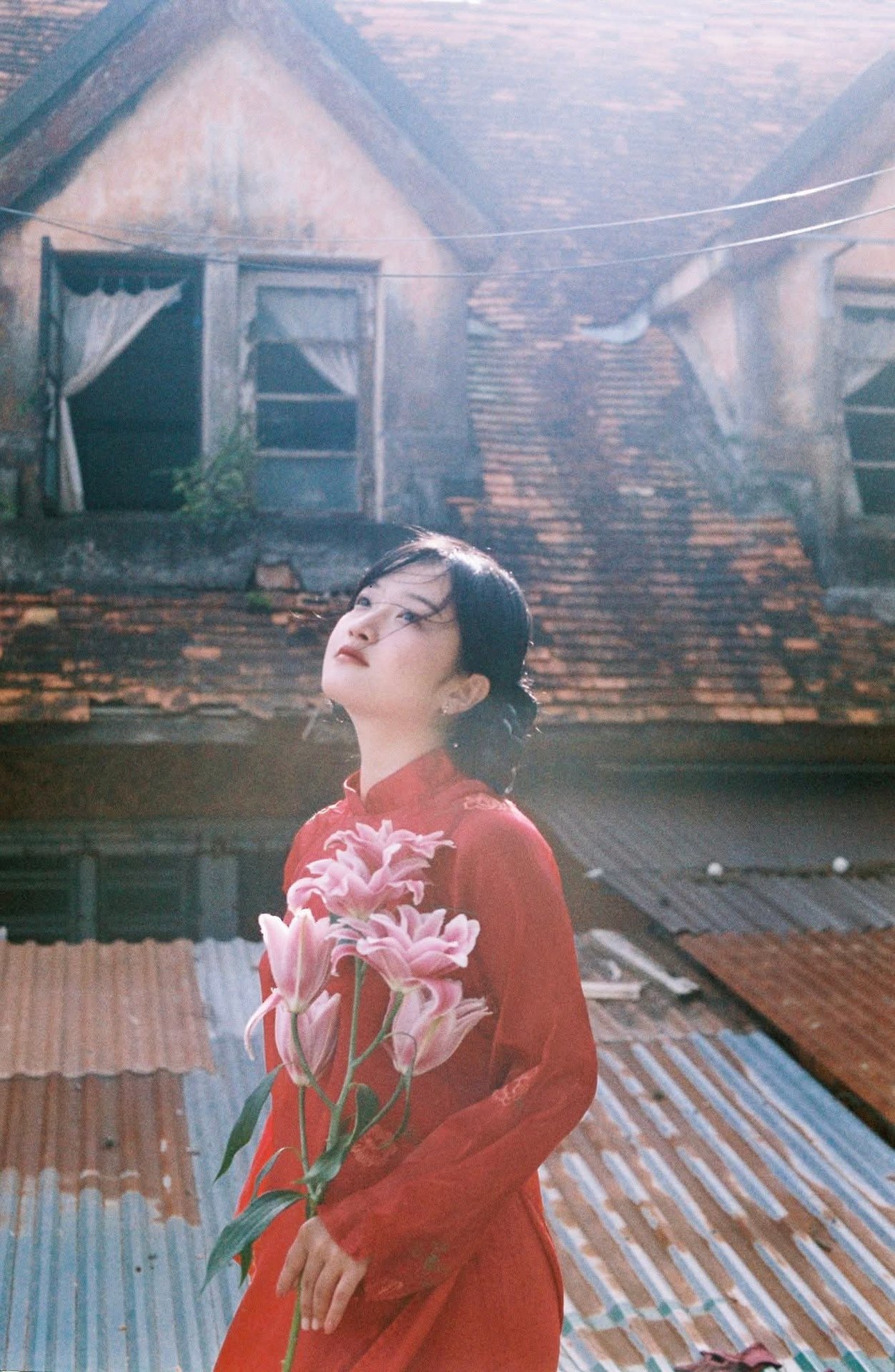 This captivating image captures a poignant moment of a young Vietnamese woman gracefully adorned in a traditional red Ao Dai. Her gentle expression and neatly tied hair exude a timeless elegance as she gazes softly towards the viewer. She holds a delicate bouquet of light pink lilies adding to her serene charm and purity. The backdrop features an old house with weathered tiled roofs and an aged window evoking a strong vintage and nostalgic atmosphere. This scene beautifully blends traditional Vietnamese aesthetics with a sense of bygone eras creating a harmonious and peaceful tableau. It is a powerful representation of enduring Vietnamese cultural beauty
