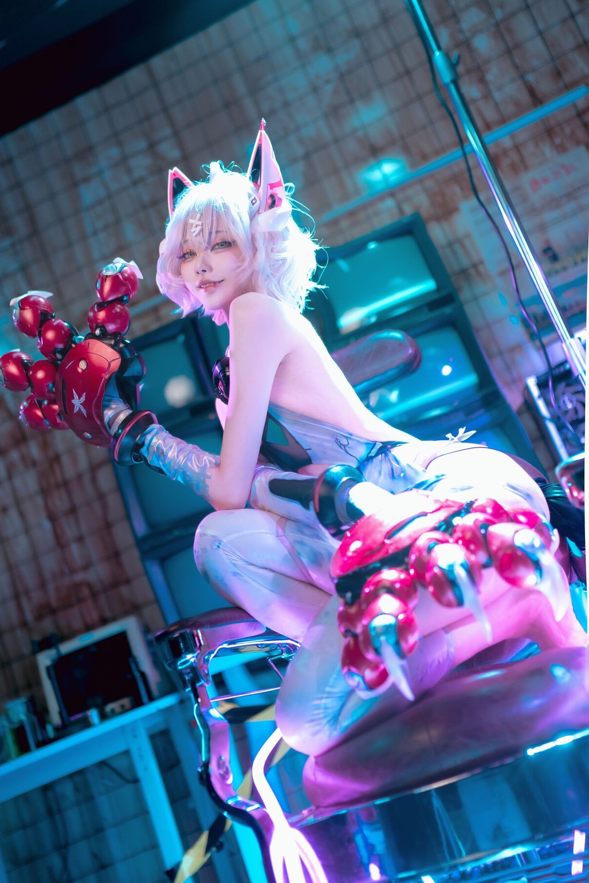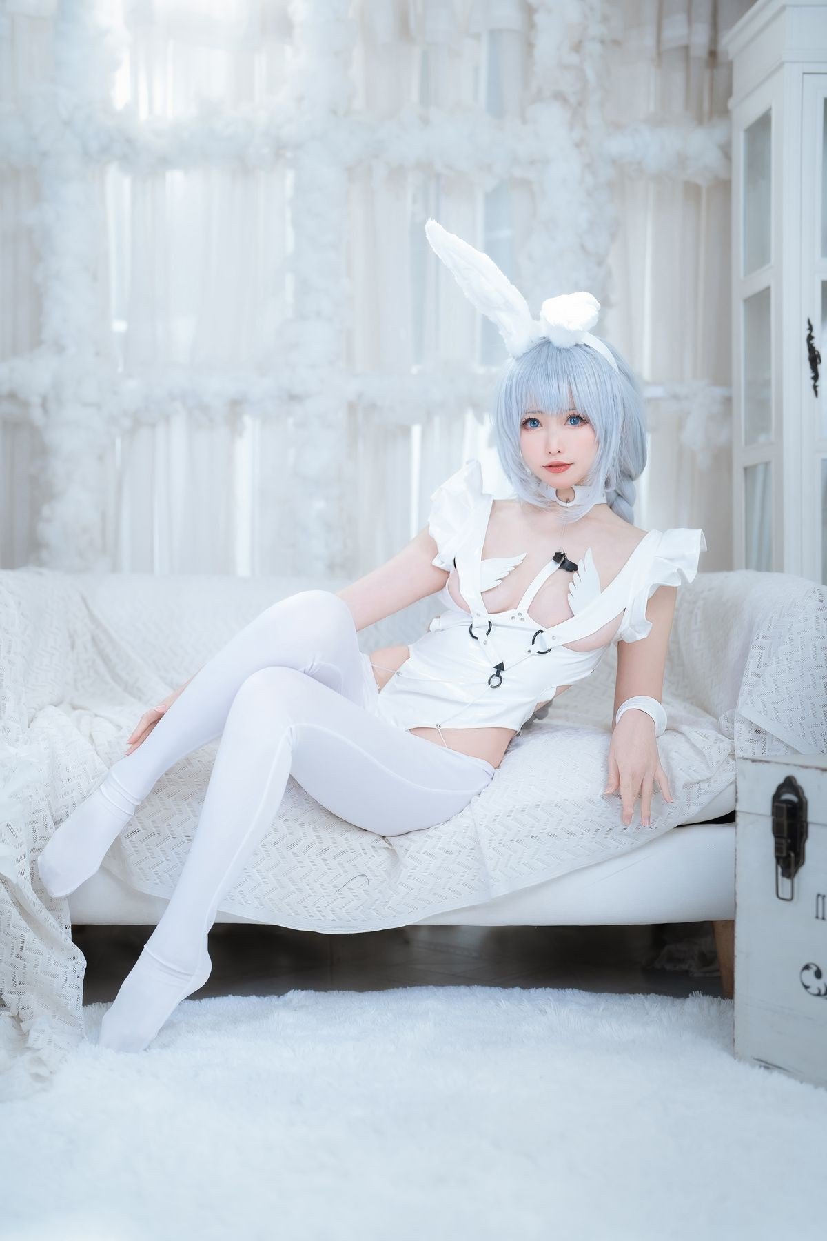 Coser@樱岛嗷一 captivates as the 'Evil Bunny Girl' in a stunning white cosplay ensemble. Her ethereal light blue hair and fluffy bunny ears create an innocent yet alluring contrast. The meticulously designed outfit features bold cutouts and delicate straps highlighting her graceful figure. With a subtle gaze and a hint of mischief 樱岛嗷一 embodies the character's unique blend of charm and edgy allure. This cosplay isnt just a portrayal its an artful interpretation that combines soft elegance with a distinctive unconventional style. The photoshoot leaves a lasting impression showcasing a captivating and memorable performance by Coser@樱岛嗷一.