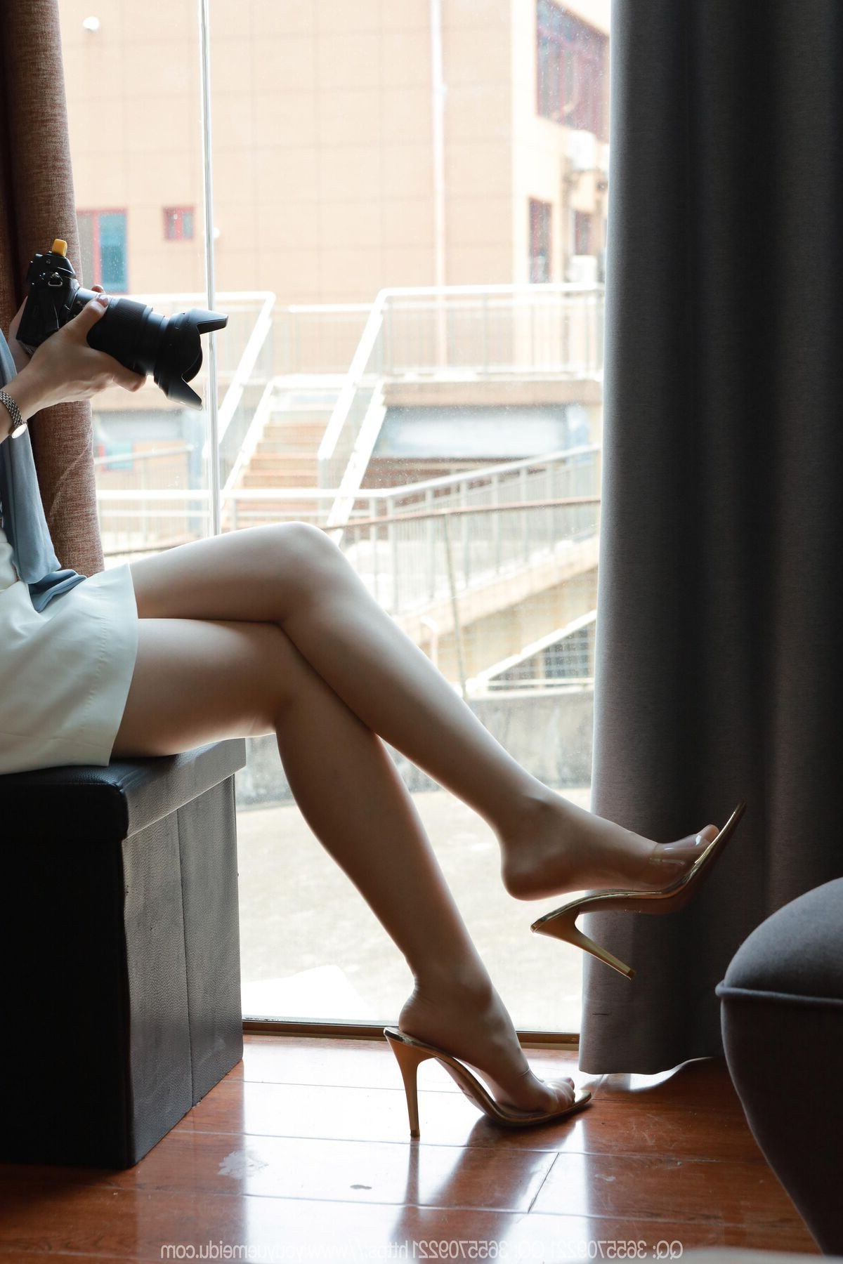 This captivating image portrays Chinese Model Xiao Jie embodying the elegant and professional essence of a modern secretary She is seated gracefully by a large window with natural light highlighting her sophisticated attire a light blue top and a formfitting white skirt Her long slender legs and high heels exude confidence and allure Her poised posture and contemplative gaze holding an object evoke a sense of thoughtful introspection Xiao Jie radiates an intellectual beauty and refined elegance presenting the image of a secretary who is not only capable but also exceptionally stylish This photograph transcends a mere moment becoming a symbol of empowered femininity stirring emotions about hidden beauty and professionalism within the corporate world
