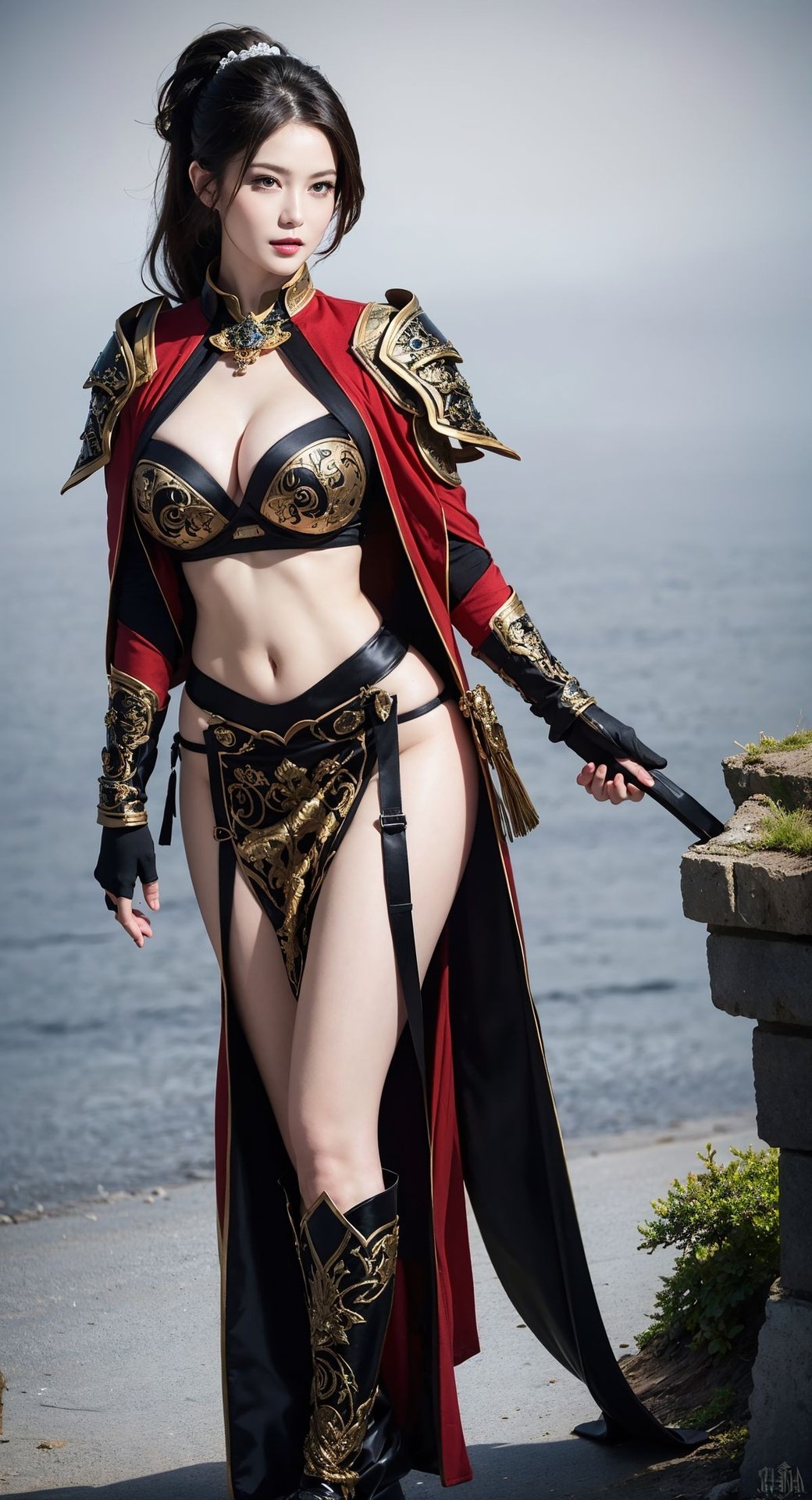 This stunning image showcases a powerful AI generated female warrior, rendered in an impressive web game style. She is depicted in a magnificent red and black warrior outfit, adorned with intricate gold armor that accentuates her elegant beauty and graceful physique. The female general stands confidently by the water's edge, weapon in hand, her gaze resolute and exuding an aura of courage and authority. Every detail, from her armor and attire to her hair, is meticulously crafted, demonstrating advanced AI technology in character design. This portrayal not only highlights her captivating allure but also affirms the latent strength of a legendary combatant, ready to face any challenge.