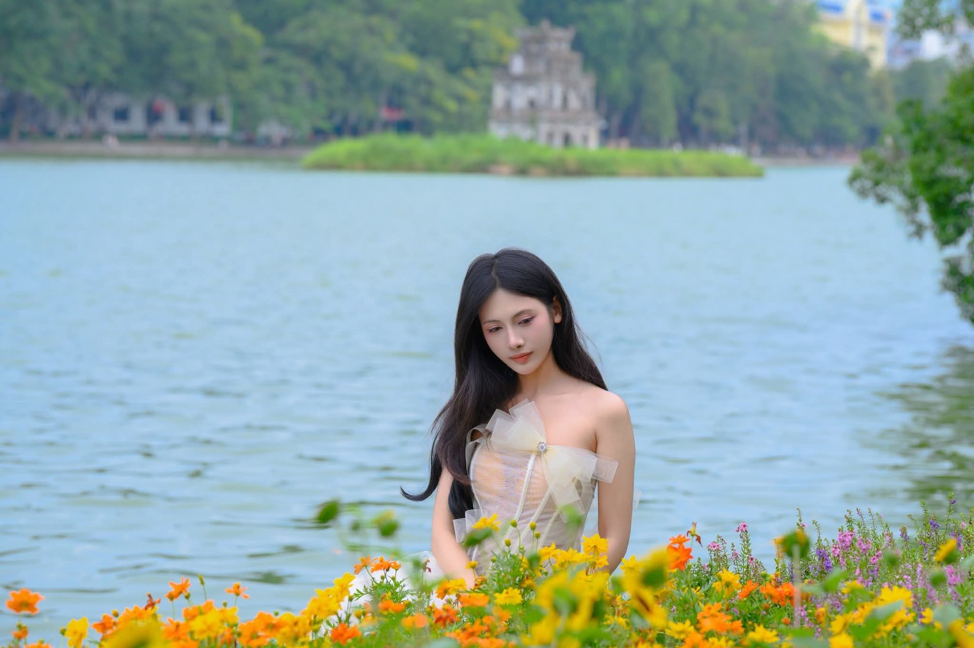 Gentle Beauty of Vietnamese Woman in Traditional Ao Dai at Hoan Kiem Lake
