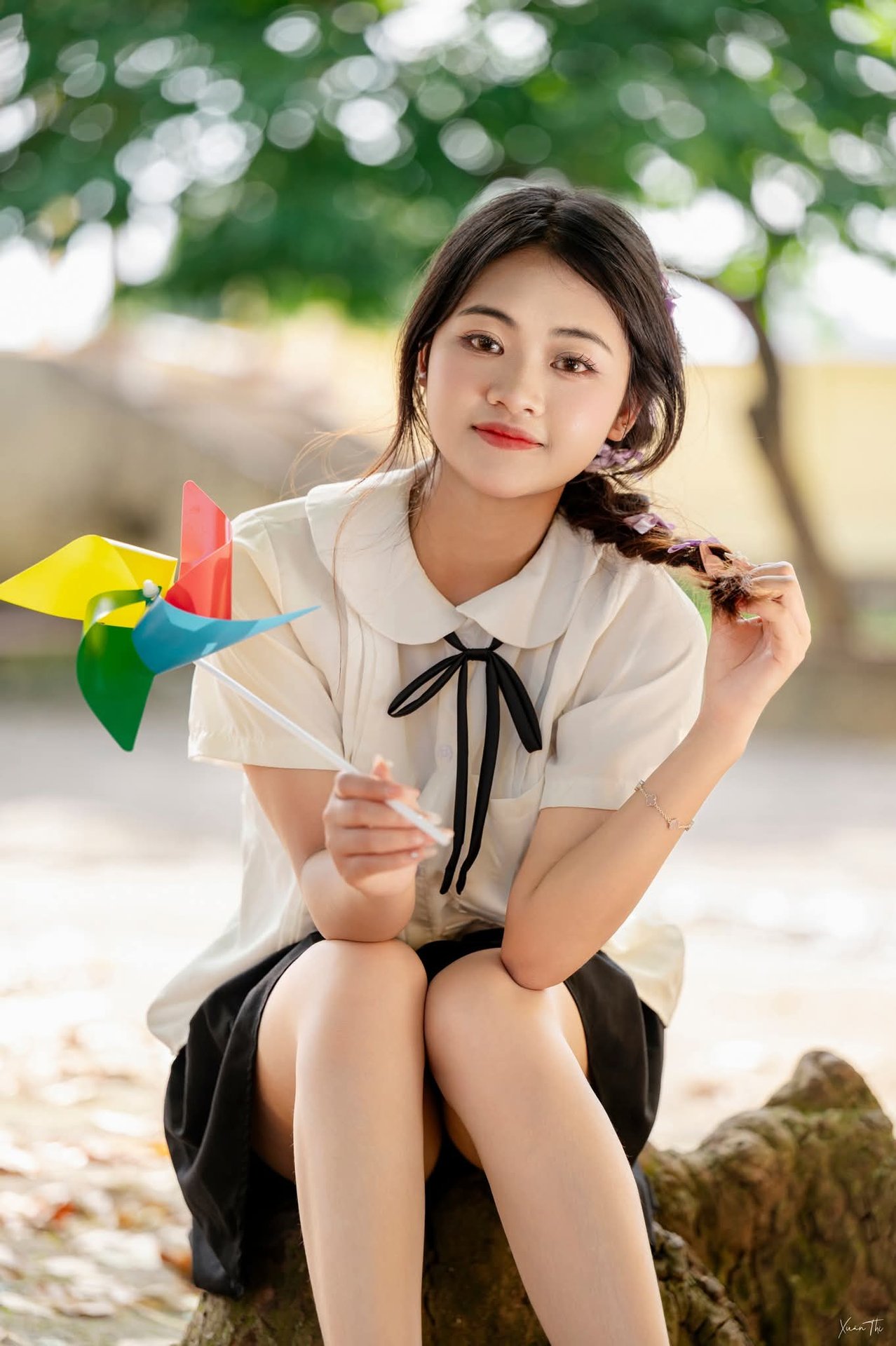 This beautiful portrait captures the innocent moment of a schoolgirl. The young girl wears a pristine white shirt paired with a black skirt, evoking the familiar image of a school uniform. She holds a colorful pinwheel, a symbol of childhood and innocence. Her pure beauty emanates from her gentle eyes and subtle smile. Her neatly braided hair, delicate face, and smooth fair skin highlight her natural charm. The outdoor setting with soft light and blurred green foliage in the background further enhances the graceful and fresh appearance of the young woman. This image perfectly represents the pristine beauty and carefree spirit of student life.