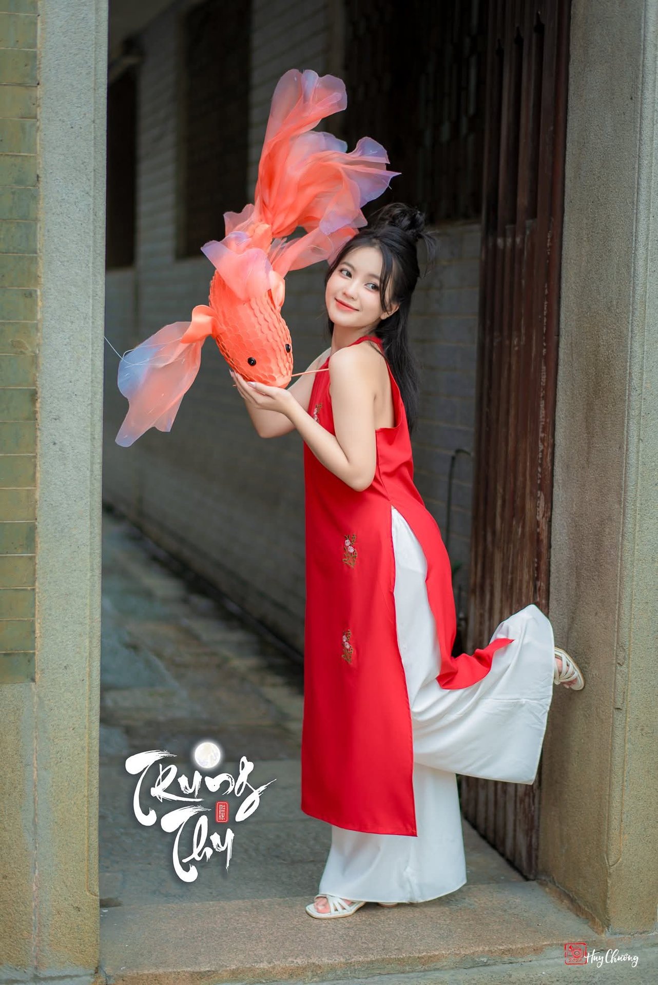 Vietnamese Cultural Beauty: Girl in Red Ao Dai & Traditional Lion Dance Prop