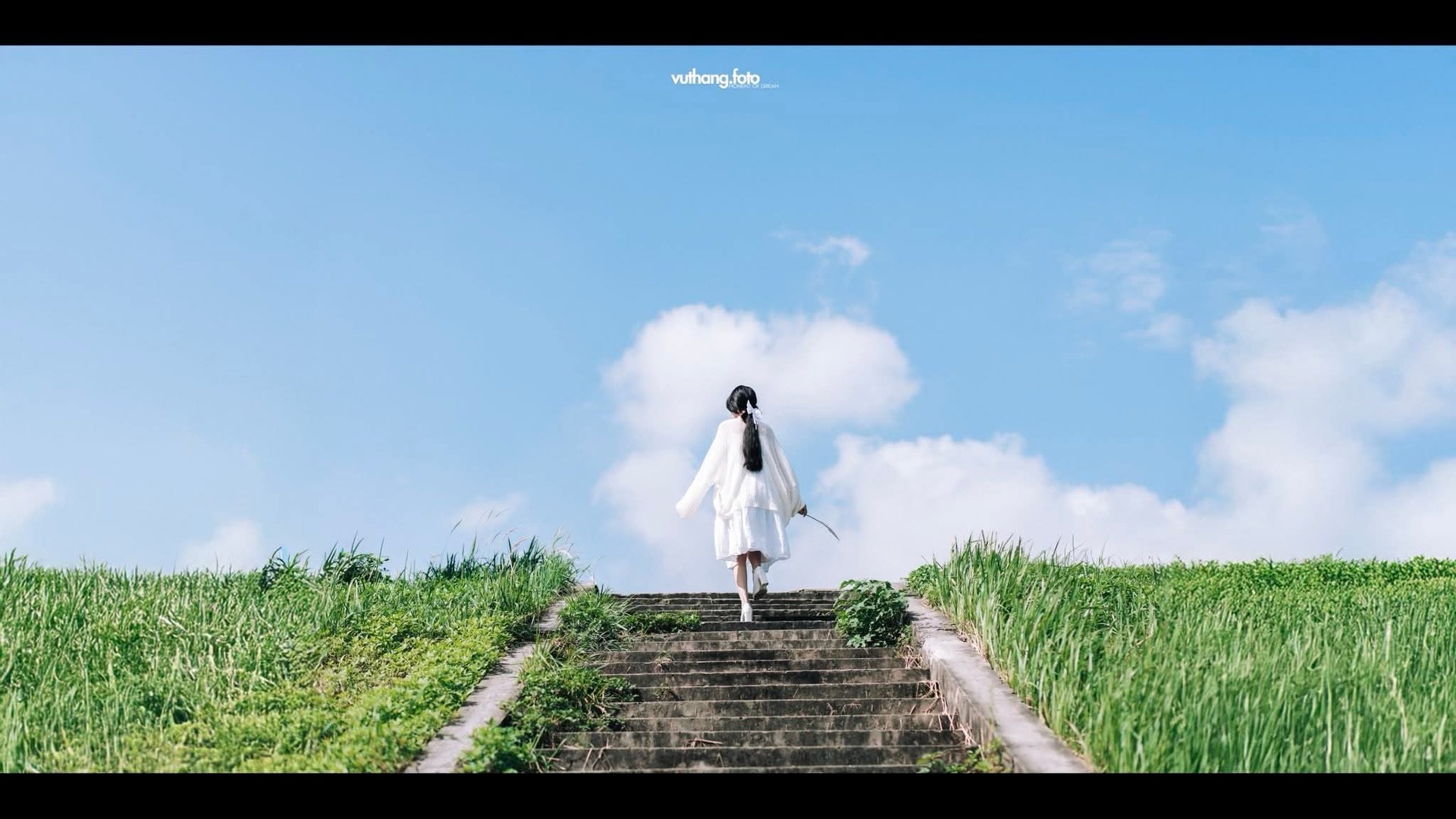This captivating image features a graceful young woman dressed in pristine white, beautifully integrated into a vibrant natural setting. Her long dark hair and gentle smile exude serenity as she stands on a concrete staircase, flanked by lush green grass under a clear, azure sky. Soft sunlight bathes the scene, highlighting her delicate beauty and the harmonious connection between humanity and the environment. This picture is perfect for those seeking tranquility, natural charm, and inspiration from the seamless blend of human presence within nature's embrace.