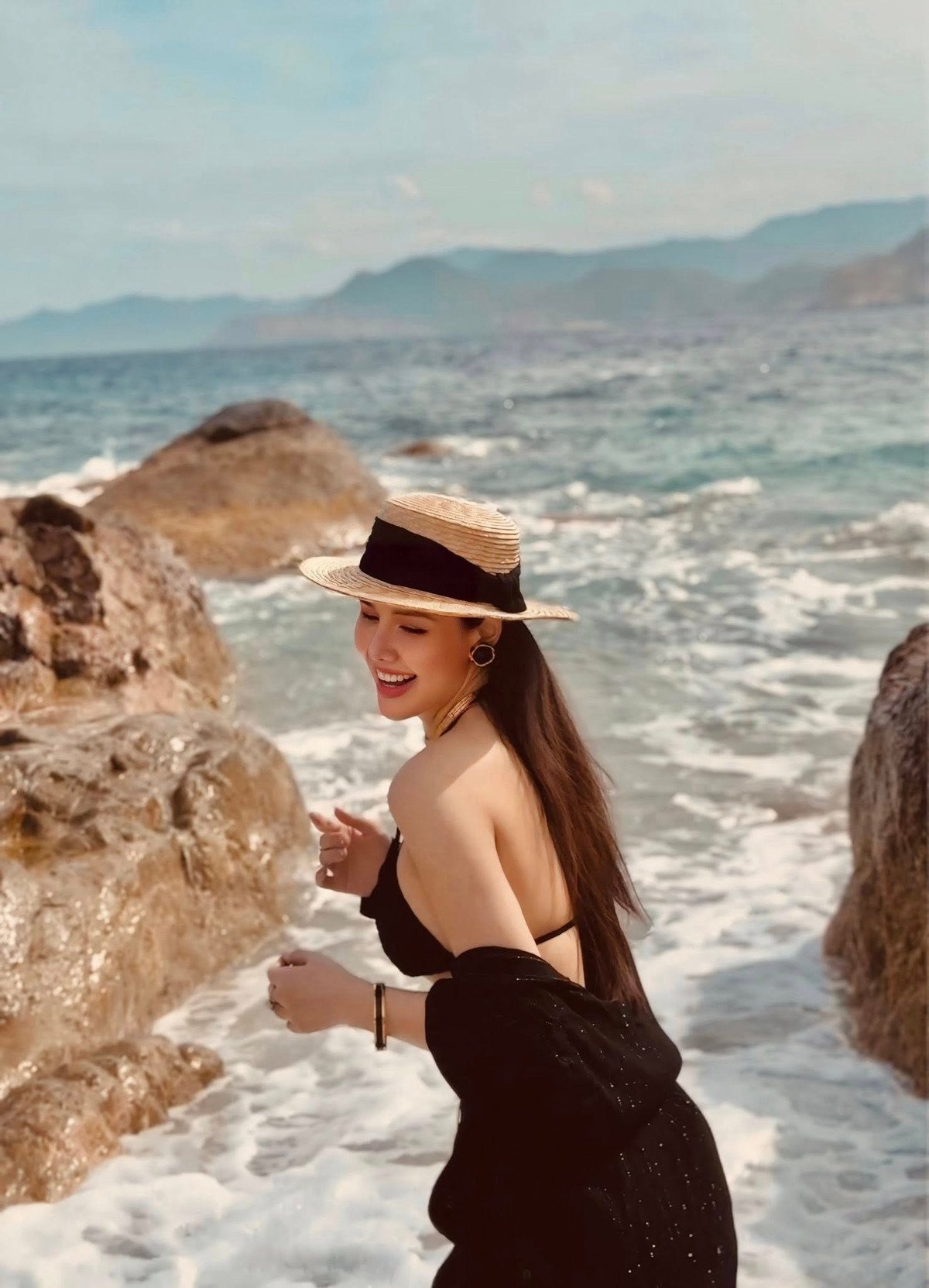 Phanh Lee shines brightly on the white sandy beach, showcasing her radiant beauty and captivating figure in a striking black one-piece bikini. Her fresh smile, paired with a fashionable straw hat, further accentuates her elegant yet alluring style. The natural, graceful pose exudes absolute confidence. This photo embodies the essence of summer, evoking a sense of relaxation and freedom while enjoying wonderful moments by the pristine blue sea. It is an inspiring image of a modern hot mom's confidence and impeccable demeanor, always knowing how to shine.