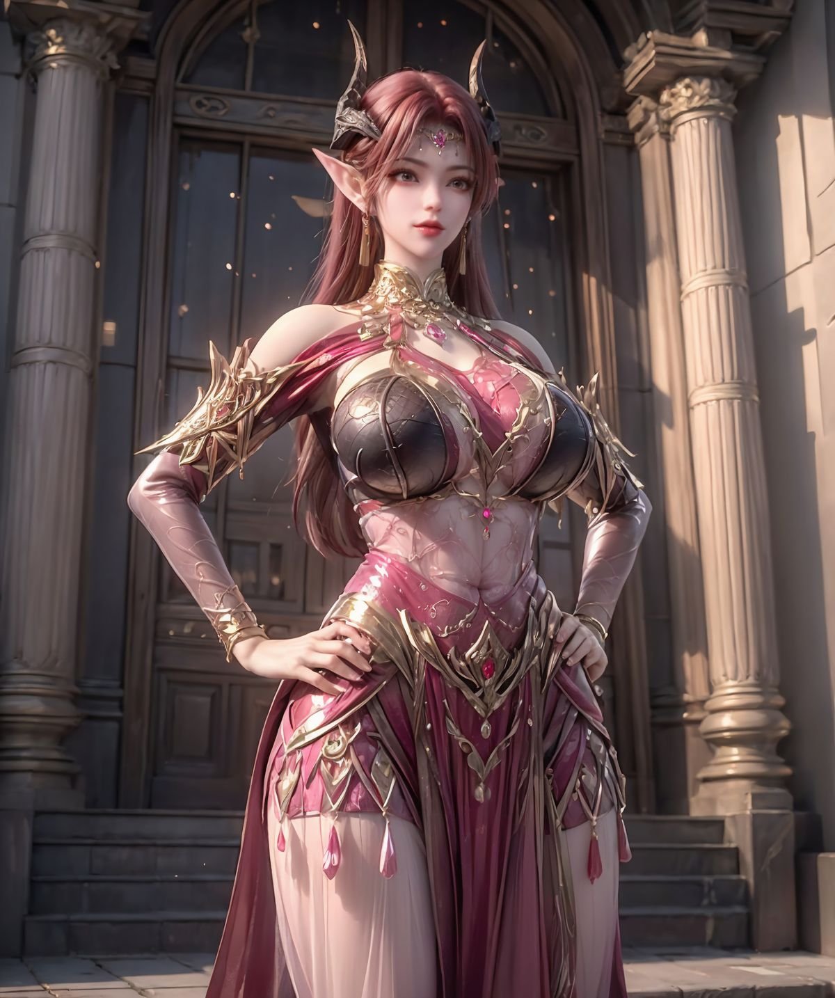 This AI Generated image unveils an enchanting fantasy warrior from the 百炼成神 妖夜 series. The character possesses a regal beauty with captivating reddish-brown hair delicate elf-like ears and mysterious small horns. She is adorned in an elaborate classic battle attire of rich burgundy and gleaming gold exquisitely detailed exuding both strength and allure. The mystical starlit night background further enhances her enigmatic charm. This stunning digital artwork perfectly blends power and grace portraying a beautiful figure within a magical fantastical realm.