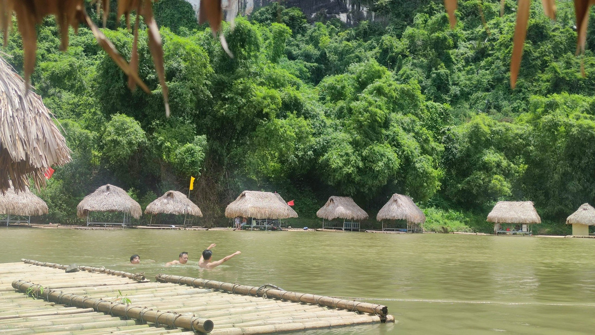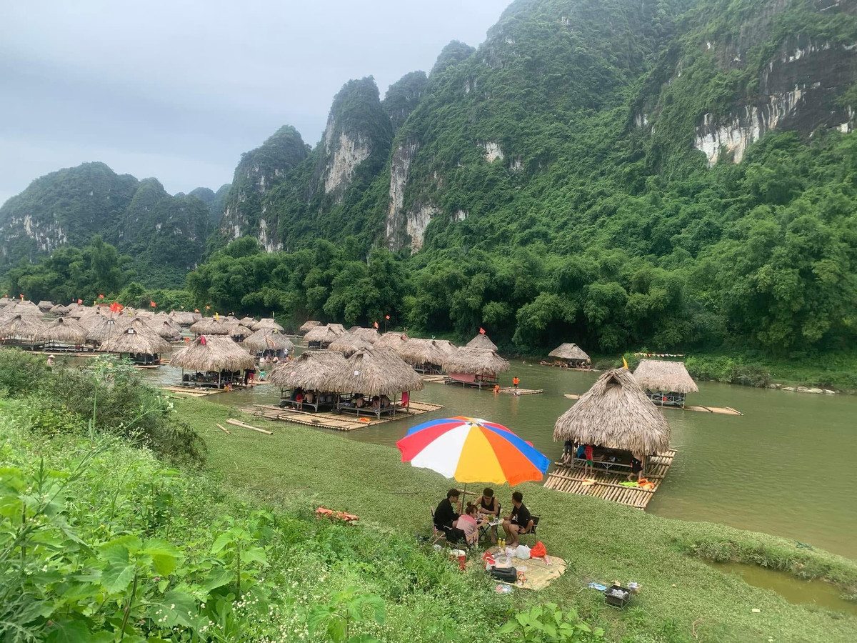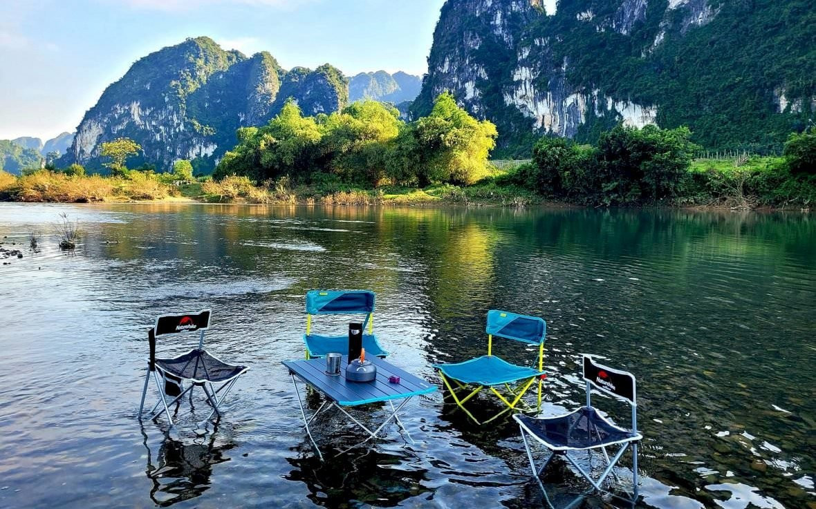 Explore the stunning **natural landscapes of Vietnam** at Boi River, Phu Tho. This unique setup, featuring tables and chairs placed directly in the crystal-clear water, offers an unparalleled relaxing experience. Guests can immerse themselves in the majestic scenery of **towering mountains**, breathe in the fresh air, and savor the profound tranquility characteristic of **Vietnamese rural tourism**. An ideal destination for **rafting experiences in Phu Tho** or other **Phu Tho ecological tourism** activities, discovering the grandeur of its mountains and the rich Mường culture. A truly memorable escape into the heart of Vietnamese nature.