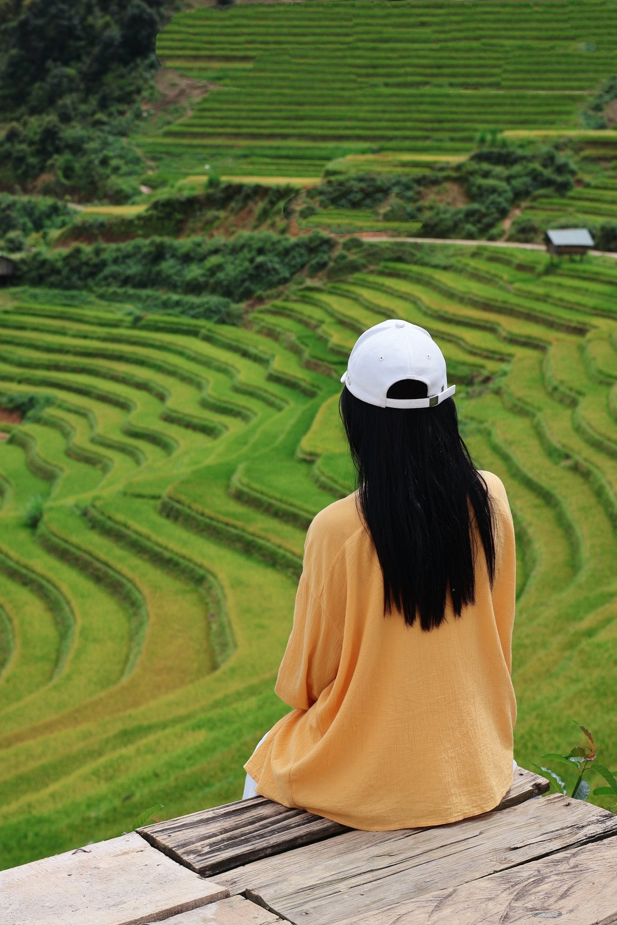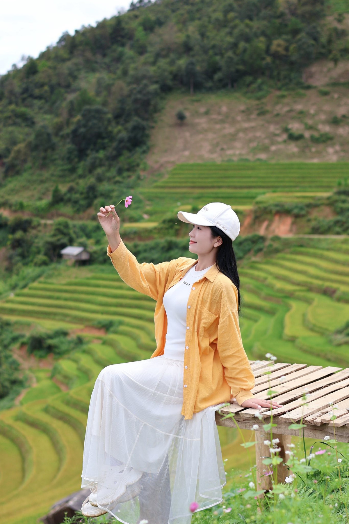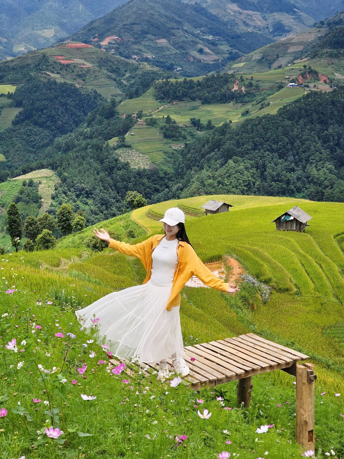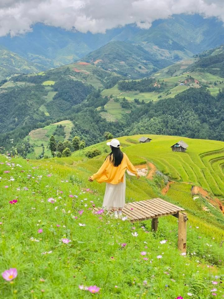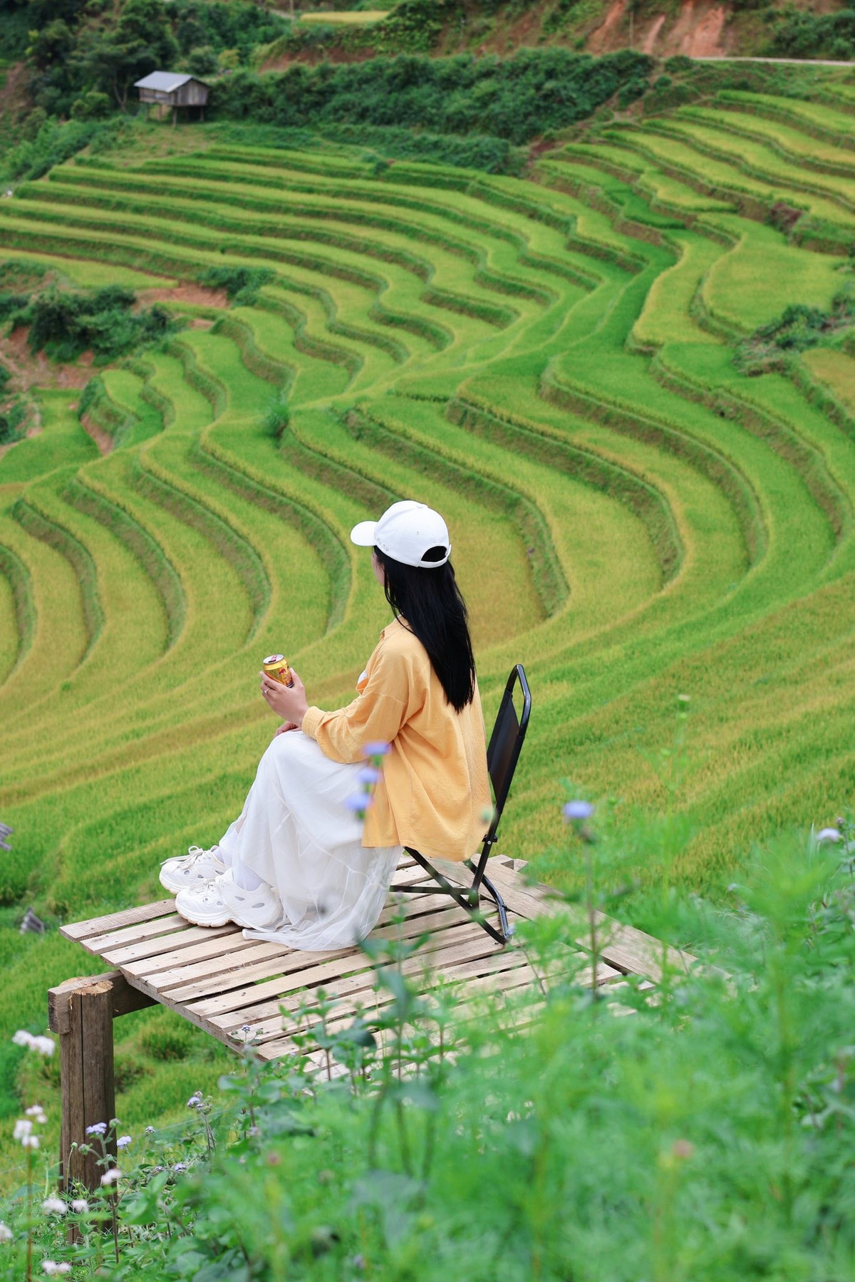 Immerse yourself in the majestic **natural beauty of Vietnam** at **Bản Kim Nọi Tây Bắc**. This captivating image showcases a traveler enjoying a serene **check-in** moment on a unique viewing platform, overlooking the lush green **Mù Cang Chải terraced fields**. These iconic rice paddies, winding gracefully like ribbons, offer a picturesque backdrop for **photographing terraced fields** and creating unforgettable memories. Discover this ideal **Vietnam travel destination** to experience the breathtaking **Tây Bắc** landscape and its unique cultural charm.