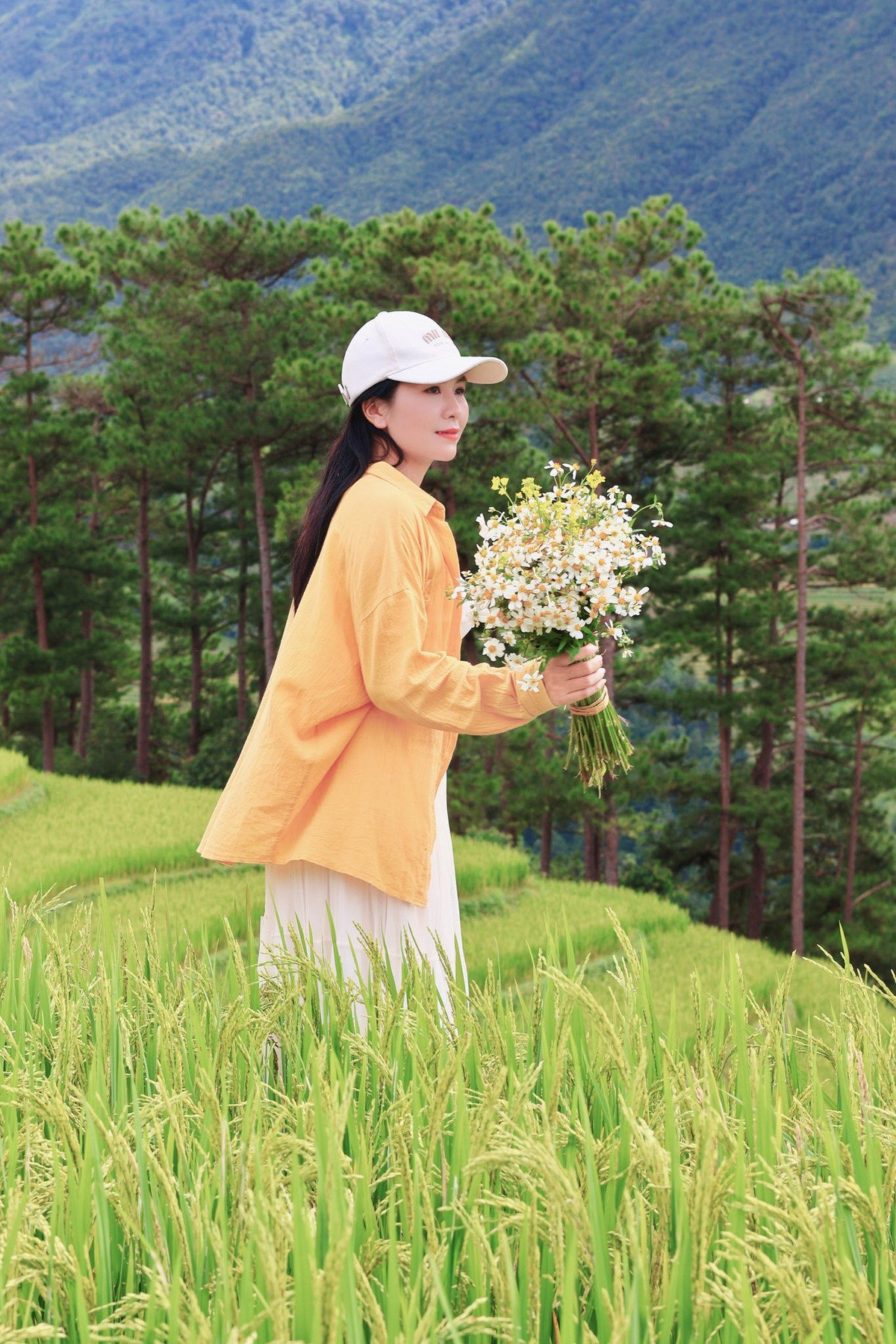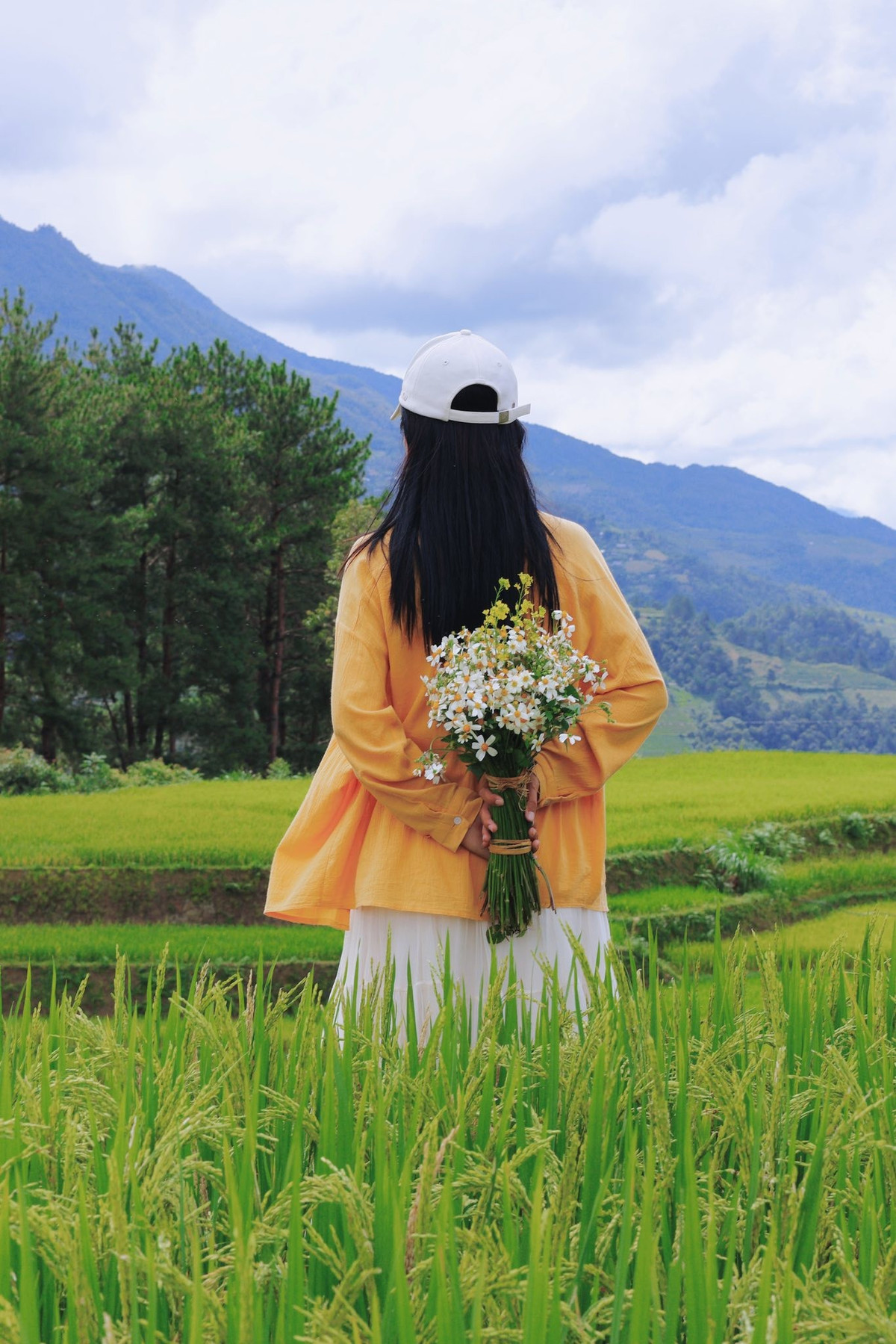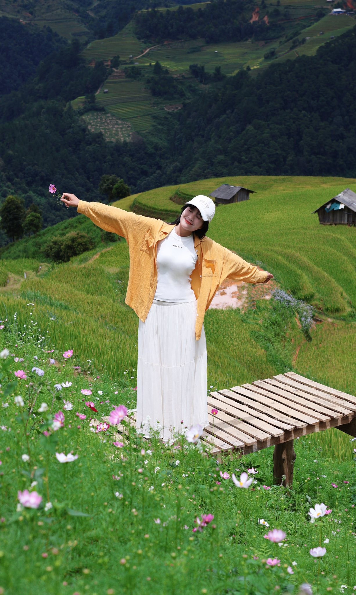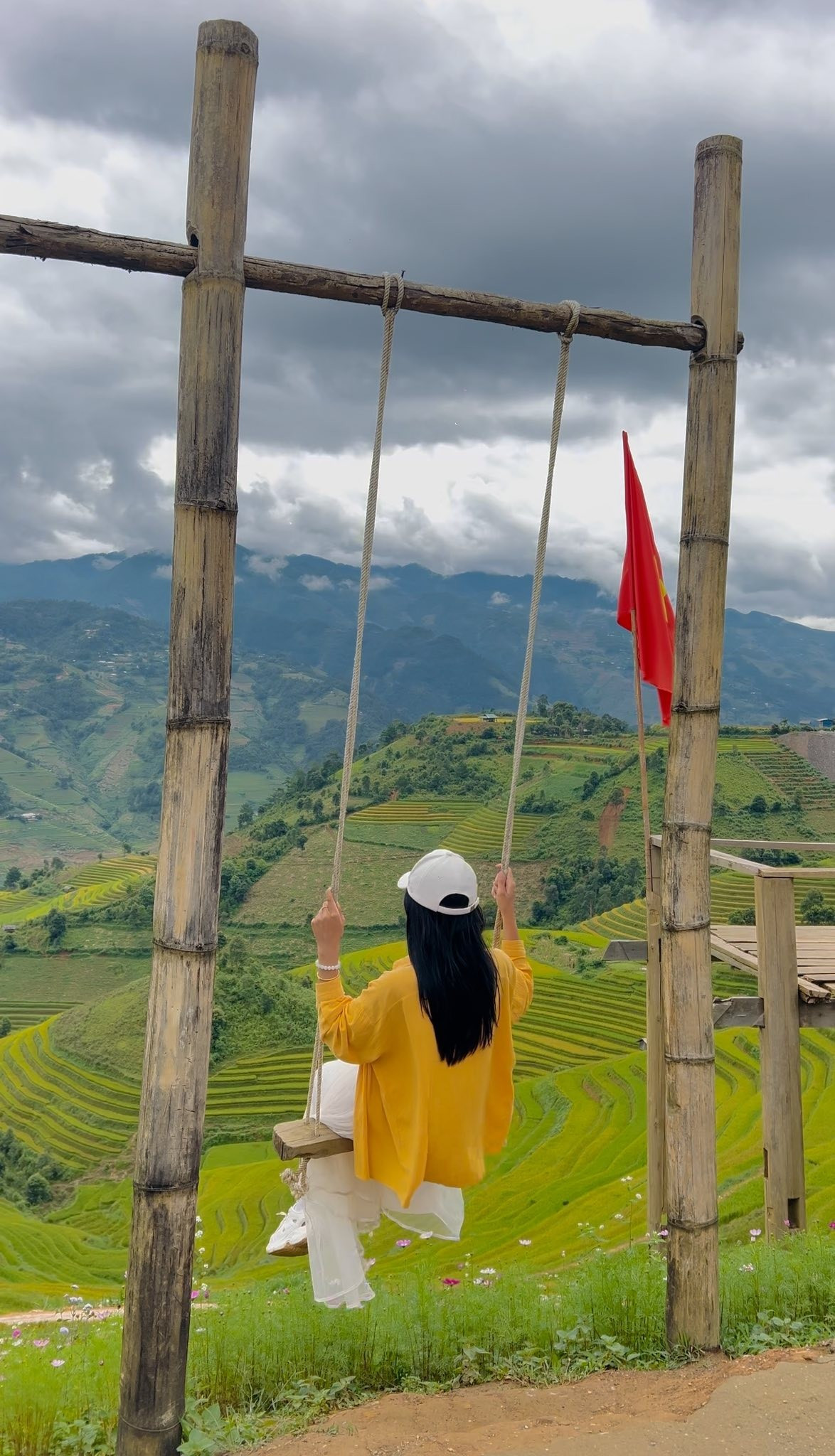 Immerse yourself in the majestic **natural beauty of Vietnam** at **Bản Kim Nọi Tây Bắc**. This captivating image showcases a traveler enjoying a serene **check-in** moment on a unique viewing platform, overlooking the lush green **Mù Cang Chải terraced fields**. These iconic rice paddies, winding gracefully like ribbons, offer a picturesque backdrop for **photographing terraced fields** and creating unforgettable memories. Discover this ideal **Vietnam travel destination** to experience the breathtaking **Tây Bắc** landscape and its unique cultural charm.
