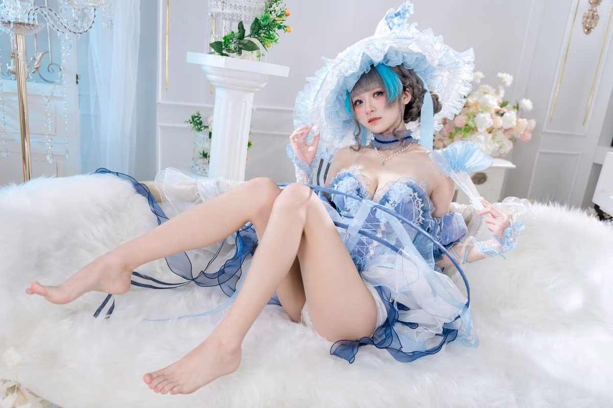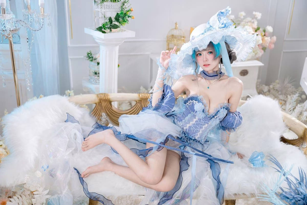 Immerse yourself in a fantasy realm with Coser Jiu Qi Miao embodying the captivating Cheshire Ice Snow. Adorned in an exquisitely detailed blue and white costume she emanates an ethereal and alluring beauty akin to an ice goddess. The flowing fabrics and intricate patterns reminiscent of frost and snow create a whimsical and dreamlike aura throughout the image. Her graceful pose on the plush white lounge further accentuates her majestic yet captivating allure. This is a masterful work of cosplay art showcasing meticulous attention to detail from the elaborate costume to the enchanting backdrop delivering a truly impressive visual experience.