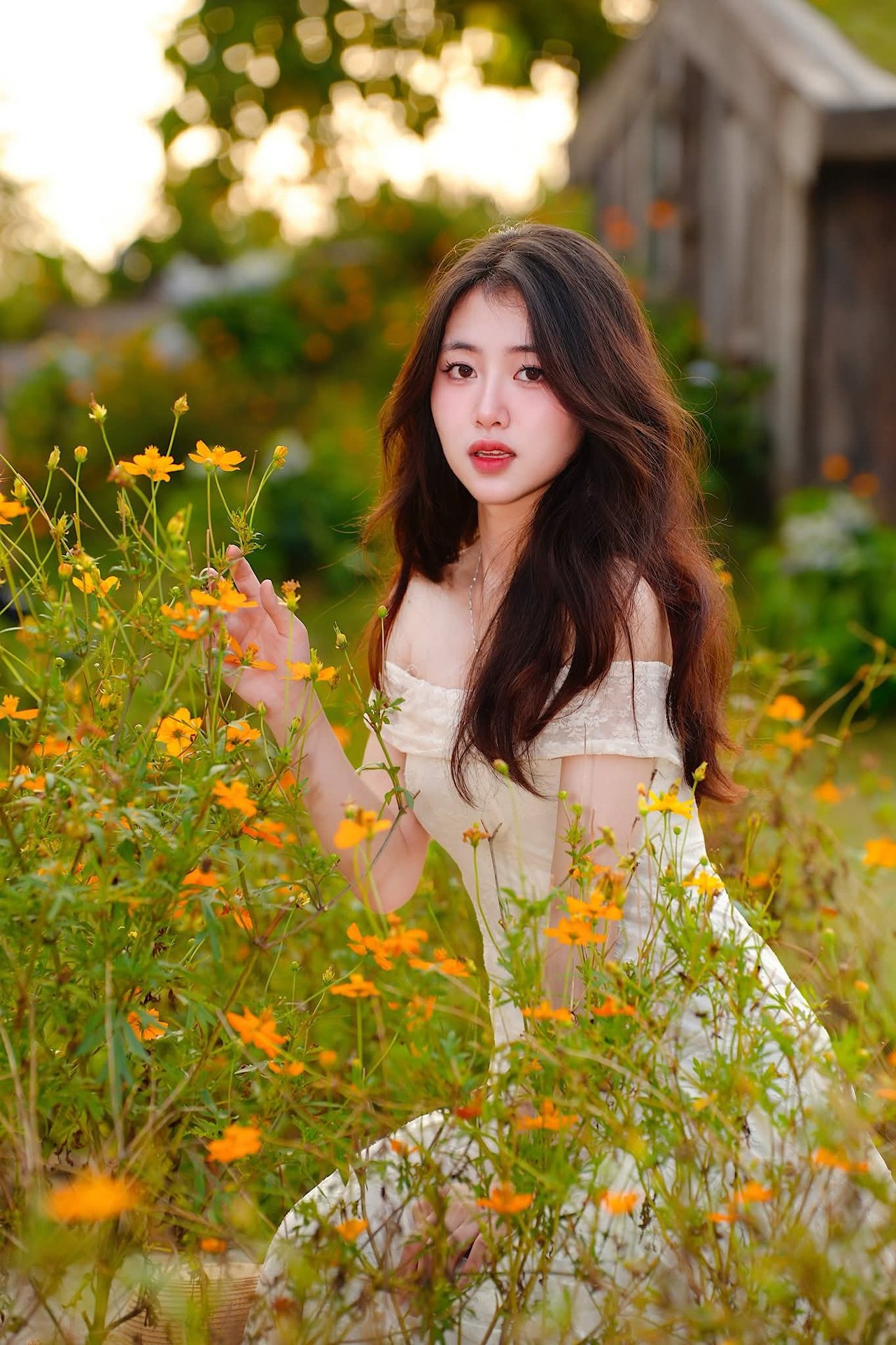 This image XVG No.2 captures the gentle and ethereal beauty of a Vietnamese girl amidst a space overflowing with vibrant flowers. She sits gracefully on a simple wooden chair in a pristine white off-shoulder dress with her long dark hair softly cascading. Her gaze is distant conveying a dreamy and peaceful aura as she delicately holds a small yellow flower. Surrounding her is a lush green landscape adorned with tiny orange and yellow blossoms creating a romantic and lively natural setting. This scene not only celebrates the traditional charm of Vietnamese women but also evokes a profound harmony between humanity and nature a truly captivating moment of tranquility.
