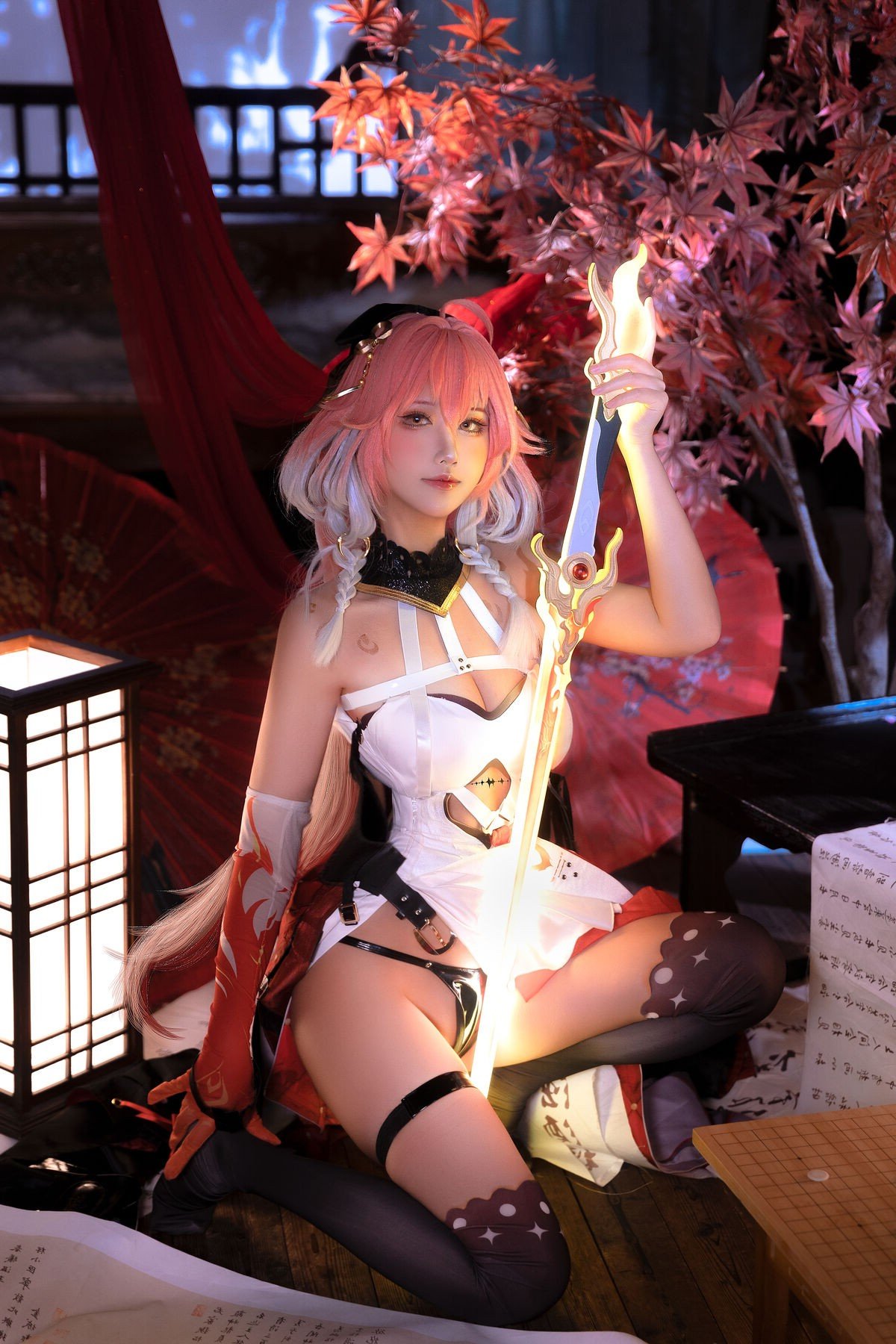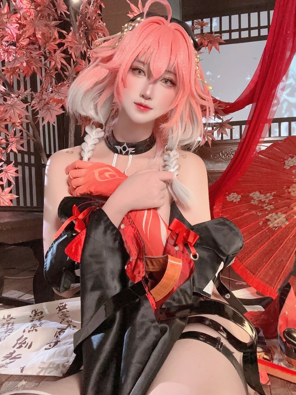 Coser San Du 69 masterfully embodies the character Changli from the game Wuthering Waves. The exquisite white and red costume paired with the striking pink hair brings Changli to life in a captivating way. The black stockings adorned with star patterns and the elegant red fan further enhance the unique beauty of this portrayal. San Du 69s alluring charm and confident demeanor are evident in every shot. She presents a version of Changli that is both powerful and graceful leaving viewers mesmerized. This is an impressive cosplay showcasing the cosers dedication and passion for her beloved character. Wuthering Waves fans and the gaming community will undoubtedly appreciate this stunning photo set.