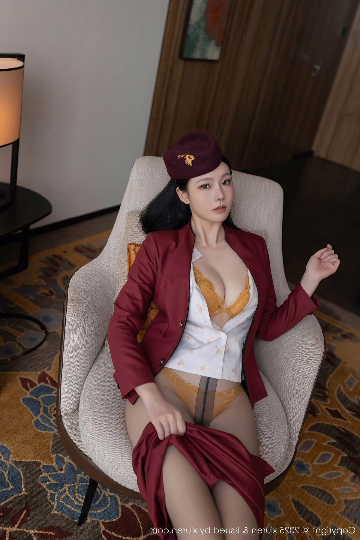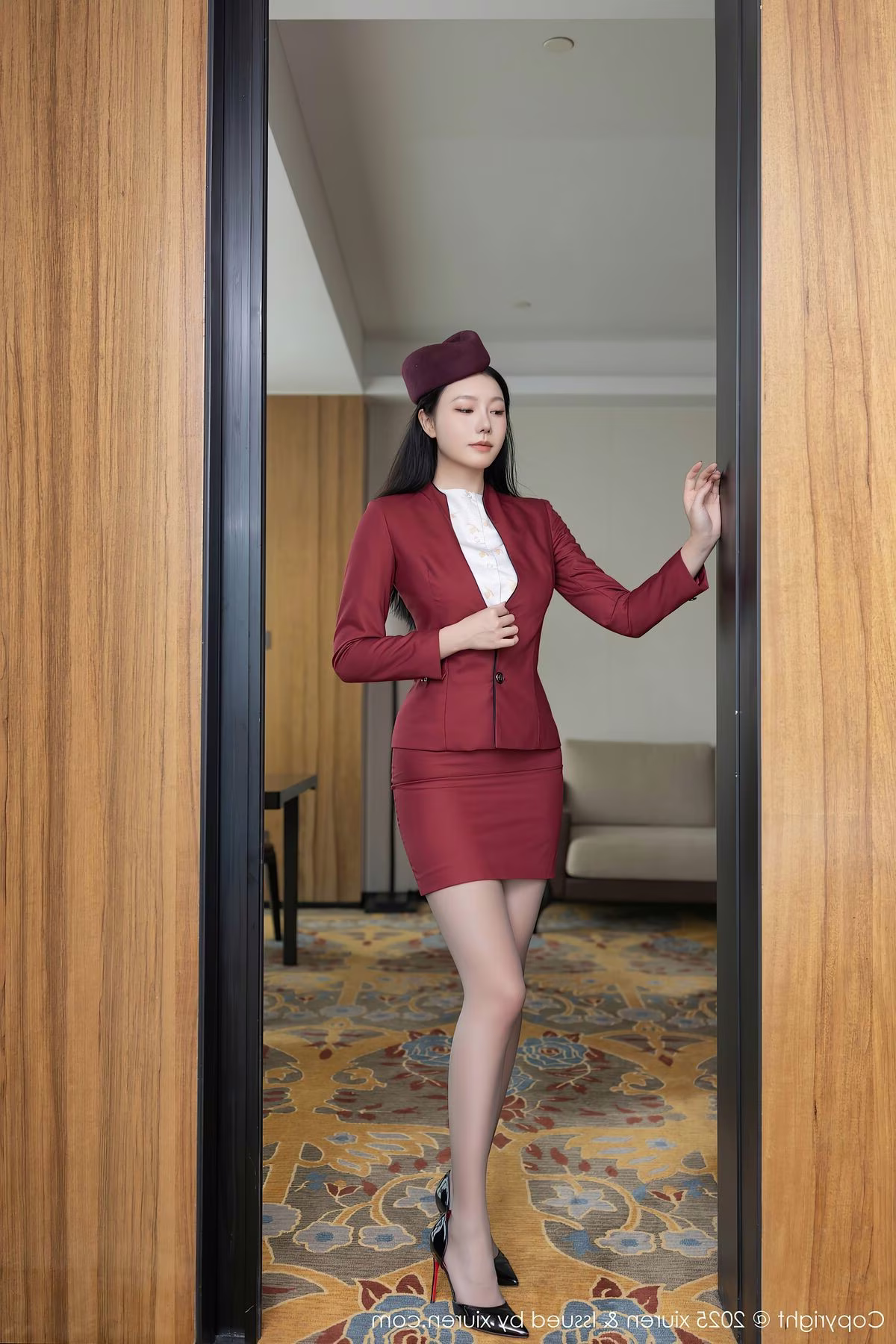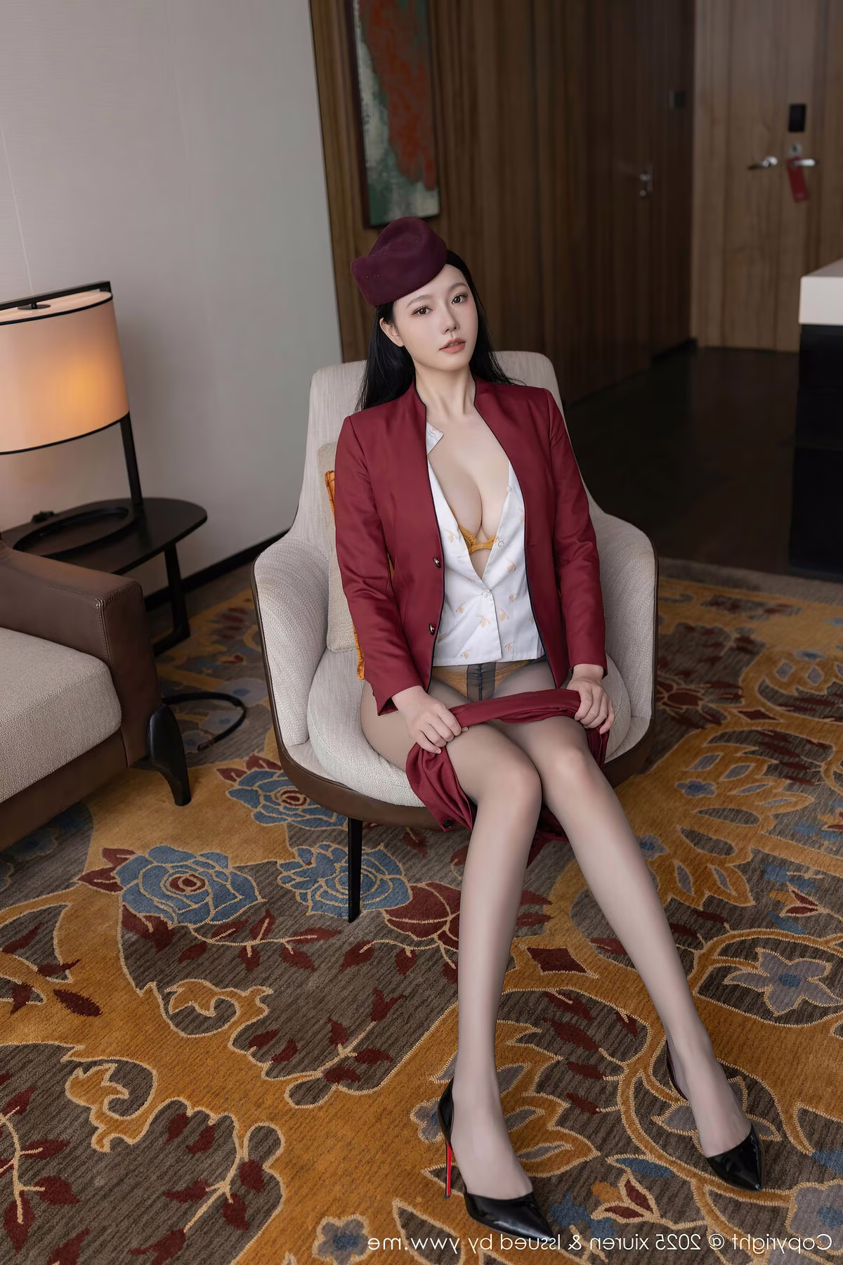 Discover the captivating beauty of An Ran in the stunning XiuRen No10333 photo collection An Ran showcases an elegant and alluring figure in an outfit inspired by a flight attendant uniform With a maroon jacket and short skirt paired with a matching hat she creates an image both professional and subtly sensual Her relaxed pose on the patterned carpet with red high heels placed nearby further enhances the mystery and appeal An Ran not only displays a unique fashion style but also exudes confidence and an enchanting aura This photo collection is sure to delight those who appreciate modern beauty and photographic sophistication