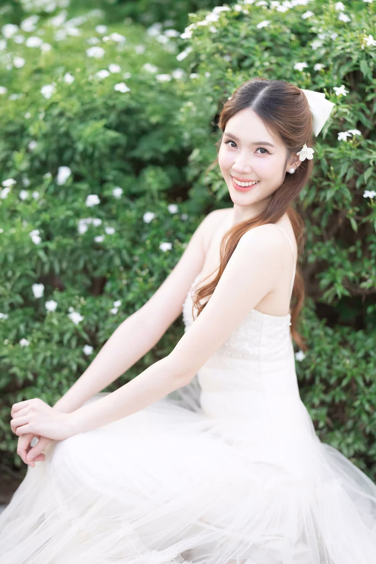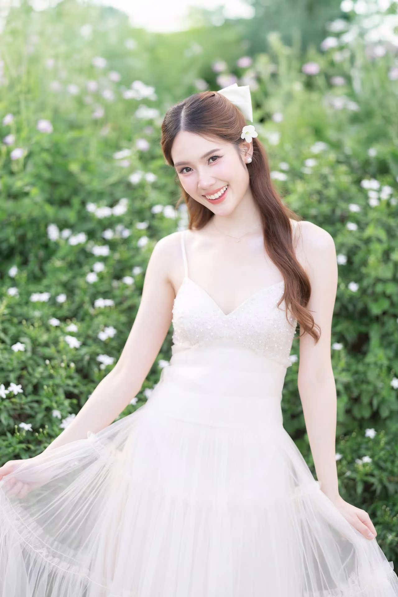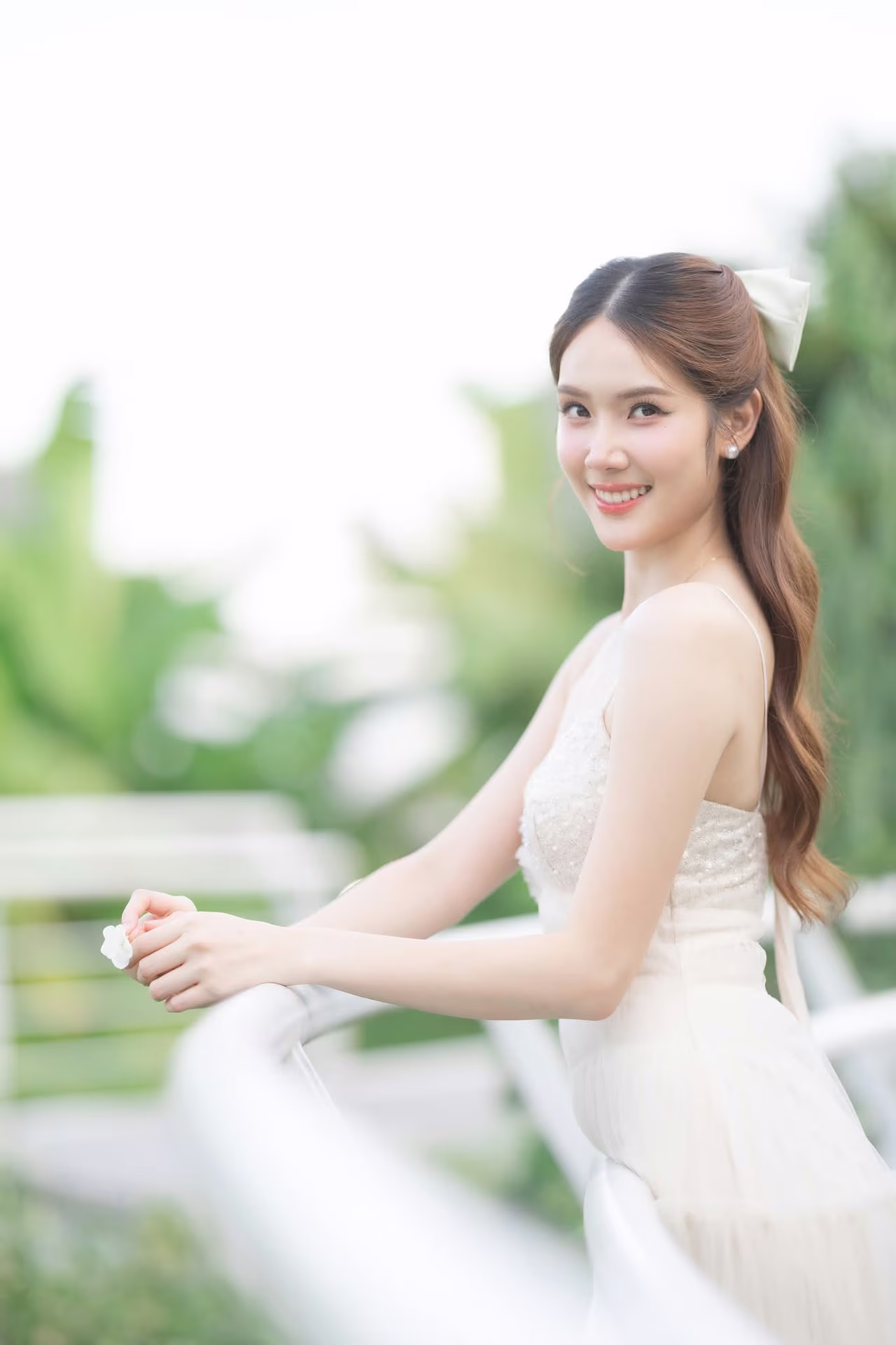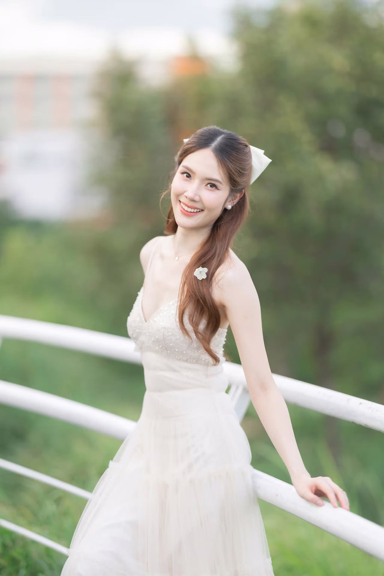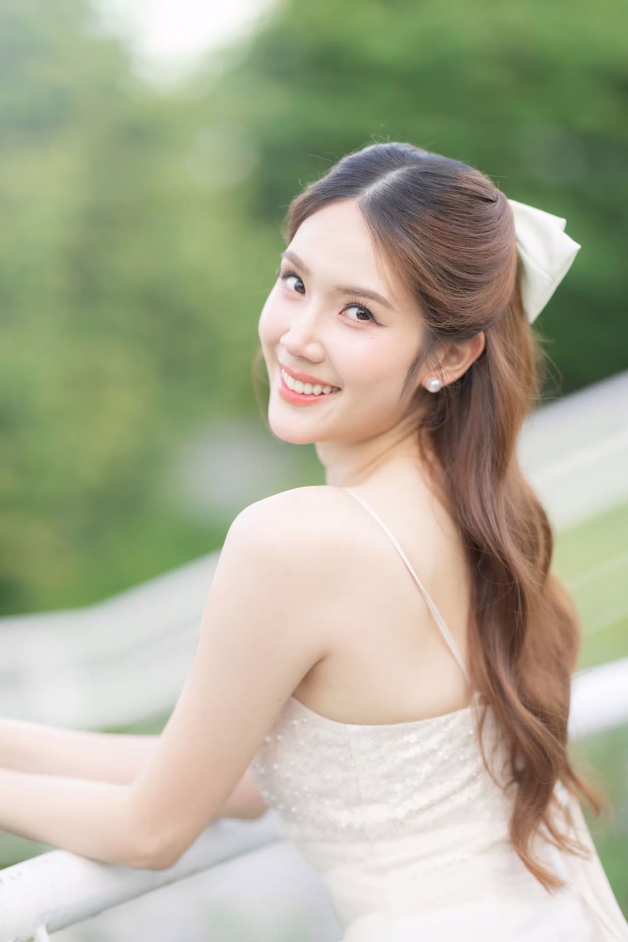XVG No.19: Radiant Bride: Beautiful Woman in Elegant White Gown with a Joyful Smile in Lush Green Setting.