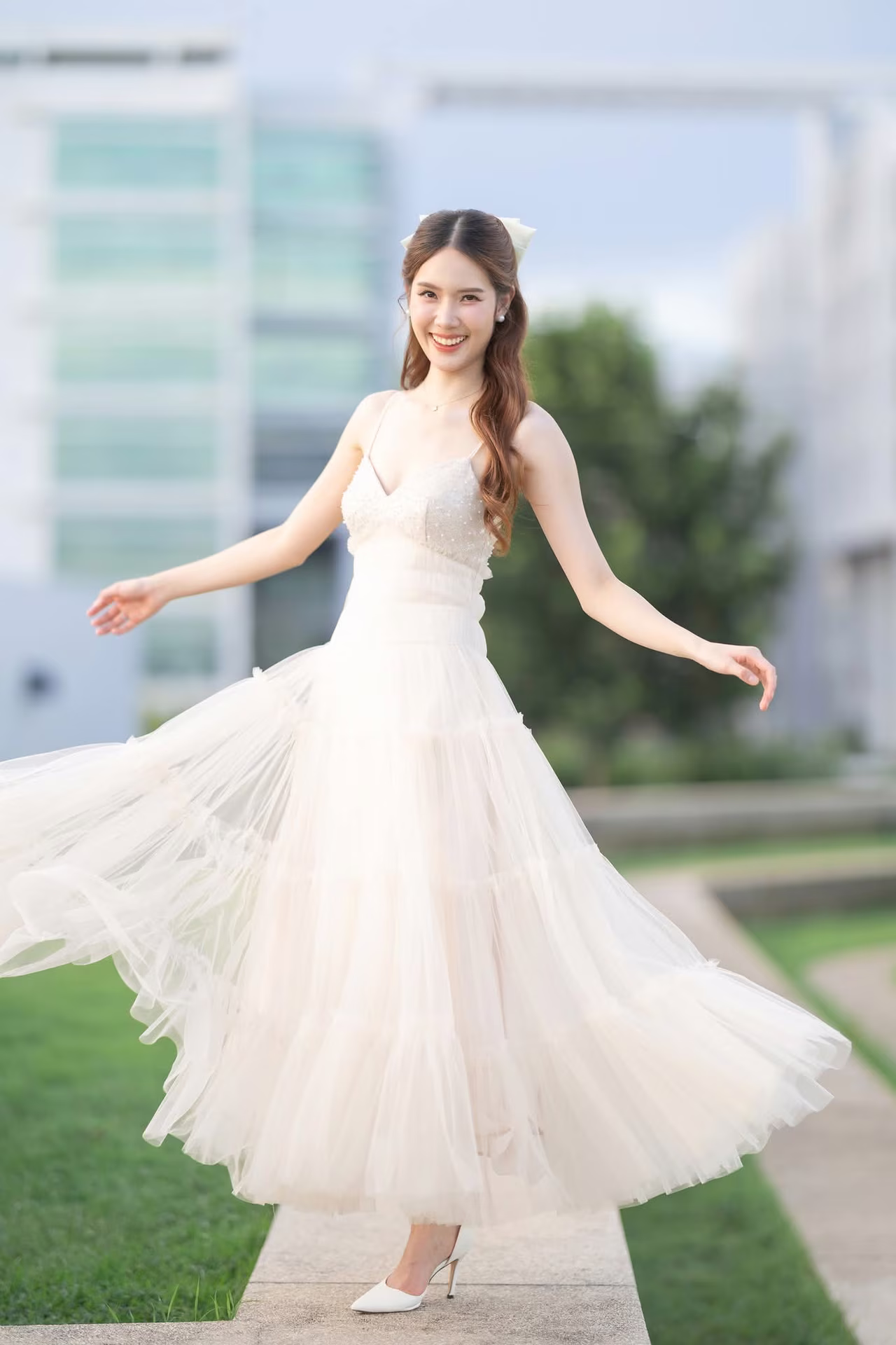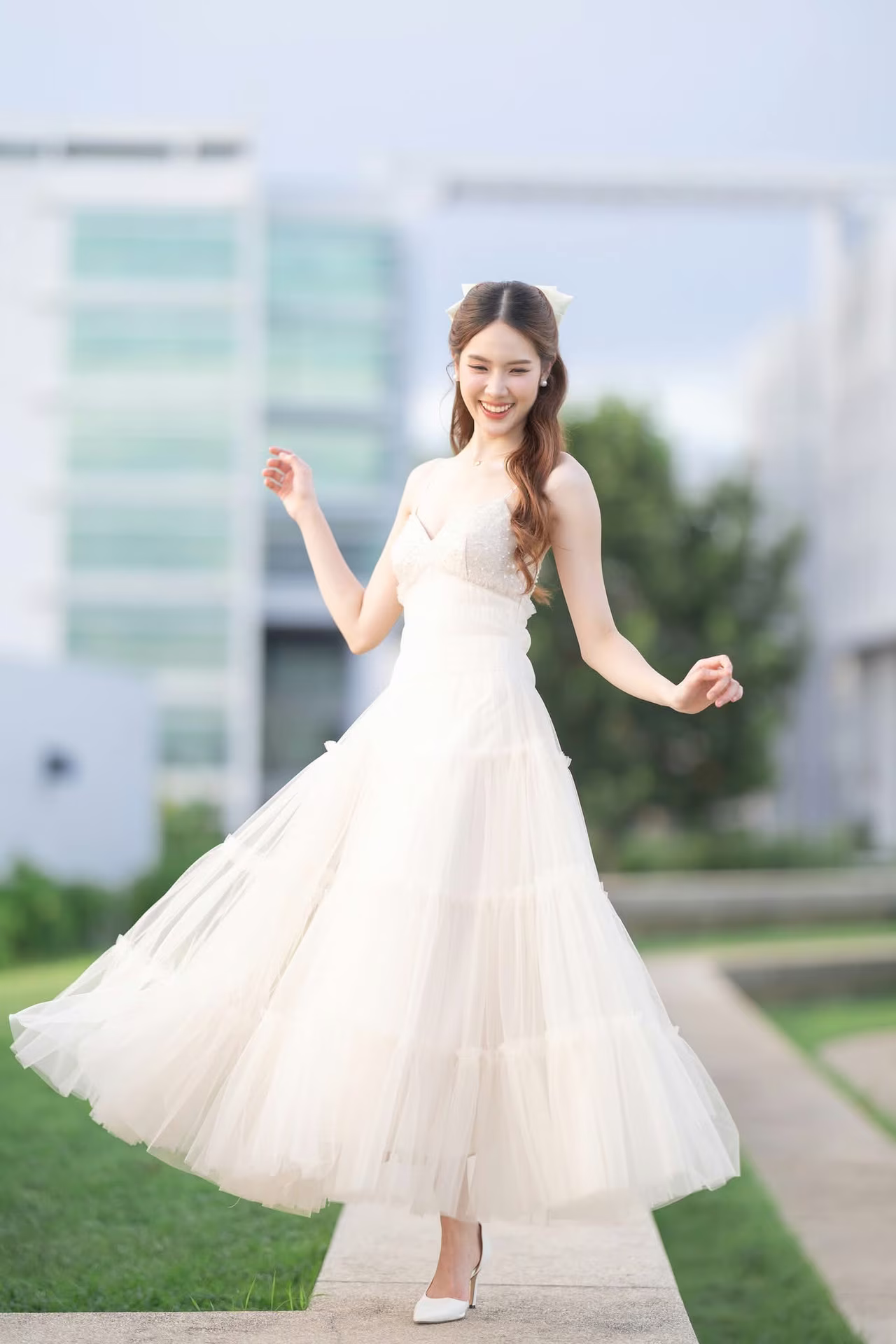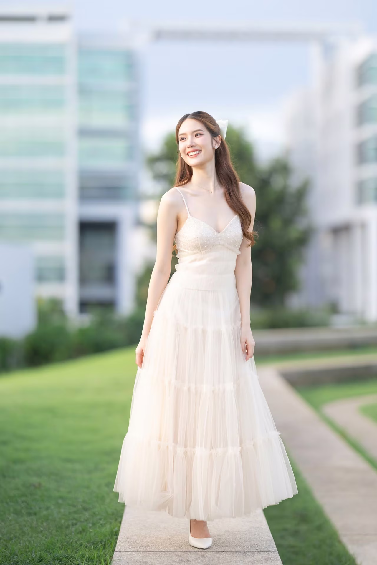 This captivating image captures a beautiful young woman in a flowing pristine white gown exuding an aura of elegance and grace Her long hair gently cascades as she gazes with a radiant joyful smile her eyes sparkling with happiness seemingly savoring every moment She stands gracefully amidst a lush green lawn under a serene sky creating a romantic and picturesque scene The natural light beautifully highlights her pure beauty and ethereal charm This photograph is more than just an image it is a narrative of joy new beginnings and the harmonious blend of natural beauty with the serene outdoor environment