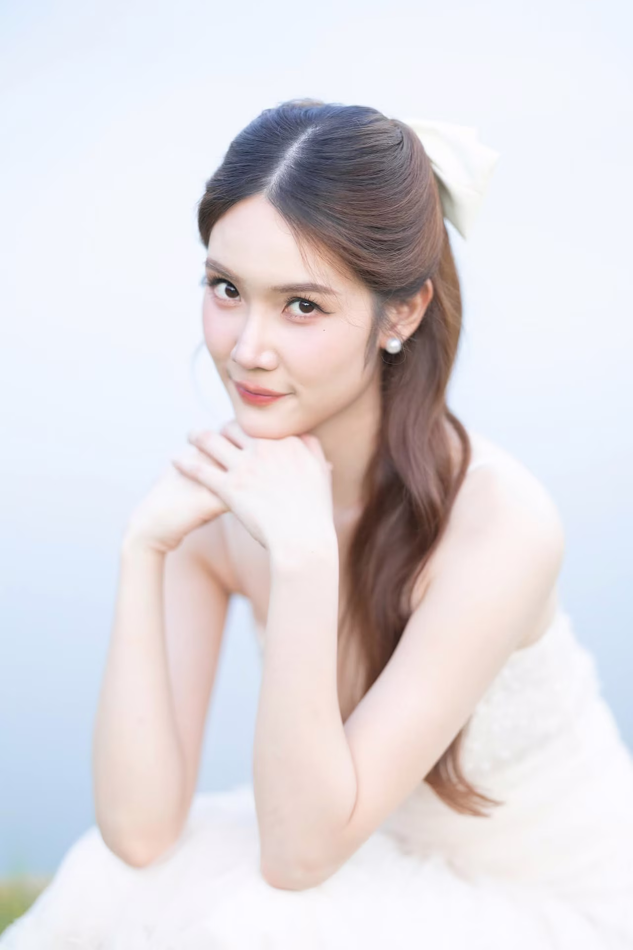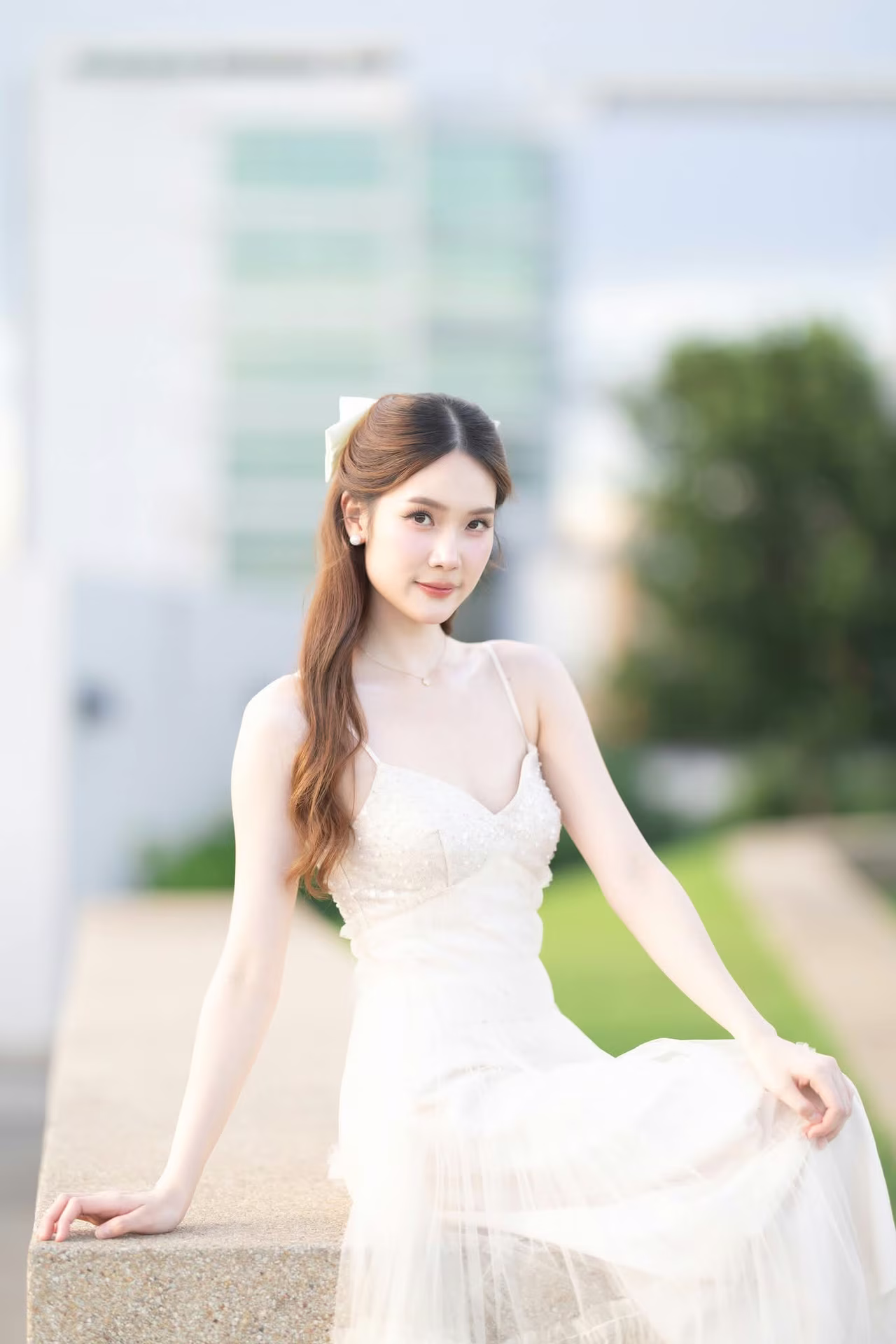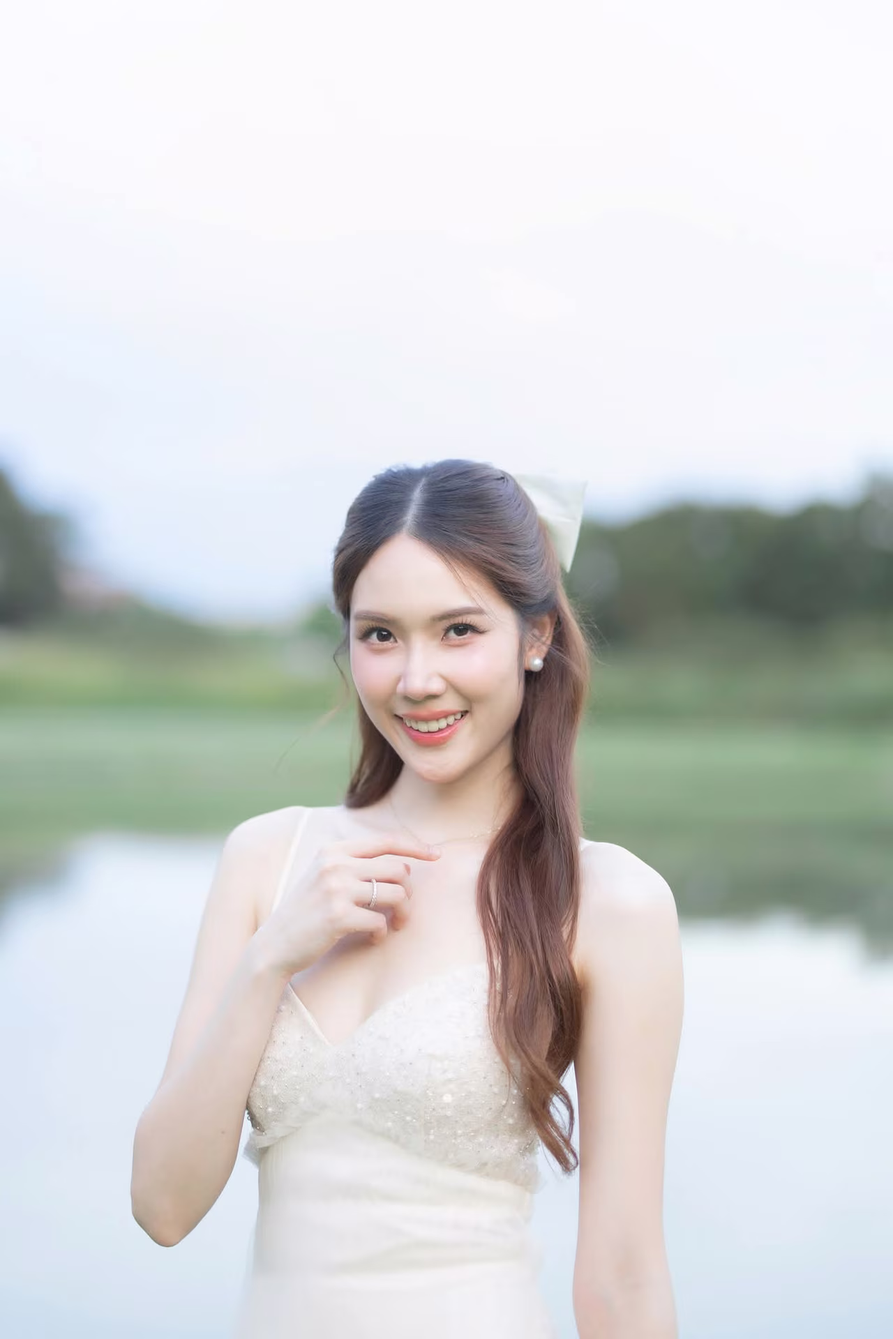 This captivating image captures a beautiful young woman in a flowing pristine white gown exuding an aura of elegance and grace Her long hair gently cascades as she gazes with a radiant joyful smile her eyes sparkling with happiness seemingly savoring every moment She stands gracefully amidst a lush green lawn under a serene sky creating a romantic and picturesque scene The natural light beautifully highlights her pure beauty and ethereal charm This photograph is more than just an image it is a narrative of joy new beginnings and the harmonious blend of natural beauty with the serene outdoor environment