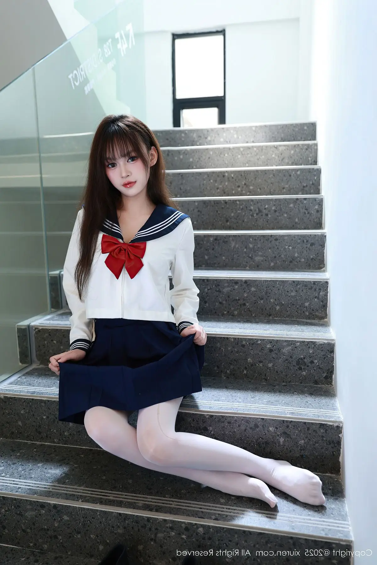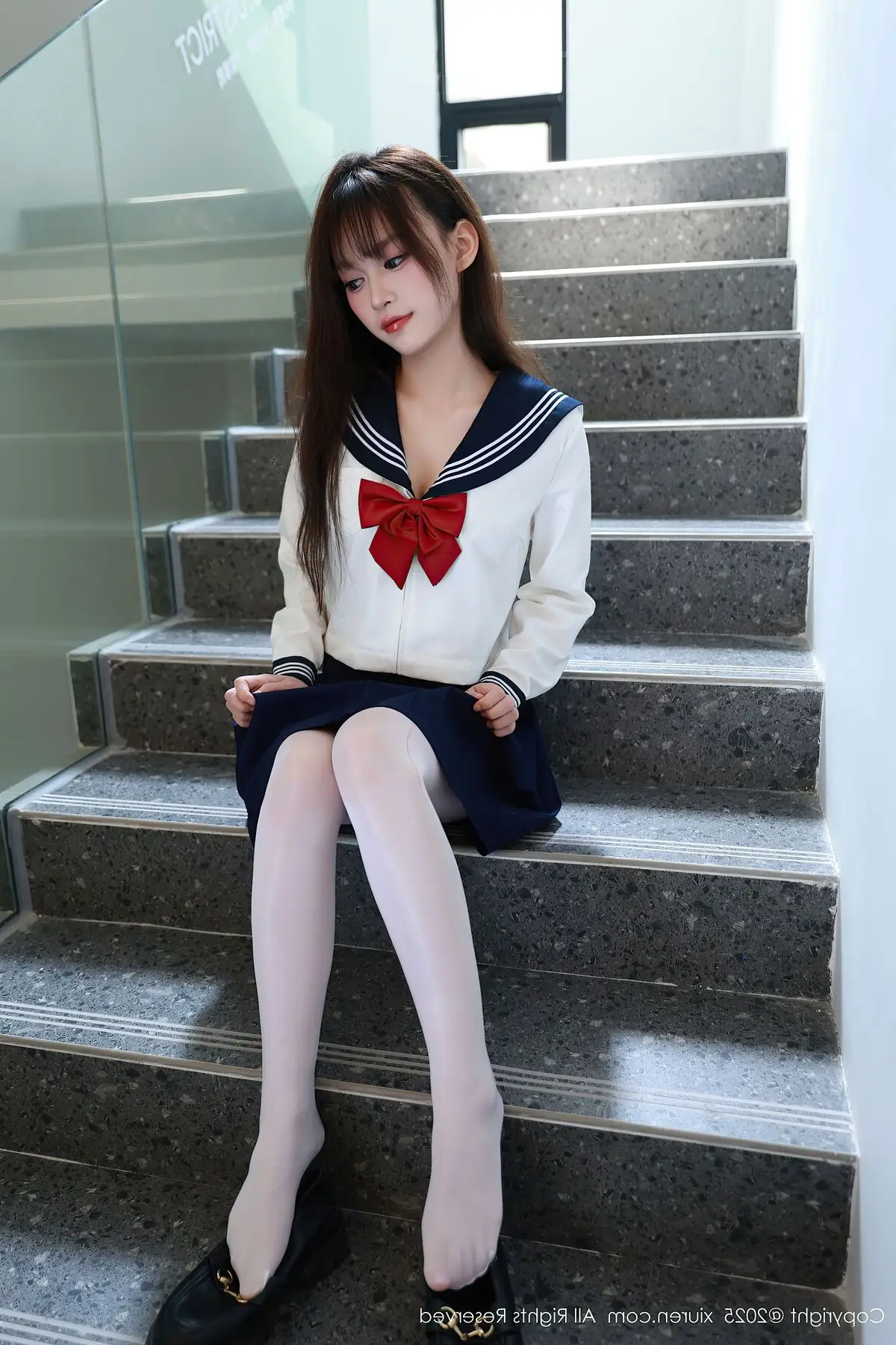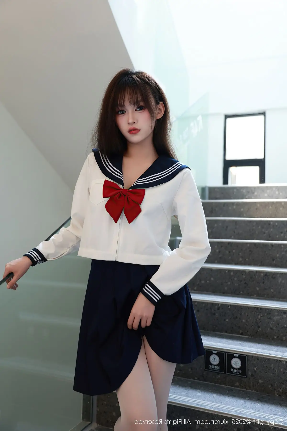 Nuo Mi, a rising star from XiuRen, shines brightly in her charming JK uniform. Her innocent beauty and confident demeanor bring an alluring photoshoot to life on the classic stone staircase, capturing a moment of youthful elegance. Every detail, from the vibrant red bow to the elegantly pleated skirt, is perfectly showcased by Nuo Mi, creating an image that is both sweet and distinctive. This exclusive XiuRen No.10458 collection is sure to delight fans of school uniform fashion and captivating model photography, offering a fresh perspective on a beloved style.