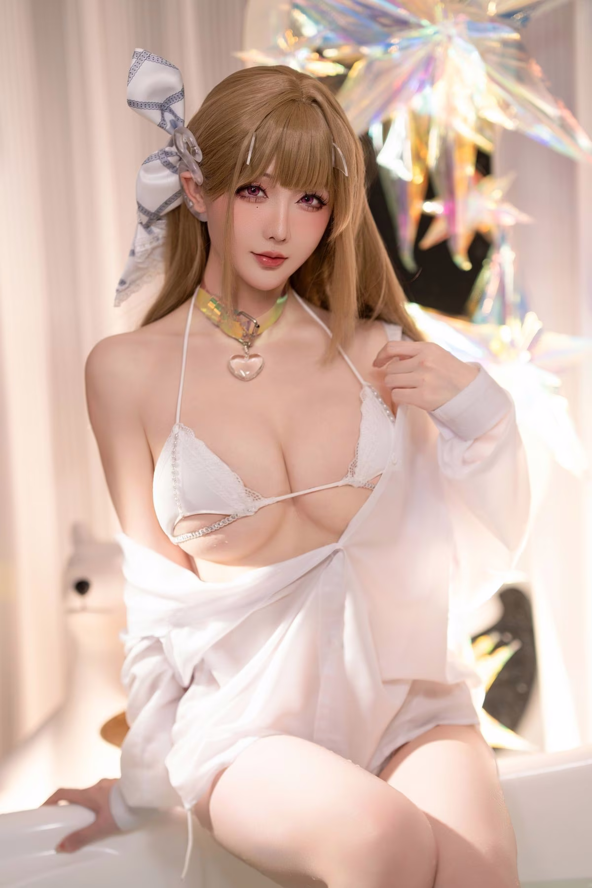 Dive into the captivating world of Coser Hoshilily as she embodies the NIKKE Viper character in a stunning swimsuit. Hoshilily flawlessly brings the character to life showcasing her alluring beauty and confident demeanor. With her flowing blonde hair and an elegant white bikini paired with a sheer cover-up she radiates charm in every frame. From her piercing gaze to the unique accessories like the delicate hair bow and intricate necklace every detail is meticulously crafted. This image not only highlights the dedication to cosplay but also portrays Hoshilily as a vibrant and enchanting figure promising an unforgettable visual experience for fans.#Coser #Hoshilily #Viper #Swimsuit #Cosplay #Model