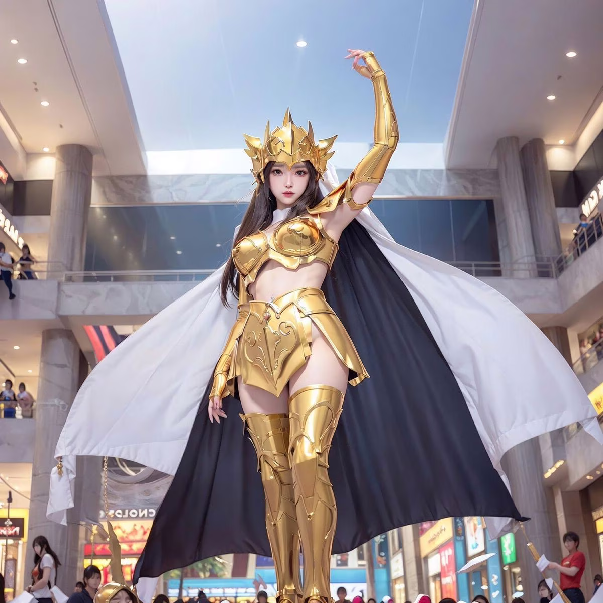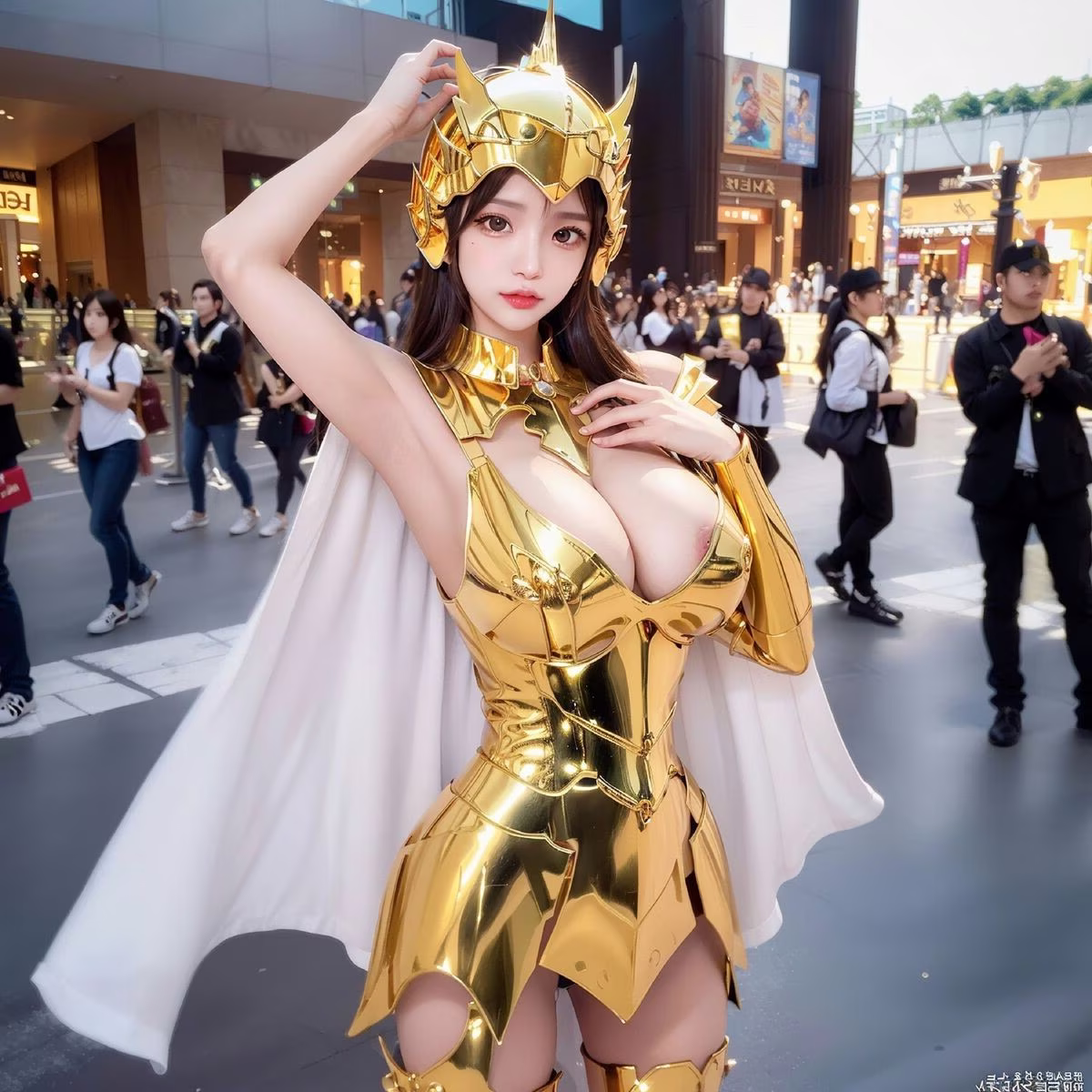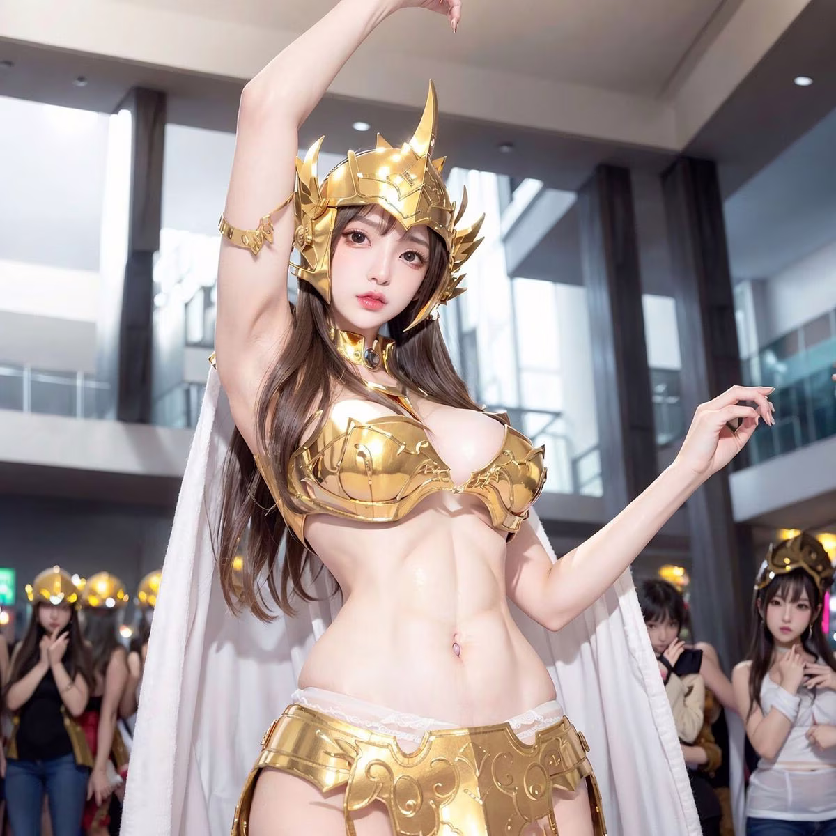 This stunning image portrays a Golden Saintess, exuding regal beauty and latent power. She is adorned in a shimmering intricately designed golden armor that reflects light brilliantly evoking the image of a mythical warrior from the Saint Seiya saga. The golden helmet and flowing white cape further enhance her majestic and noble appearance. Her confident resolute gaze and poised stance convey bravery and a steadfast determination to uphold justice. The realistic style of the photograph offers a vivid experience as if this Golden Saintess is present right before our eyes ready for any challenge.#SaintSeiya #Golden #Saintess #Cosplay #Female #Warrior #Realistic