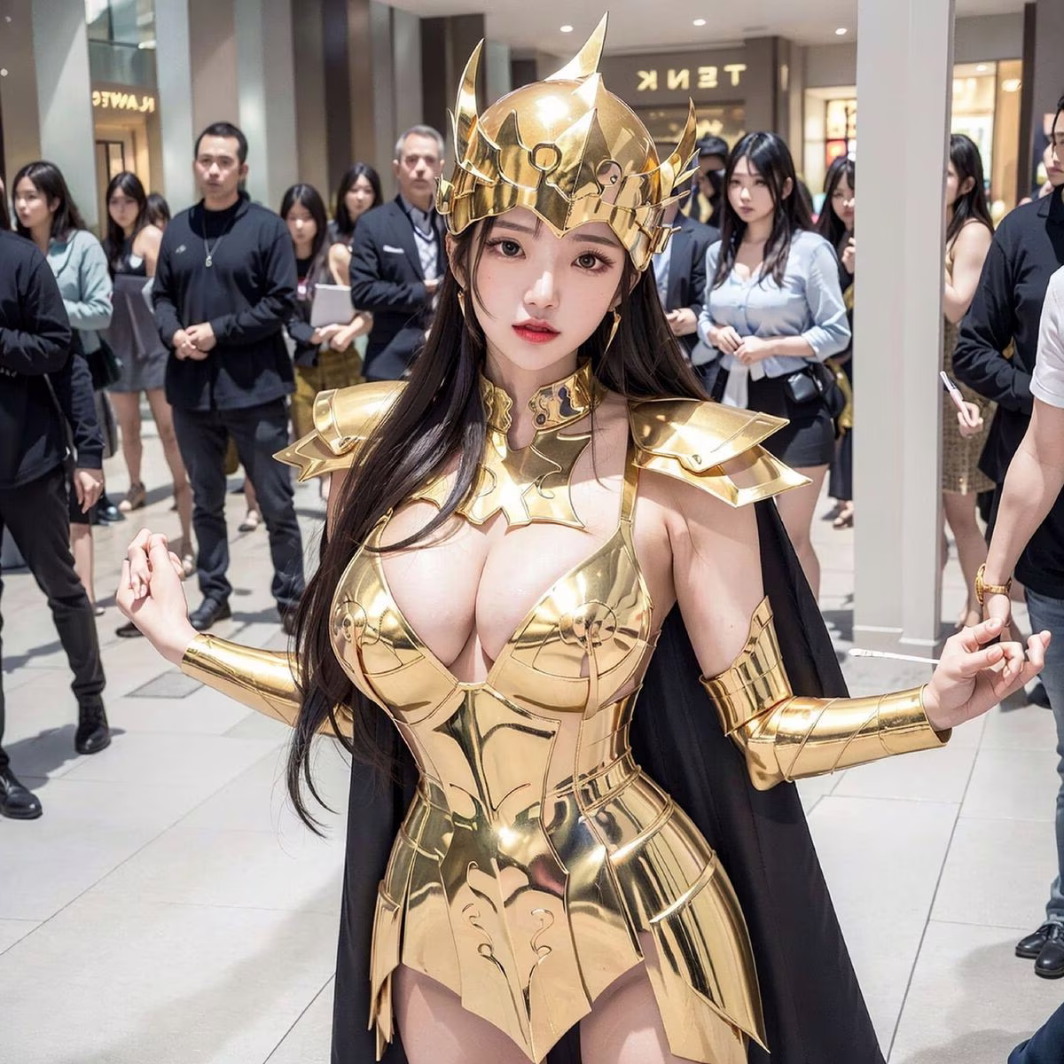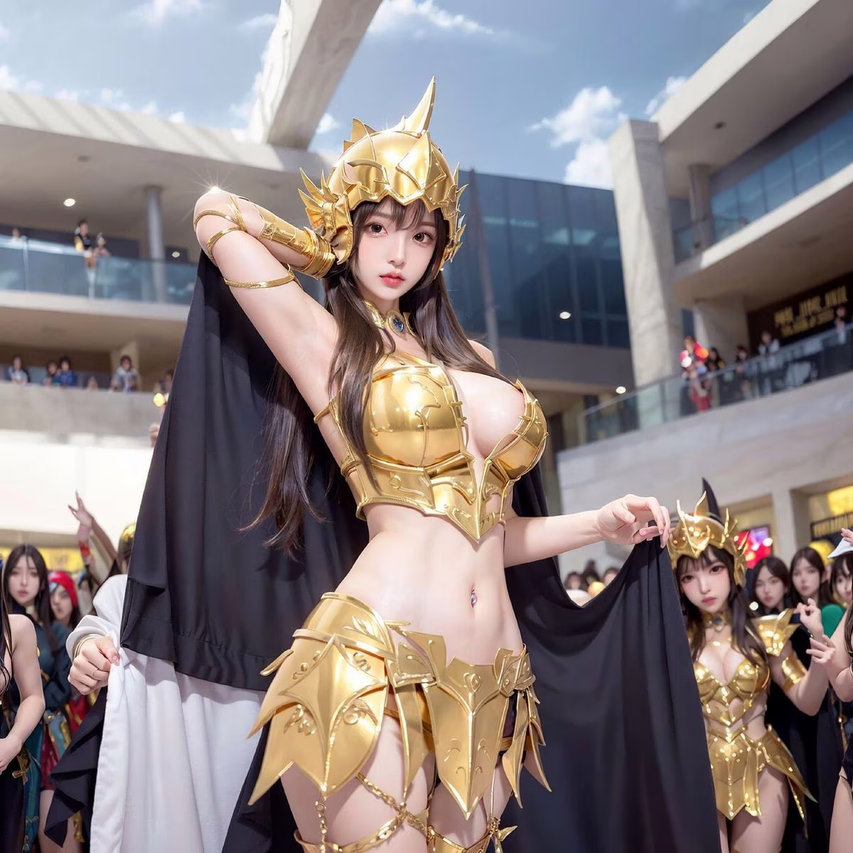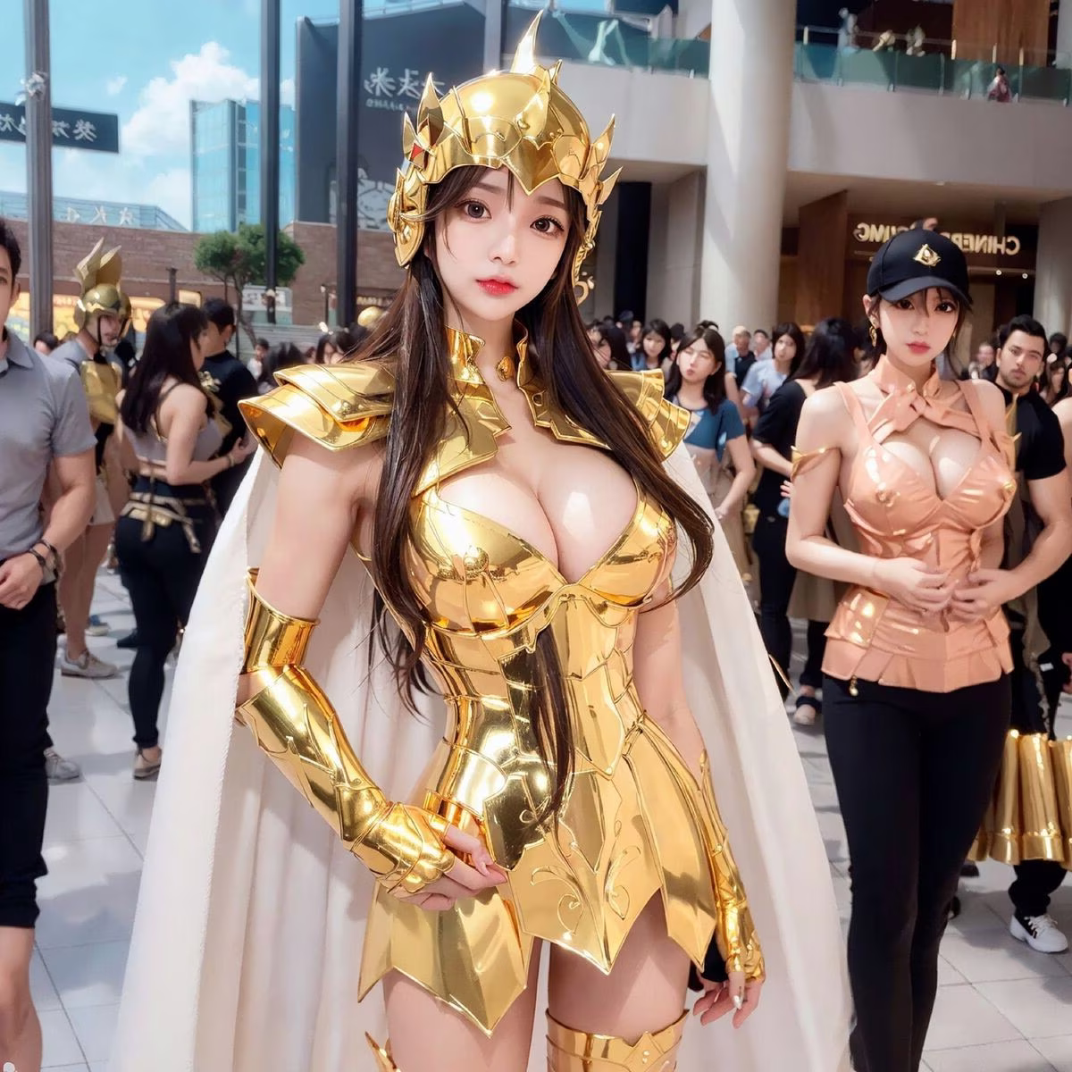 This stunning image portrays a Golden Saintess, exuding regal beauty and latent power. She is adorned in a shimmering intricately designed golden armor that reflects light brilliantly evoking the image of a mythical warrior from the Saint Seiya saga. The golden helmet and flowing white cape further enhance her majestic and noble appearance. Her confident resolute gaze and poised stance convey bravery and a steadfast determination to uphold justice. The realistic style of the photograph offers a vivid experience as if this Golden Saintess is present right before our eyes ready for any challenge.#SaintSeiya #Golden #Saintess #Cosplay #Female #Warrior #Realistic