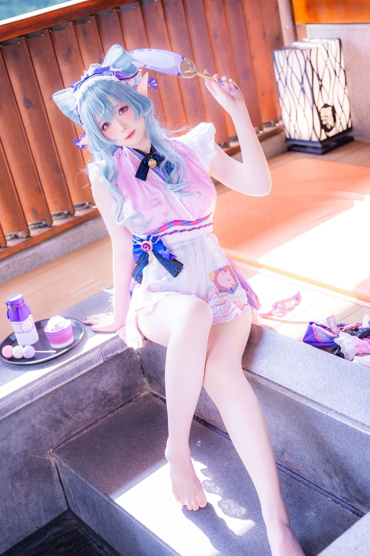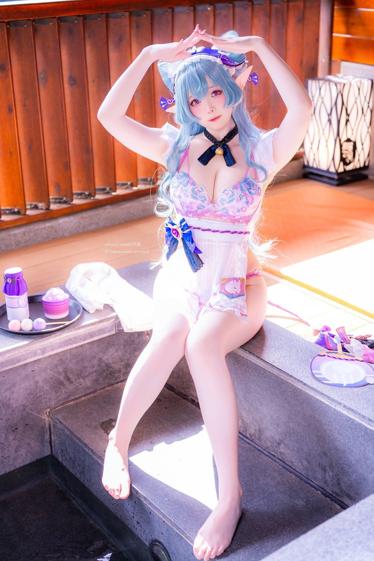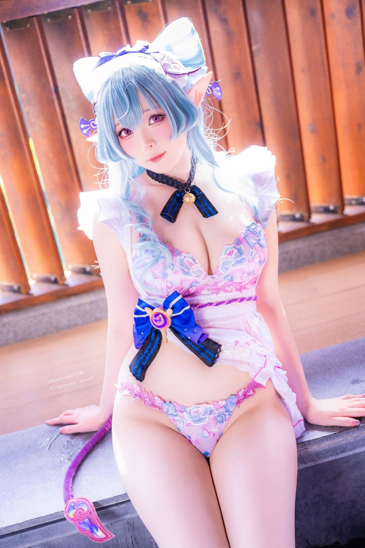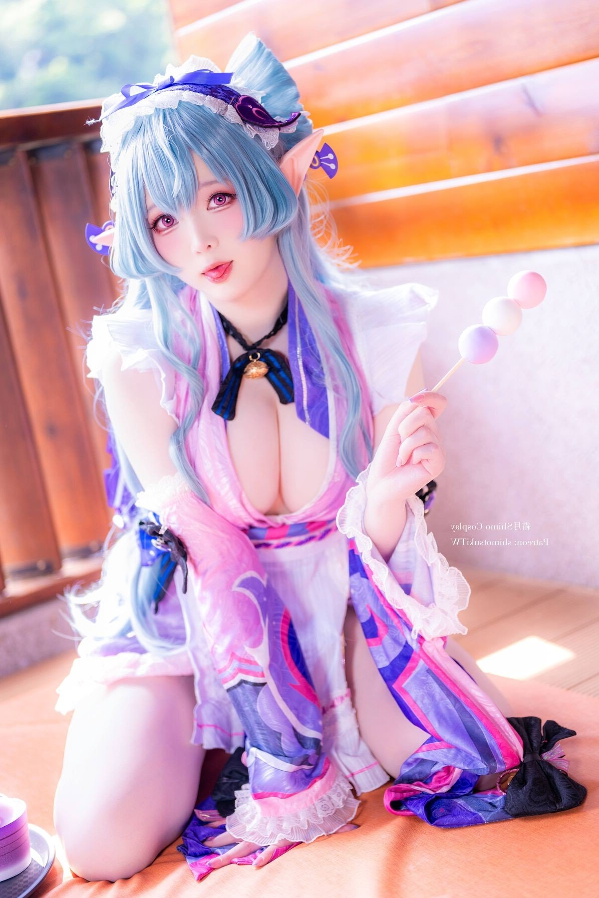 In this enchanting photograph coser Shimo Tsukigami masterfully embodies the character Yumemizuki Mizuki radiating a sweet and charming appeal. Her flowing pastel blue hair and playful elf ears give her an ethereal aura. The stylized maid outfit in soft pink white and blue creates a harmonious and captivating visual. Meticulously detailed bows and ruffles further enhance her innocent and delicate appearance. Seated in a cozy setting reminiscent of traditional Japanese aesthetics Shimo Tsukigami appears as a muse stepping out of a fairytale. This image not only showcases exceptional cosplay talent but also conveys a sense of joy and dreaminess. It is a stunning piece of cosplay art perfect for fans of kawaii aesthetics and adorable characters.