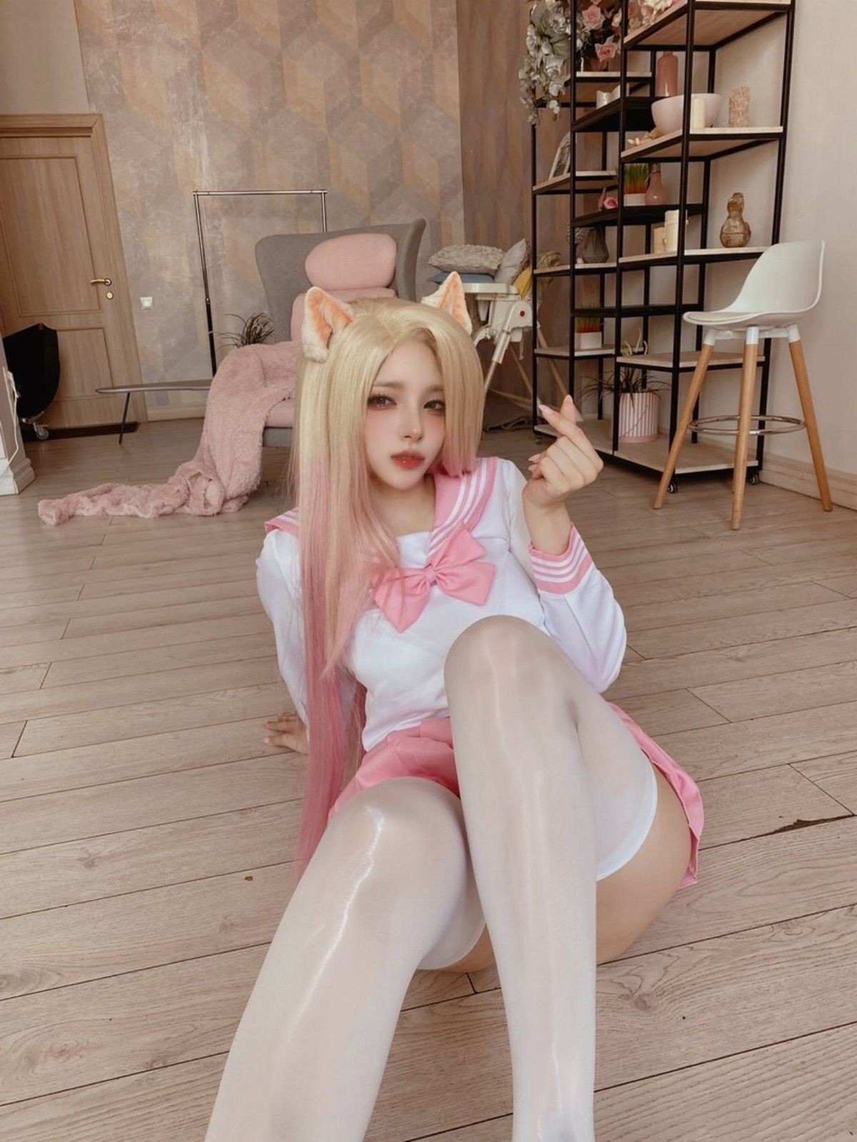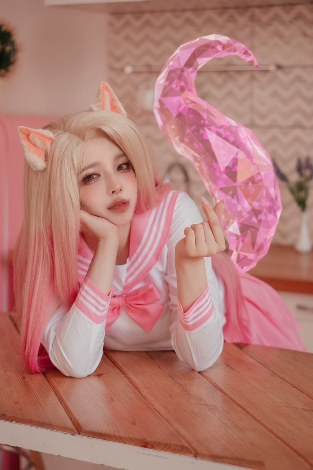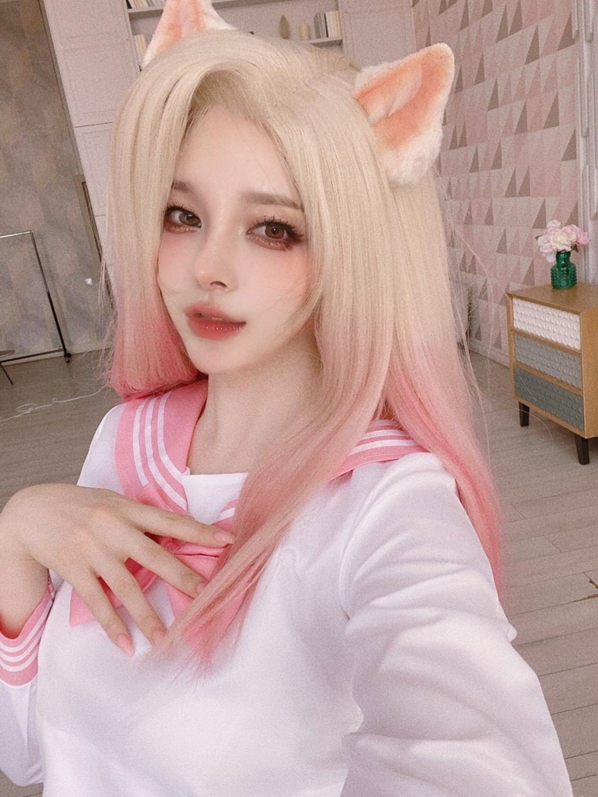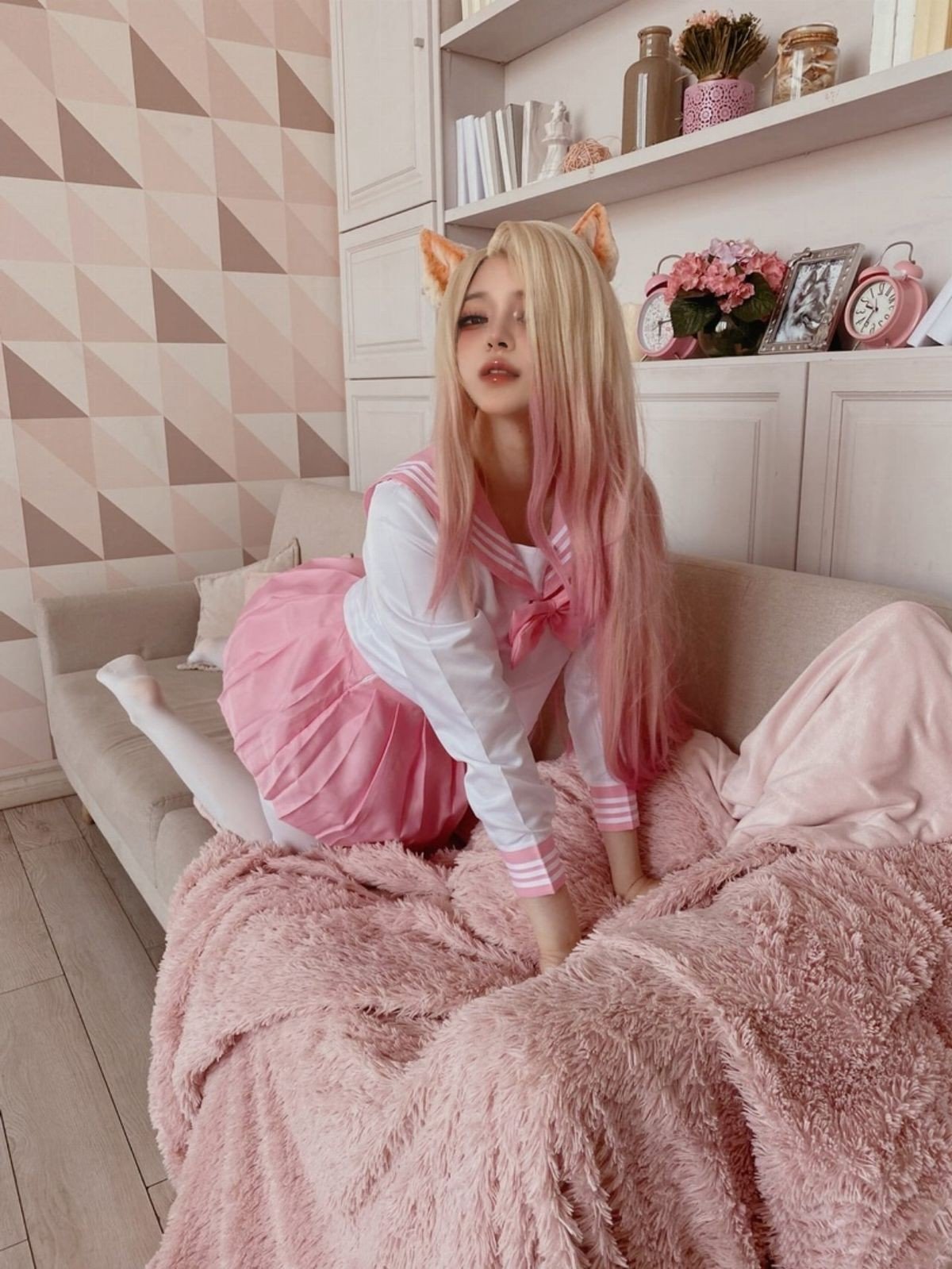This stunning image captures cosplayer Bao Zou Li Yu Wang embodying Yae Miko from Genshin Impact. With her distinctive pink hair and delicate fox ears she exudes an elegant and mystical beauty. The meticulously designed traditional red and white costume accentuates her graceful figure. The character sits charmingly on a tree branch amidst a backdrop of blooming cherry blossoms creating a poetic scene. Gentle sunlight filters through the petals highlighting the intricate details of the cosplay and the captivating aura of the cosplayer. The photograph not only showcases the elaborate effort put into the costume but also successfully conveys the essence of Yae Miko amidst beautiful nature. This is part of the 12月合集 Part10 collection offering an enchanting visual experience.