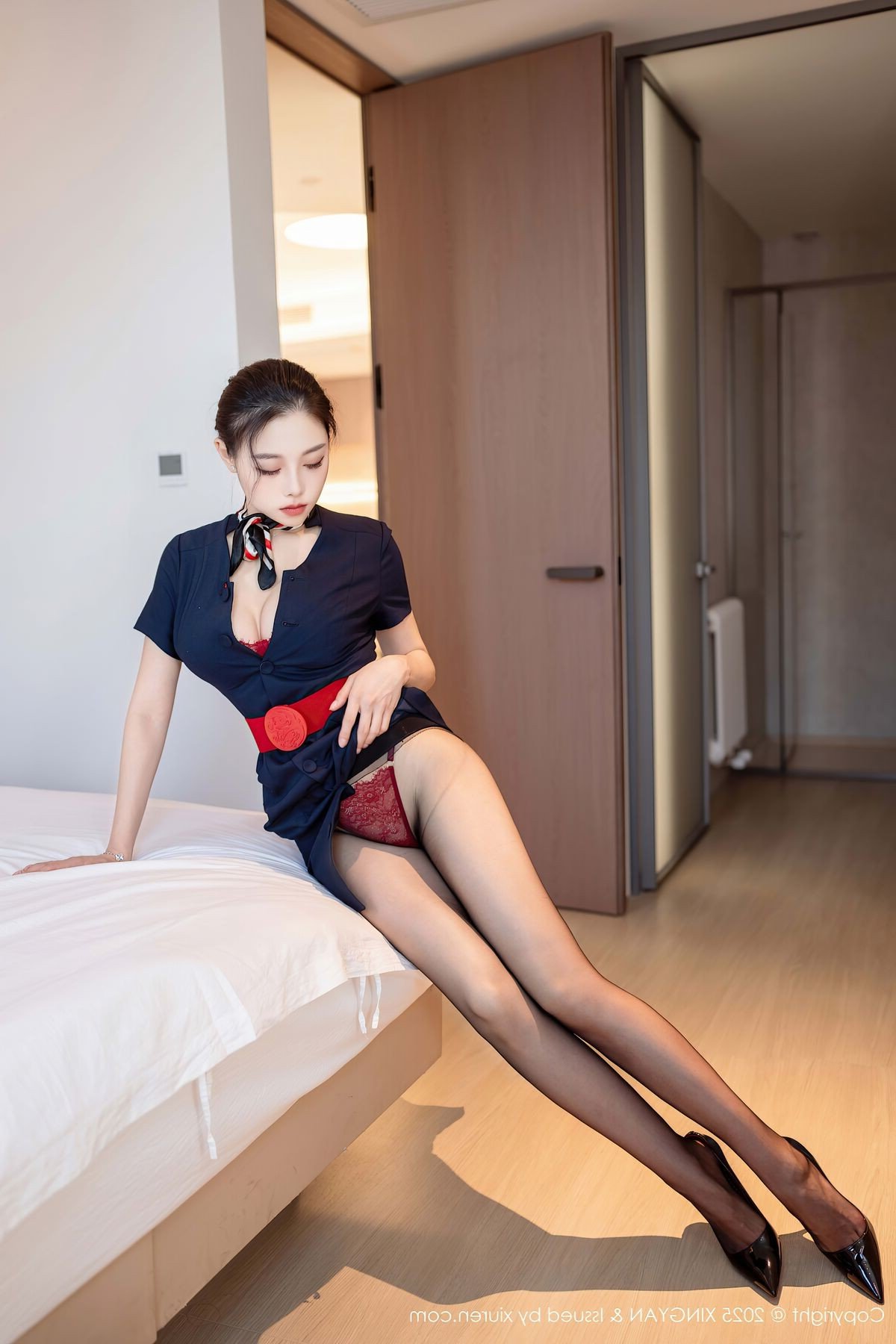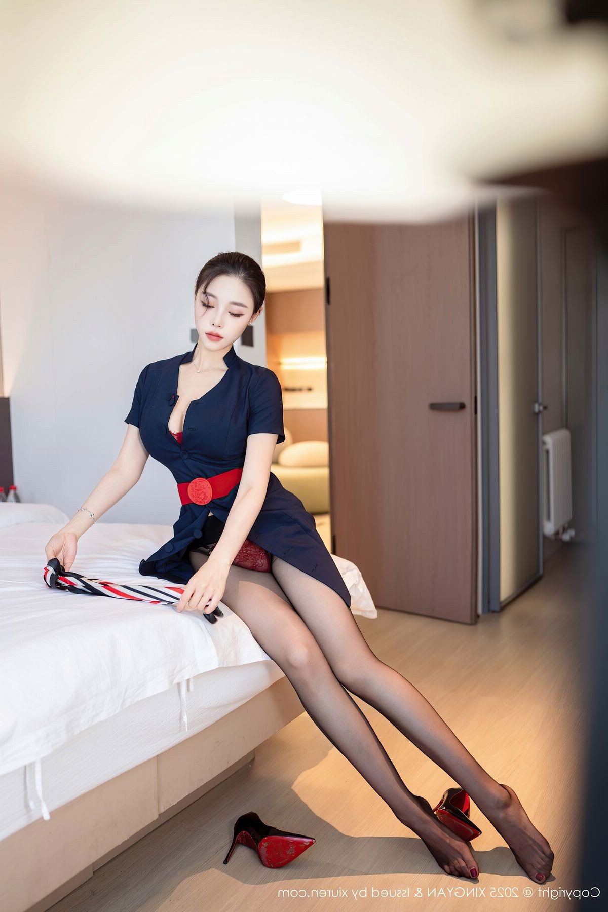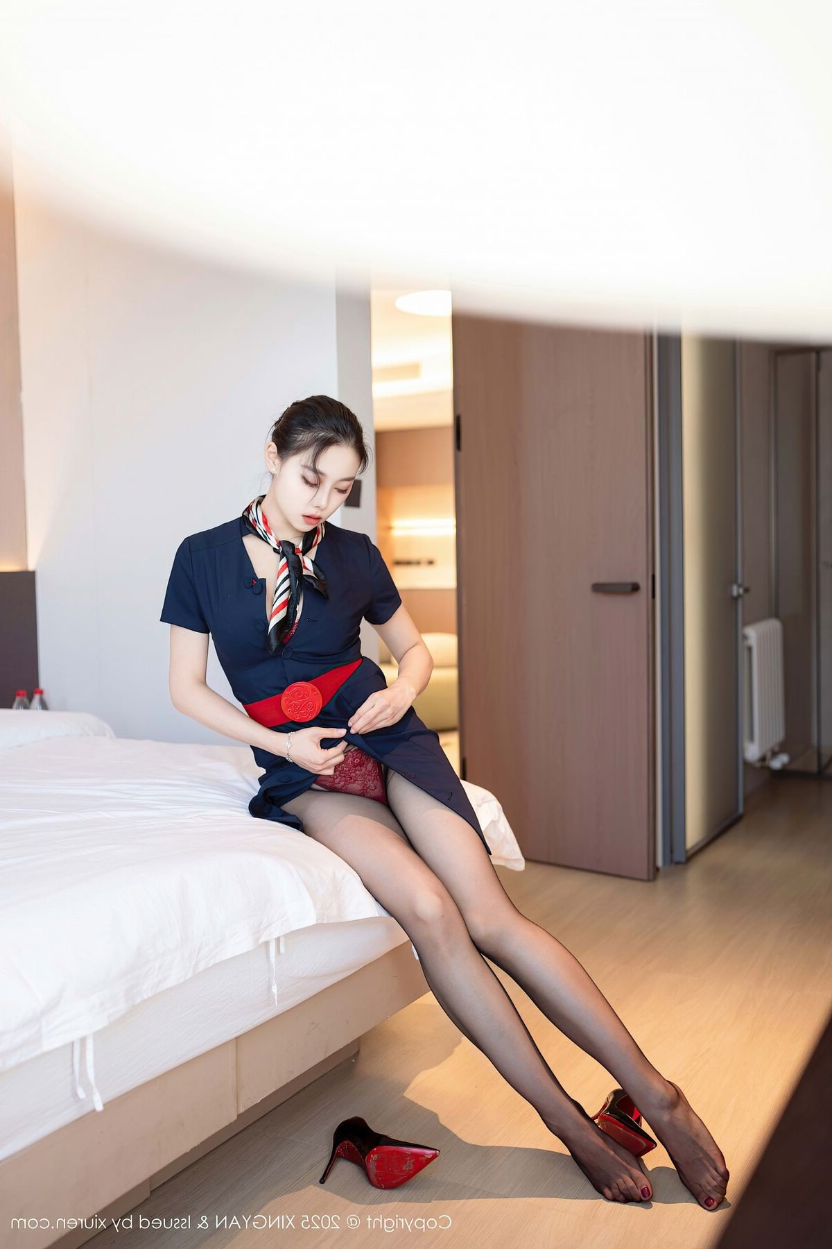In this image Qing Miao appears elegantly alluring in a dark blue flight attendant uniform. The striking red belt creates a perfect accent for her attire. She sits gracefully and confidently on the floor next to a pristine white bed. Her long legs accentuated by sheer black stockings and high heels create an incredibly captivating look. Her gaze directly engages the viewer exuding confidence and professionalism. The overall photograph harmoniously combines physical beauty with sartorial elegance highlighting the image of a modern flight attendant who is sophisticated and utterly charming. This is part of the XingYan Vol354 collection showcasing her distinctive style.