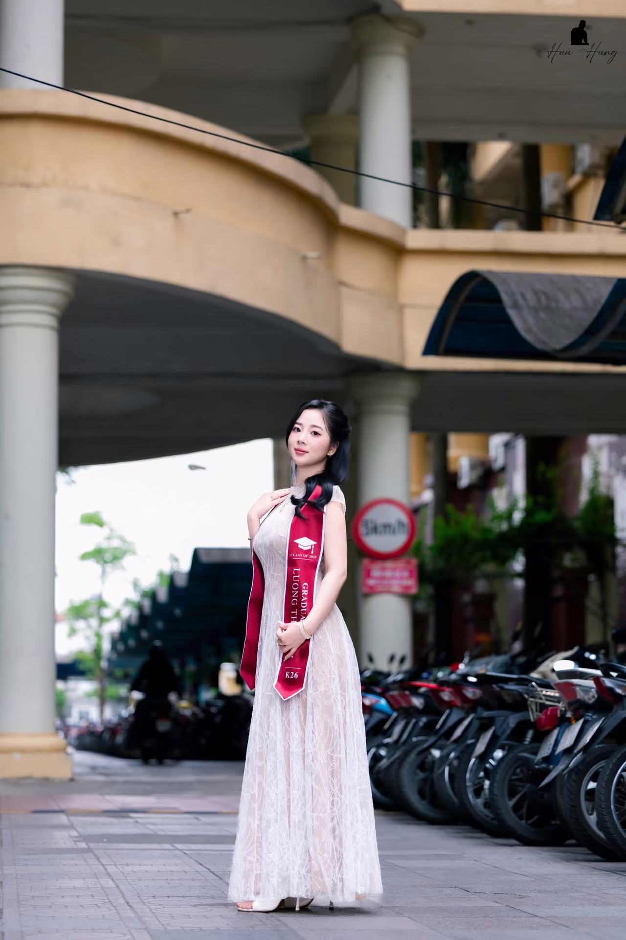 This stunning photograph captures a graceful Vietnamese female student exuding elegance and intellect Adorned in a beautiful dress and an honorary sash from HUBT the young woman confidently showcases her beauty marking a significant milestone in her academic journey Her radiant eyes and gentle smile convey pride and maturity after years of diligent study She stands not only as a symbol of Vietnams dynamic young intellectual generation but also as an inspiration for continuous effort This image disseminates a message of success the beauty of knowledge and hope for a bright future A memorable moment celebrating the beauty of a Vietnamese woman on her momentous day