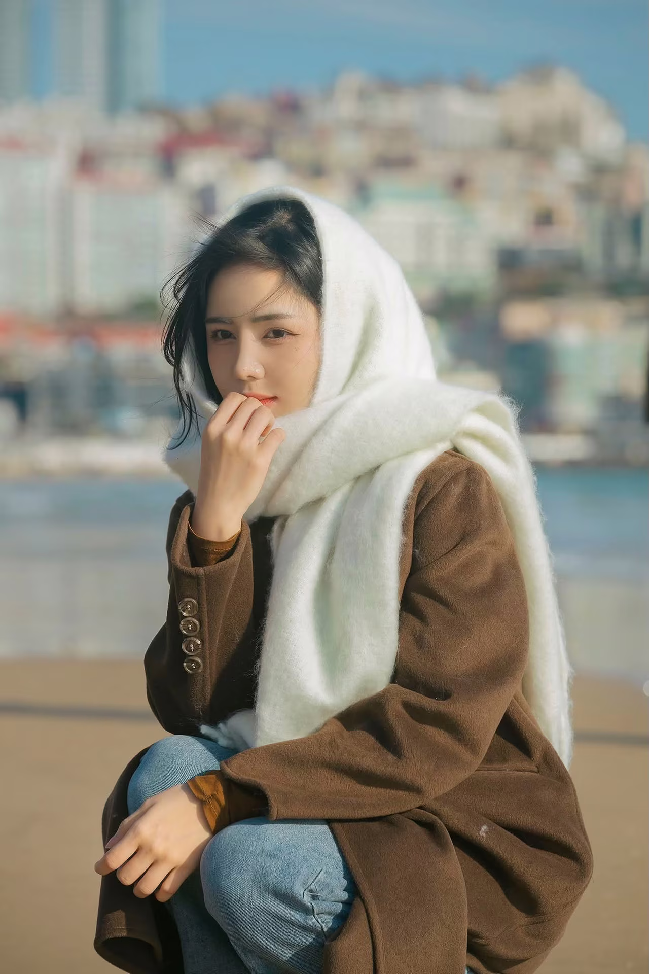 This image captures a poignant moment of a young woman on a serene beach on a cool winter day Dressed in a warm brown coat and a soft white scarf elegantly wrapped around her she exudes a unique blend of elegance and winter style Her pensive gaze directed towards the camera seems to convey a deeper narrative of introspection In the background the expansive coastline meets a peaceful city creating a harmonious and romantic backdrop This portrait not only celebrates individual beauty but also evokes a sense of inner tranquility and timeless charm amidst the grand natural scenery Its a moment of quiet reflection and profound emotion #Vietnamese #pretty #charm