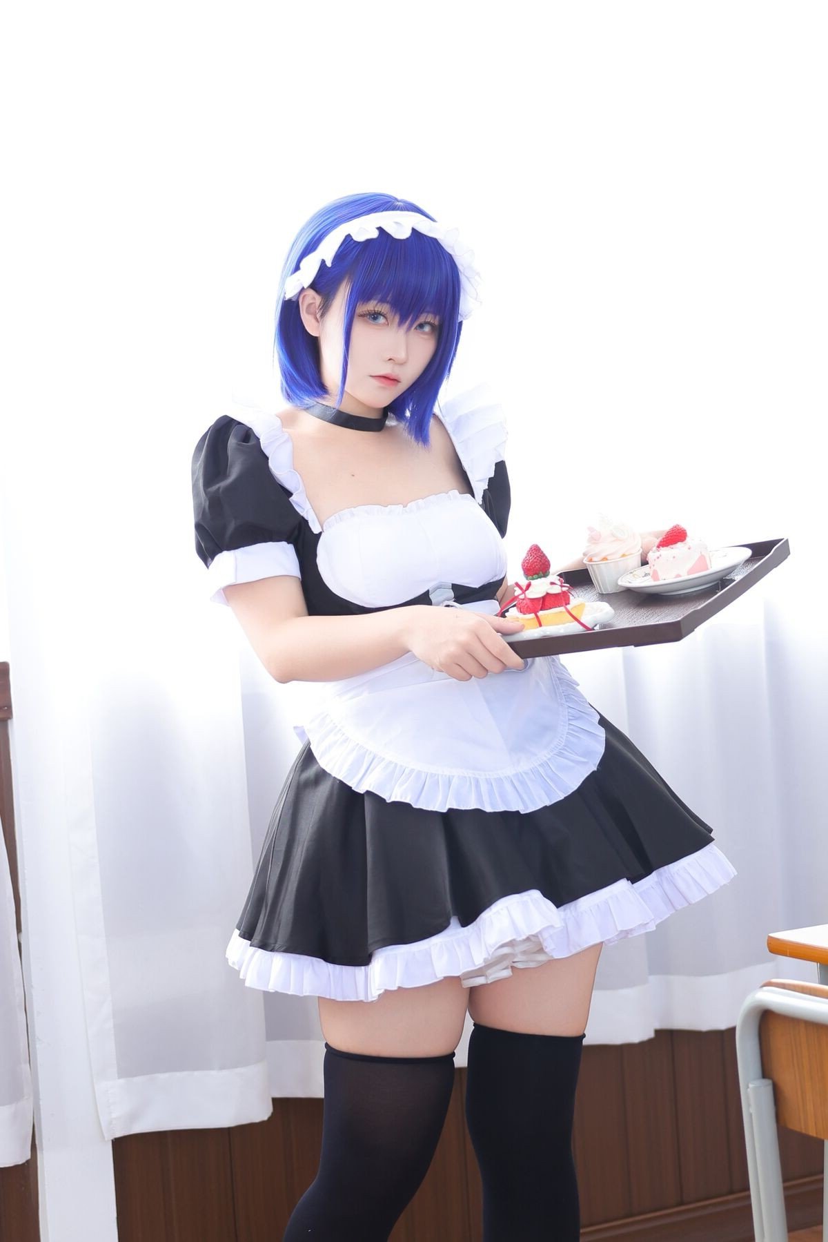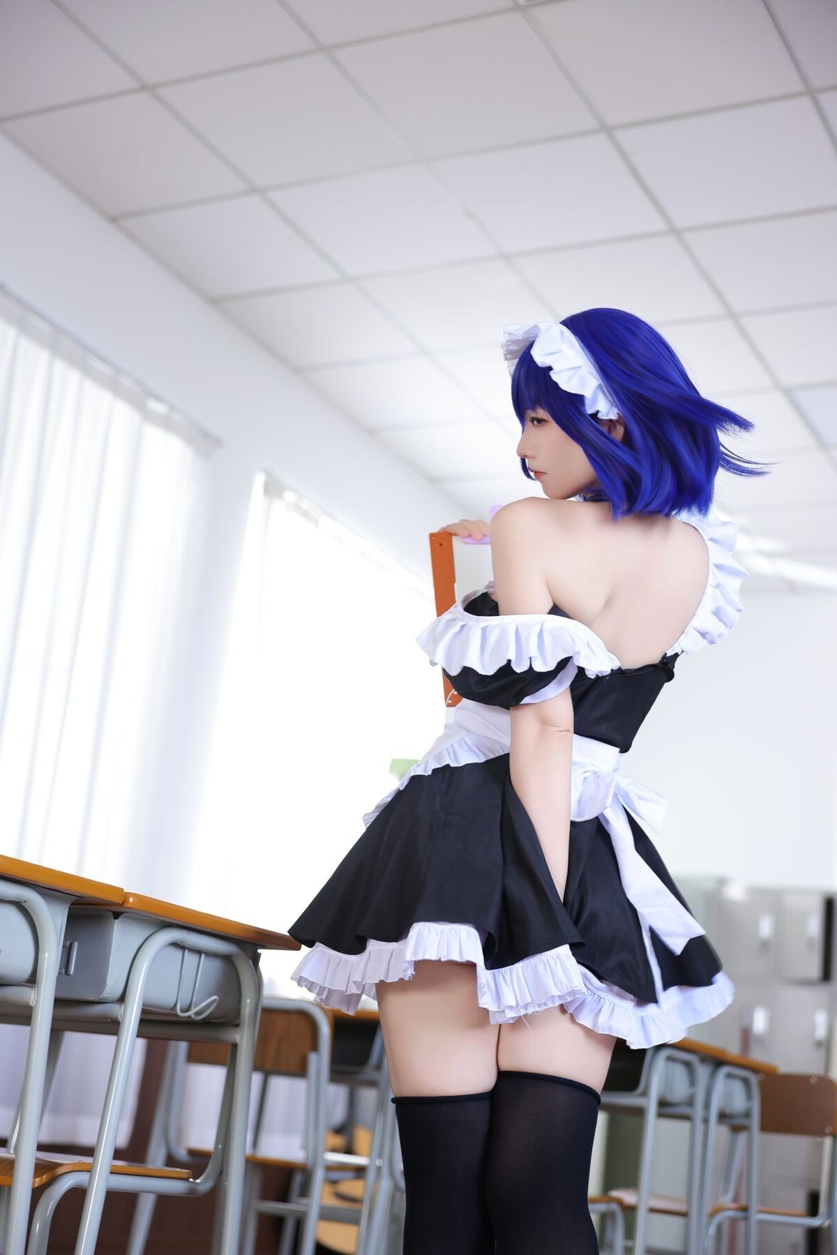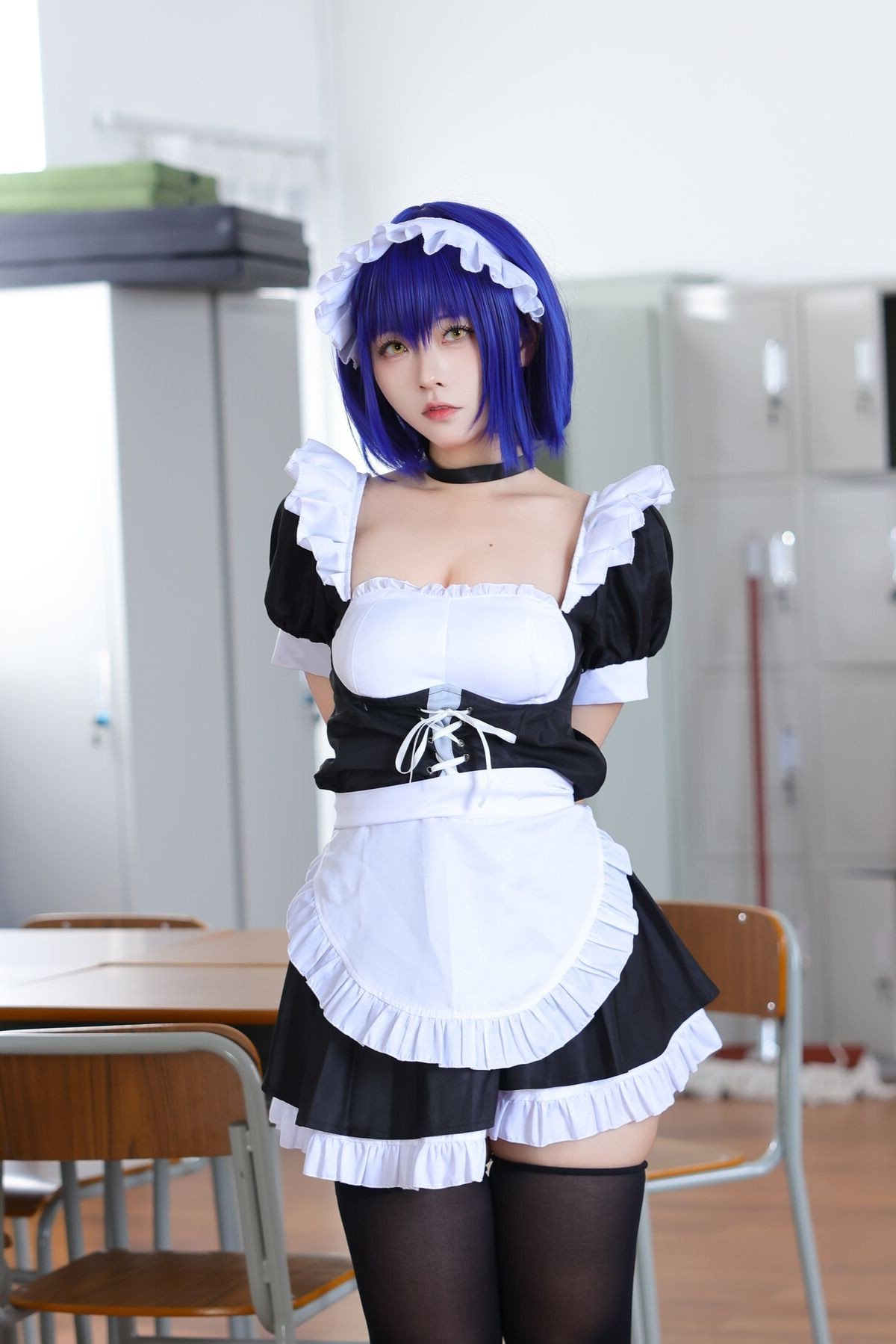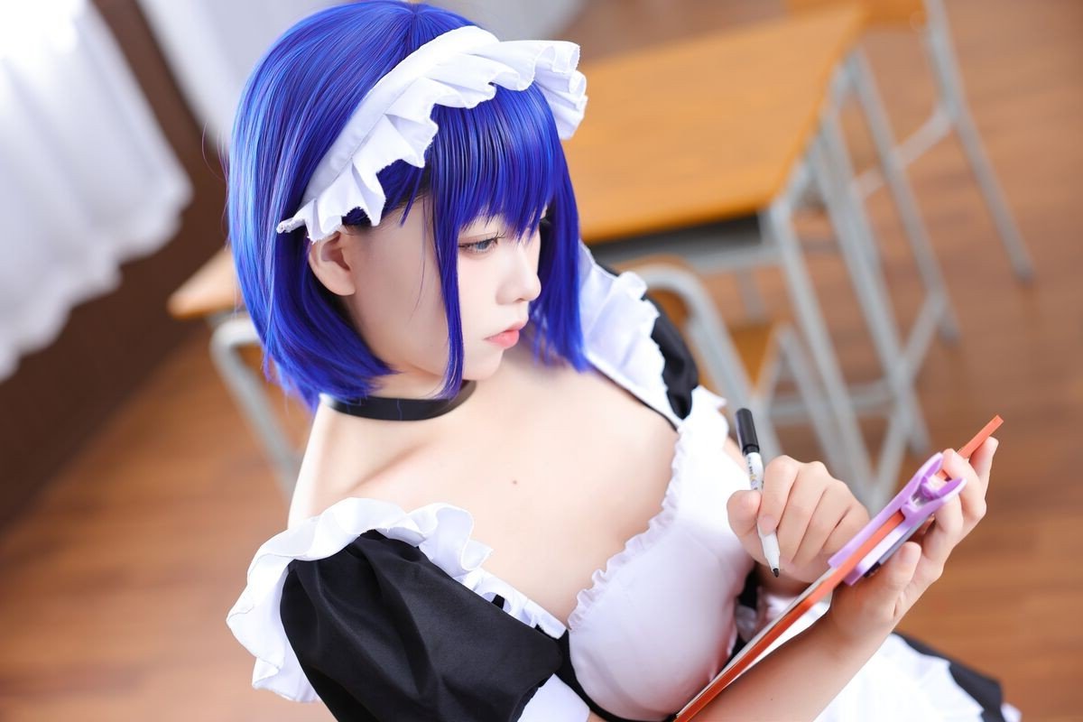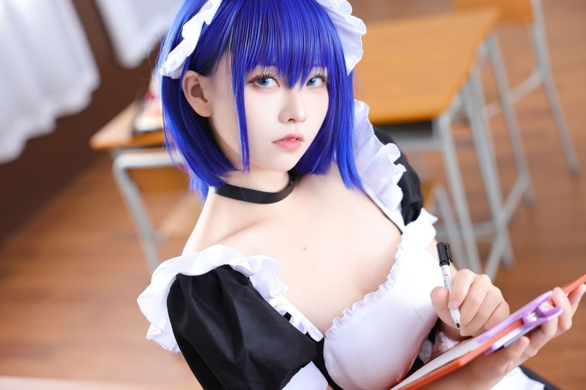 Coser G44 Bu Hui Shou Shang delivers a captivating transformation in a classic maid costume. The model, with her striking blue-purple hair and enchanting gaze, poses gracefully by a classroom desk. Her maid outfit, featuring a pristine white apron and delicate lace details, beautifully blends innocence with allure. The familiar school setting provides an intriguing contrast, infusing this Feng Yu Ling cosplay photoshoot with a blend of nostalgia and contemporary charm. Every element, from the meticulously crafted attire to the expressive pose, highlights the coser's dedication and passion. This collection transcends mere costuming, presenting a narrative of beauty and creativity that is sure to mesmerize viewers.