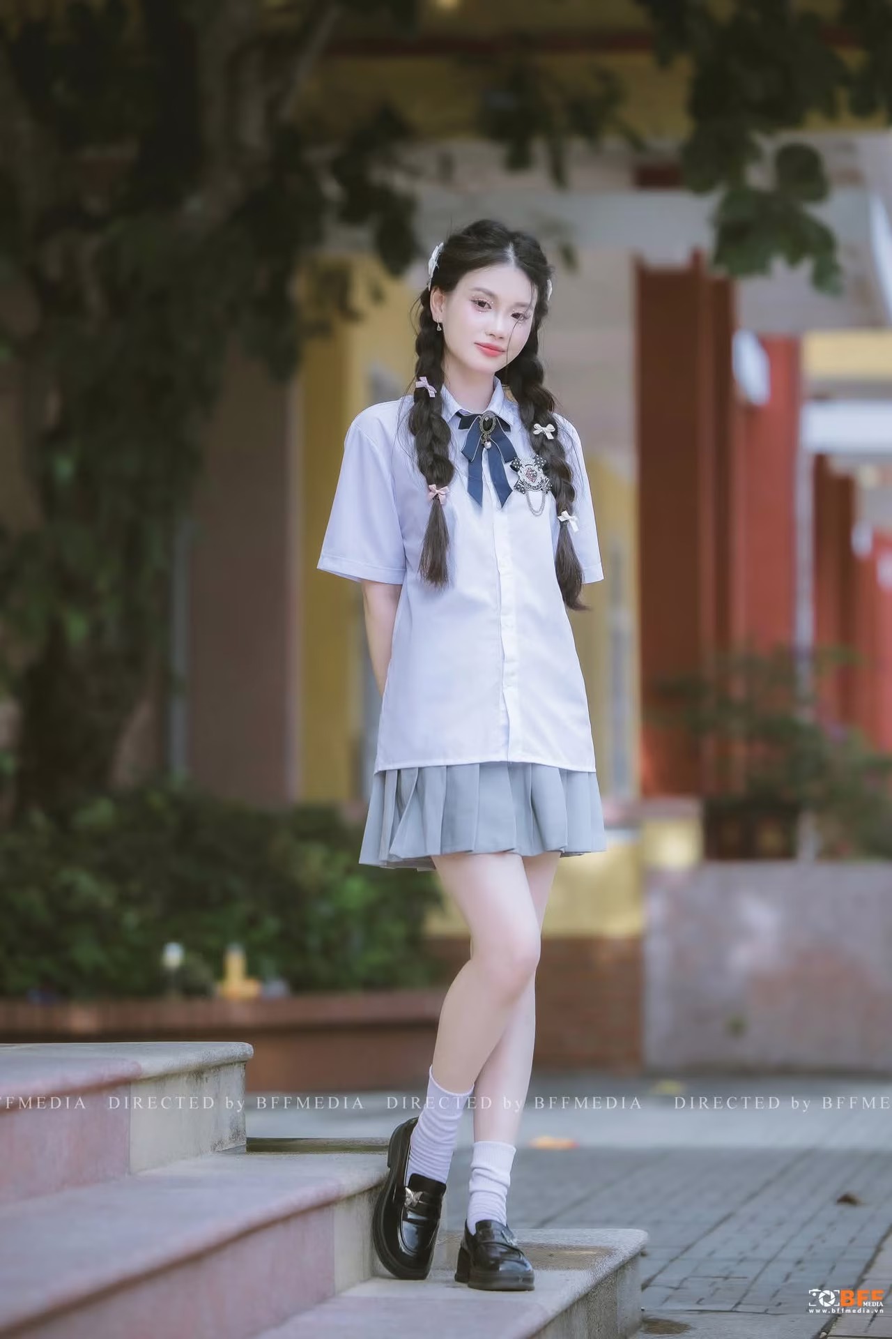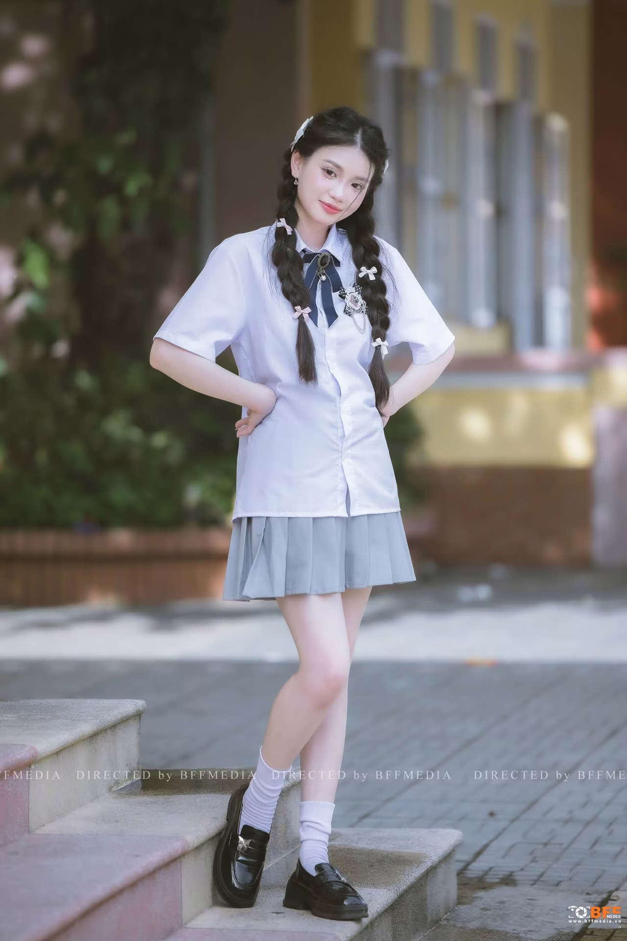 This image captures a vibrant young female student elegantly dressed in her classic uniform of a white shirt and grey pleated skirt Her hair styled in two braided pigtails adorned with blue bows coupled with a radiant smile exudes the innocent charm and purity of school days Standing gracefully on steps beneath lush green foliage she strikes a confident and dynamic pose This scene evokes beautiful memories of youth filled with unforgettable moments spent at school The simple yet captivating beauty of Vietnamese female students in their uniforms consistently leaves a deep impression embodying the dynamism and optimism of the younger generation
