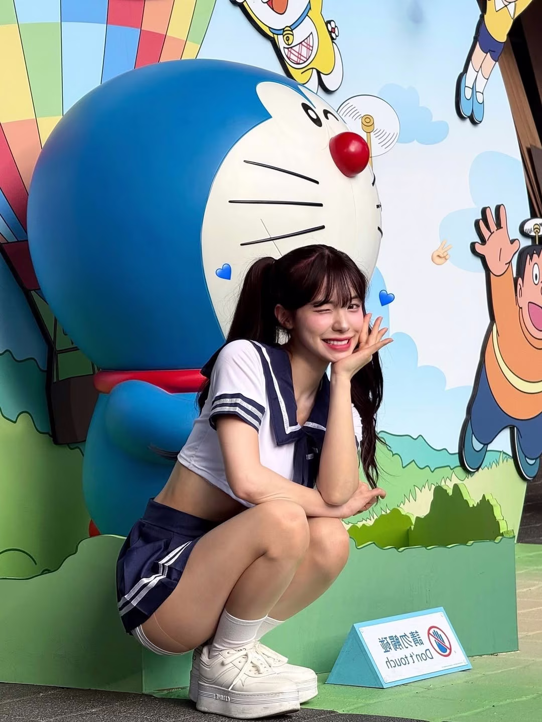 Cheerleader Goddess in Sweet Sailor Style Flaunts 56cm Waist with Doraemon
