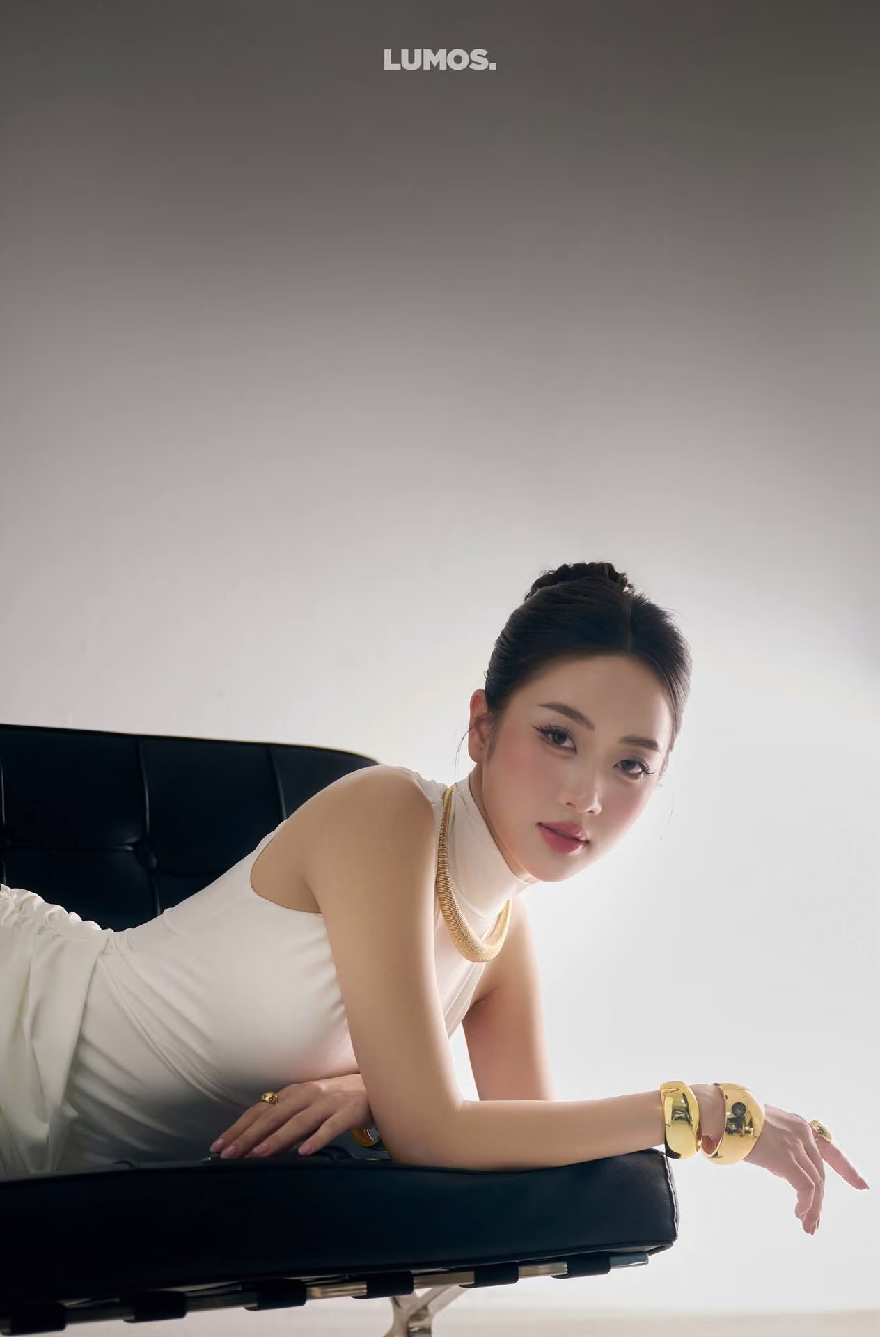 This stunning photograph captures a mesmerizing woman exuding elegance and allure. She is impeccably dressed in a pristine white formfitting dress highlighting her perfect silhouette and refined fashion sense. With her hair neatly styled in an updo and adorned with shimmering gold accessories like a choker necklace and a bold bracelet she epitomizes luxury and sophistication. Her pose reclining gracefully on a modern black chair combined with a confident expression and captivating gaze creates a harmonious and artistic composition. This is more than just a fashion shot it is a symbol of selfassurance timeless beauty and the irresistible charm of the contemporary woman. The minimalist black chair provides a perfect backdrop enhancing the pure white attire and the charismatic presence of the main subject.