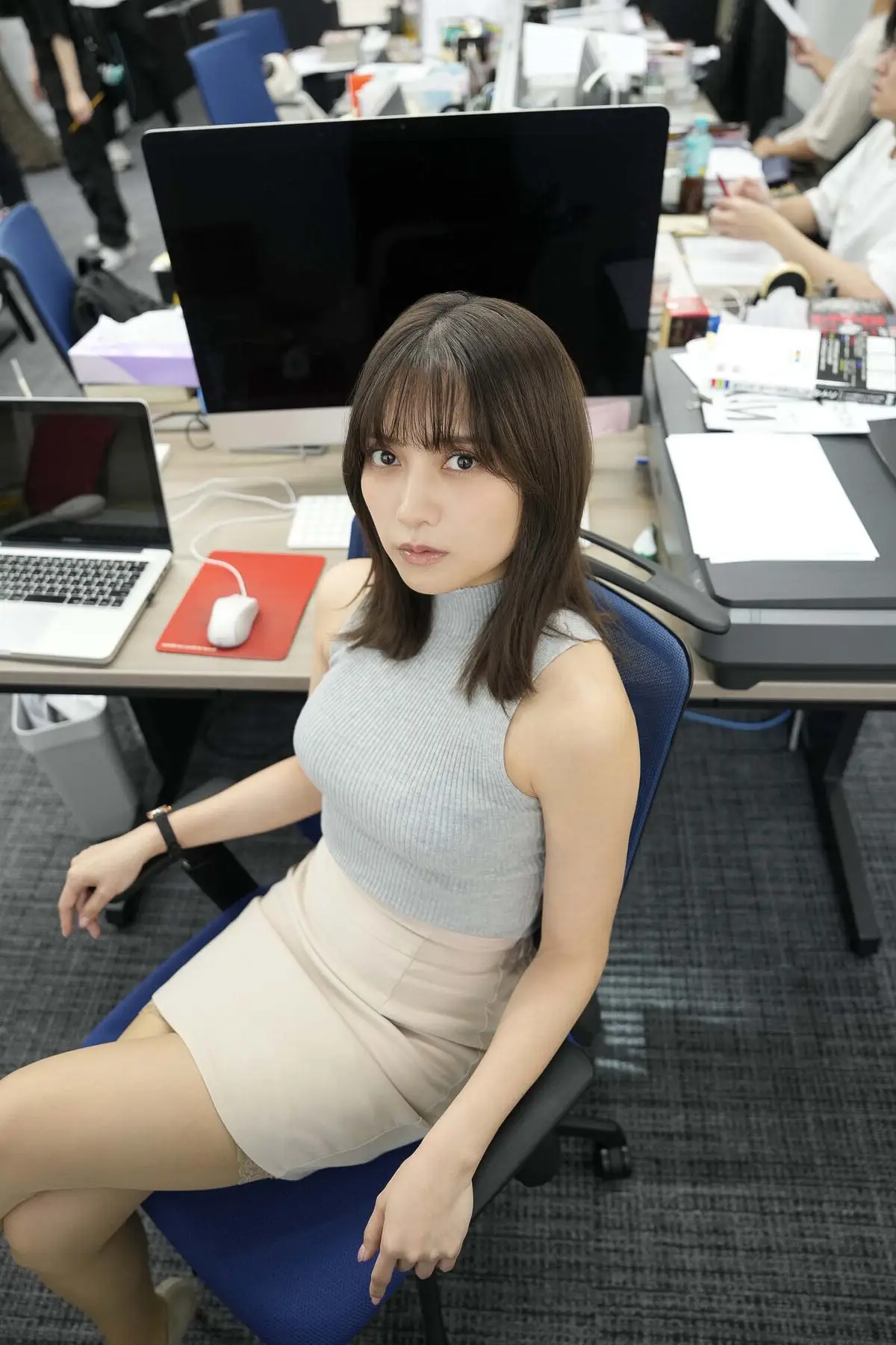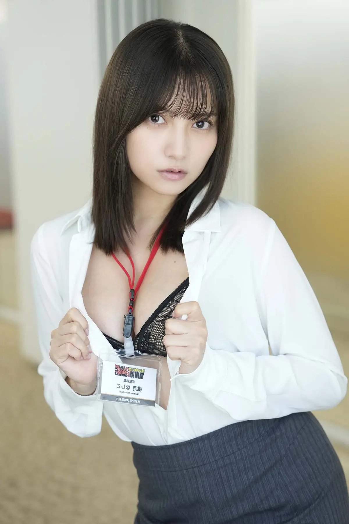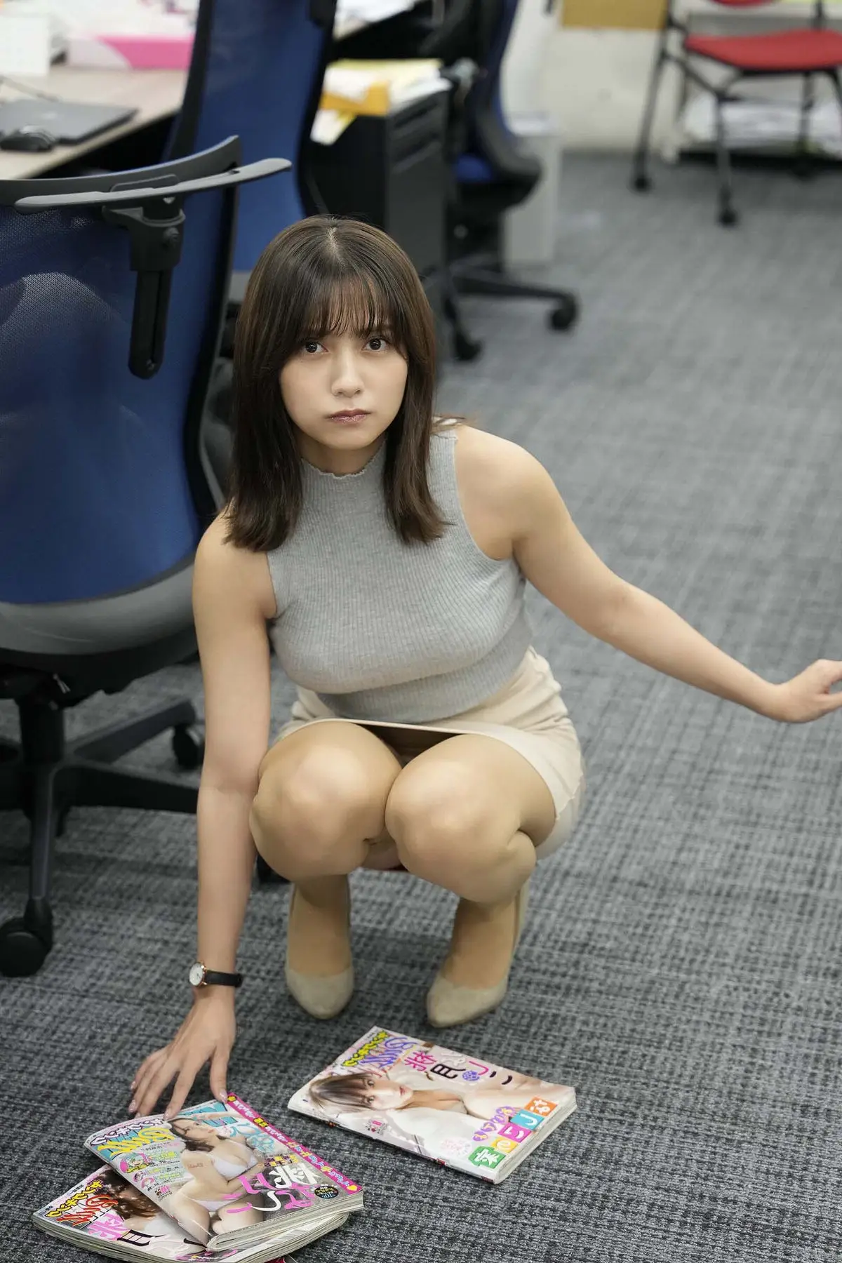 In this captivating photo, Momotsuki Nashiko 桃月なしこ appears in a familiar yet surprising office setting. She is seen crouching on the floor, her gaze directed straight at the camera with a mix of surprise and curiosity. Her simple office attire subtly enhances her natural beauty. Beside her lie magazines, hinting at private thoughts or secrets amidst the professional workspace. This image beautifully evokes the theme 'Can love be expensed?' from her digital photobook, prompting questions about the blurred lines between work and personal emotions. It's a candid moment, showcasing Nashiko's grace and charm as an office muse, inviting viewers to delve deeper into the narrative behind her intriguing expression.#MomotsukiNashiko #OfficeMuse #DigitalGravure #OfficeRomance