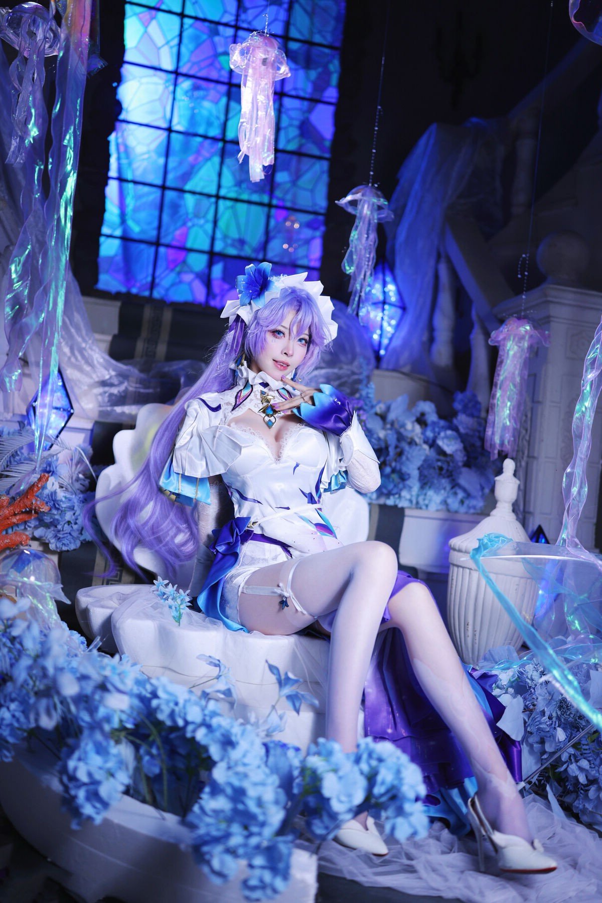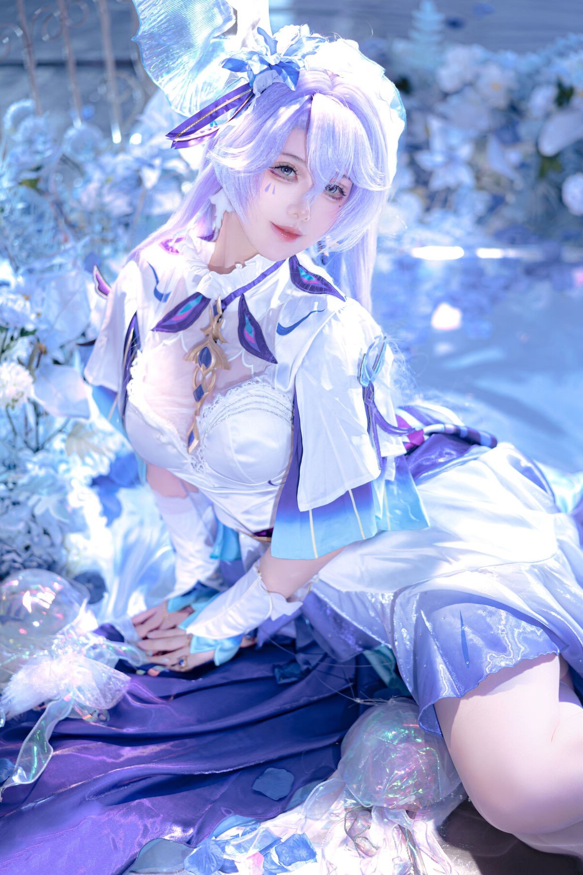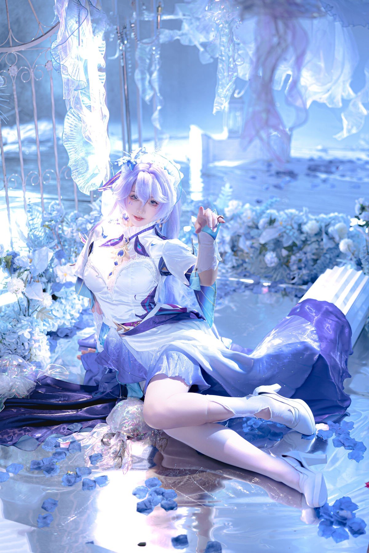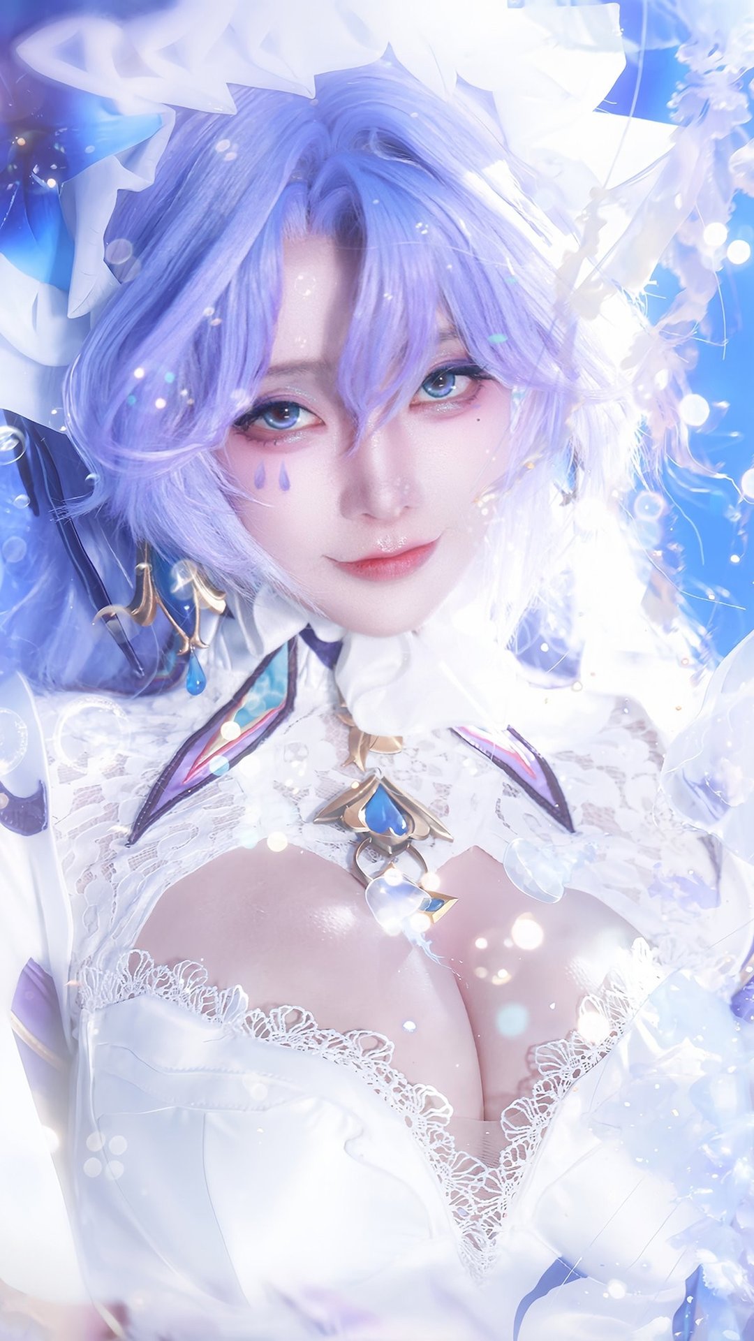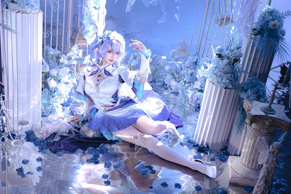 This captivating image features cosplayer Zouluyiao Zly embodying the character Cantarella from the game Wuthering Waves She perfectly captures the essence with her flowing light purple hair and intricate costume faithfully recreating the characters beauty The surrounding environment is meticulously crafted to resemble a mystical frozen world complete with sparkling crystals and delicate blue petals creating a dreamy and surreal atmosphere Soft blue light bathes the scene highlighting Zouluyiao Zlys ethereal demeanor and captivating gaze Her graceful pose and gentle expression successfully convey Cantarellas elegance and enigmatic charm This is more than just a cosplay photo it is an artistic piece that transmits the characters unique emotion and allure to the viewer sparking imagination about the world of Wuthering Waves