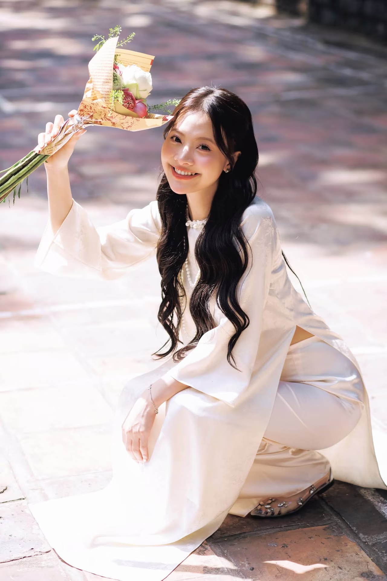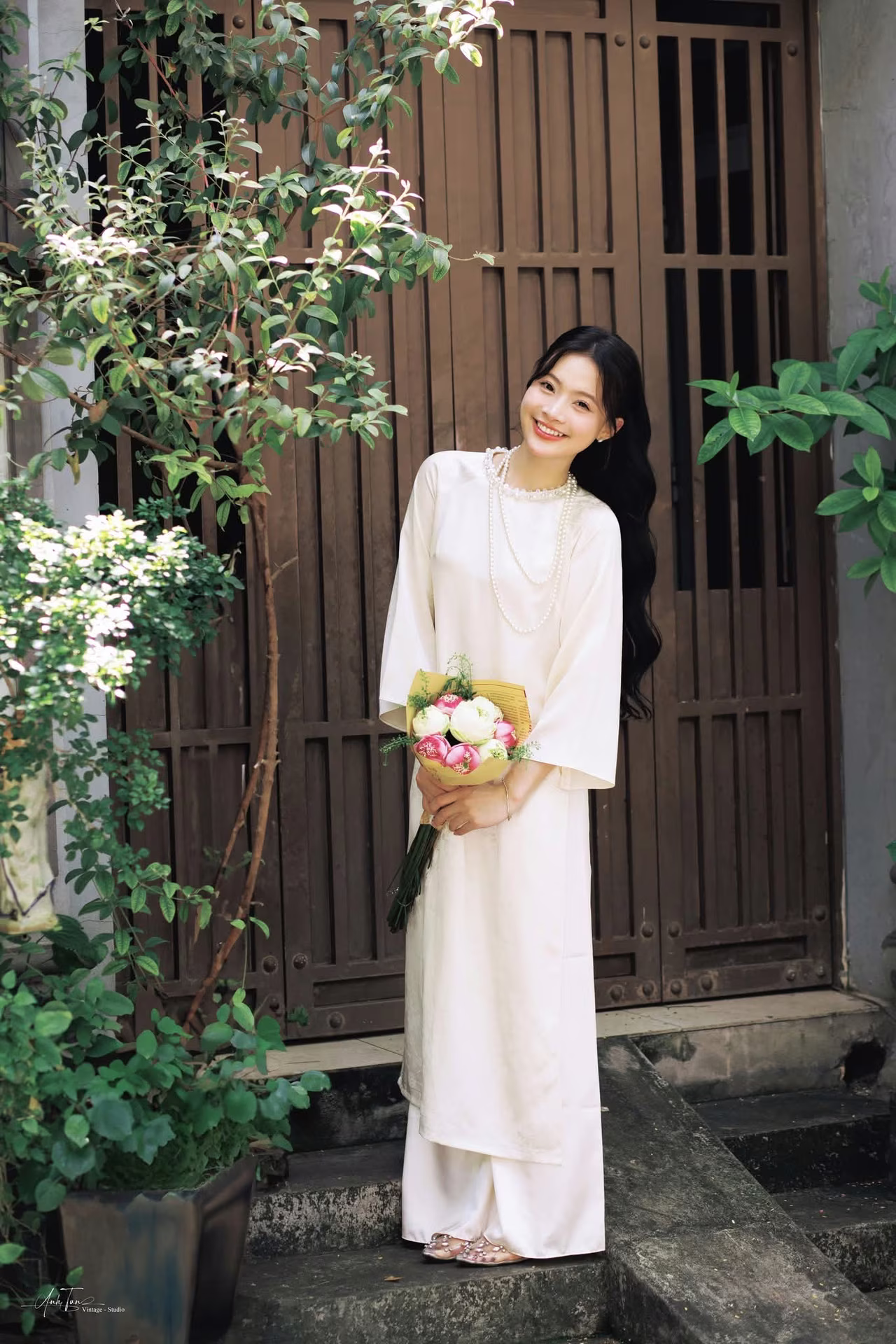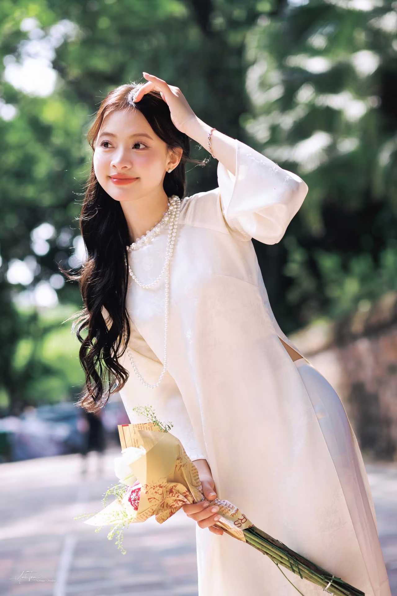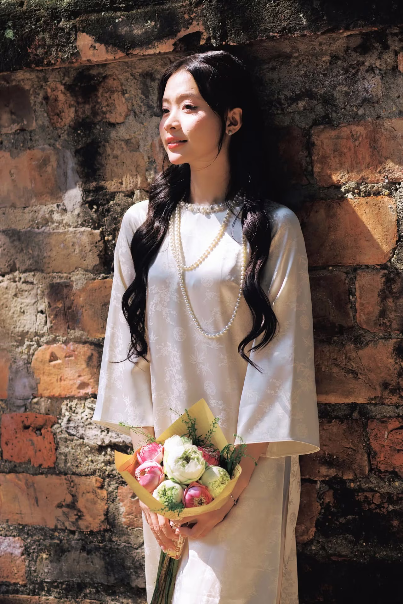 This image VGU No.131 captures the elegant beauty of a young Vietnamese woman in a pristine traditional dress. She gently leans against an ancient brick wall, her long hair flowing and her gaze distant, exuding a contemplative and gentle charm. In her hands, she holds a delicate bouquet of white lotus flowers, a symbol of purity and the Vietnamese soul's beauty. Natural light skillfully creates interplay of light and shadow, highlighting the soft lines of her traditional attire and the nostalgic ambiance of the surroundings. This portrayal not only celebrates the graceful beauty of Vietnamese women but also evokes timeless traditional cultural values, offering viewers a sense of peace and profound reflection. Discover the harmonious blend of classic and contemporary in every frame. #Vietnamese #pretty #charm