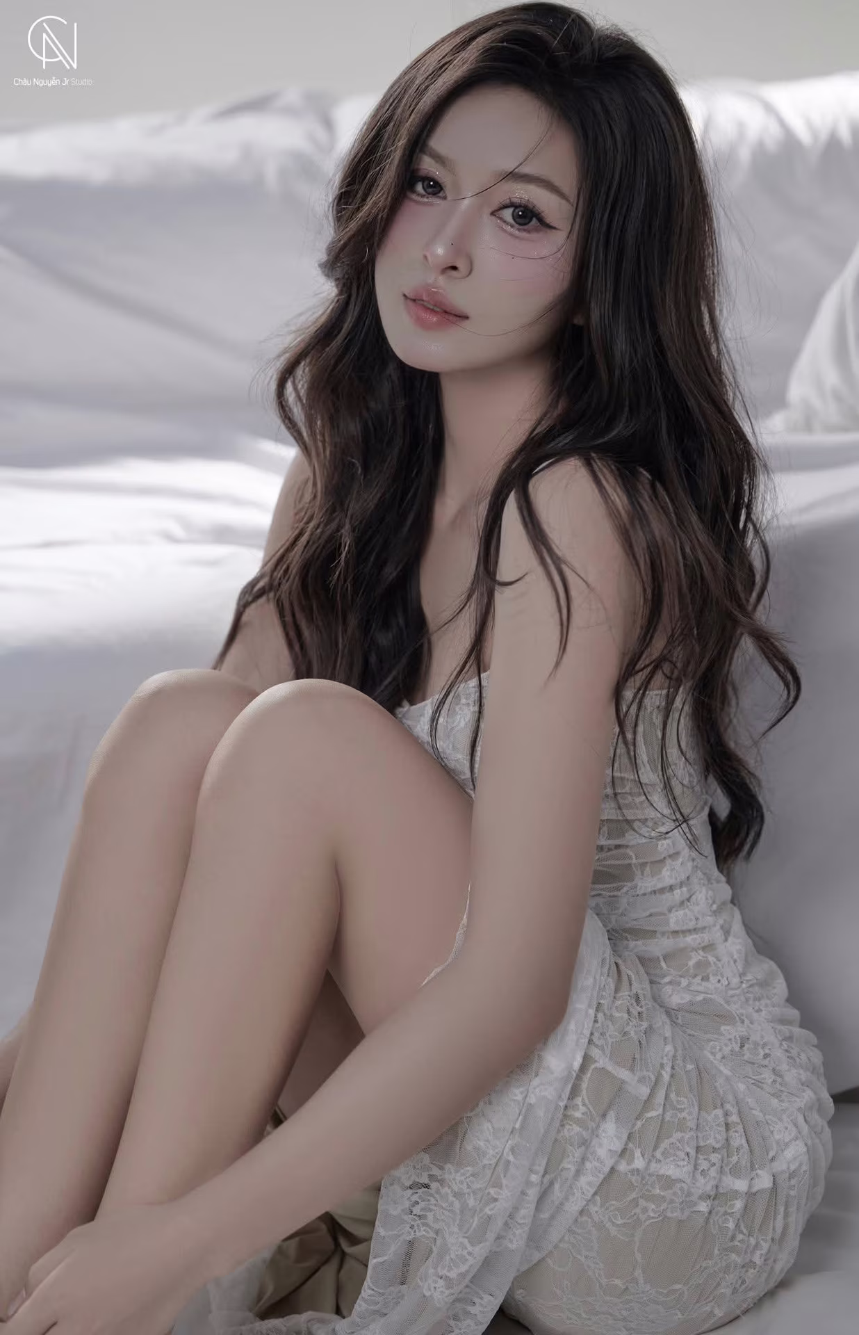 This captivating image beautifully portrays a woman exuding gentle elegance and sophisticated allure. Dressed in a pristine white gown, possibly crafted from delicate lace or flowing silk, her graceful silhouette is perfectly accentuated. Her long, dark, wavy hair cascades naturally, adding a touch of mysterious charm as she gazes subtly over her shoulder. Soft, ethereal lighting illuminates her flawless complexion and refined facial features, enhancing her serene expression. The entire setting, with its minimalist white backdrop, radiates an air of timeless luxury and refined taste, blending inner beauty with external poise. This photograph is more than just a fashion statement; it is an artistic tribute to the pure, sensual, and captivating essence of modern femininity.