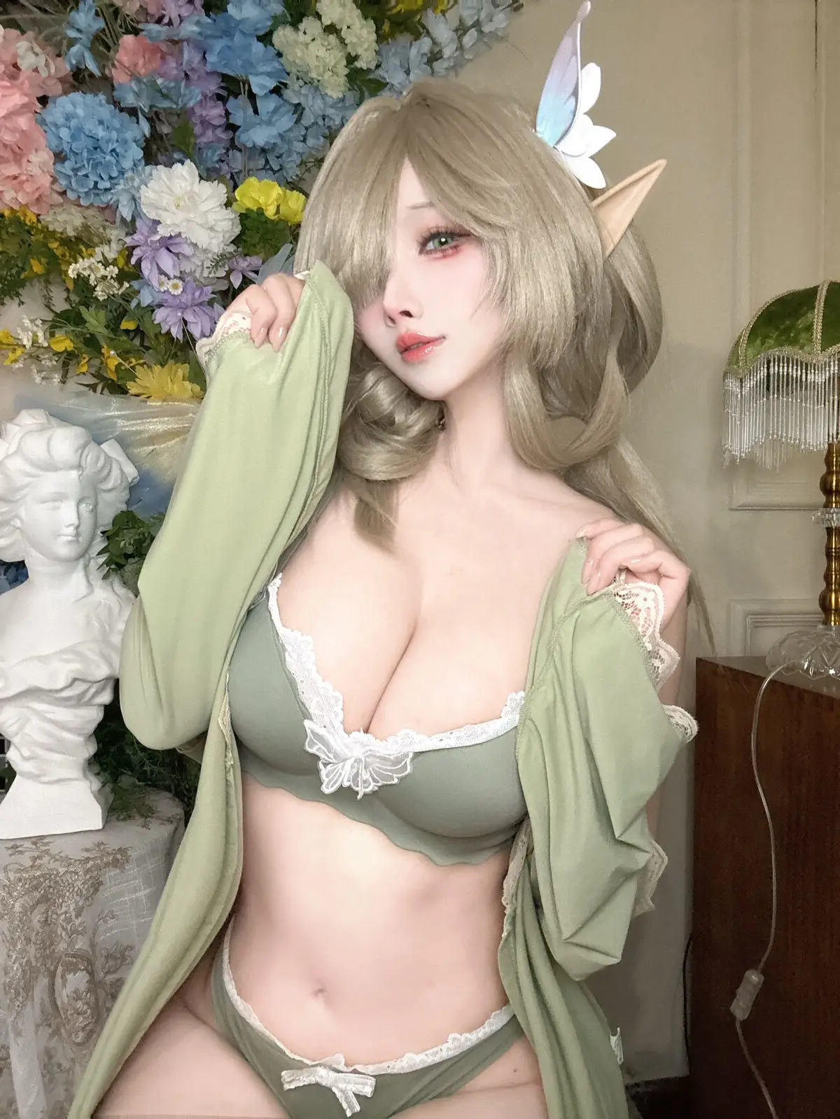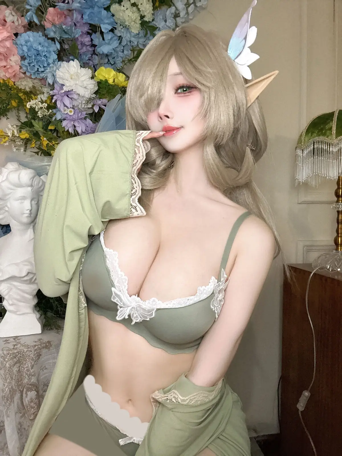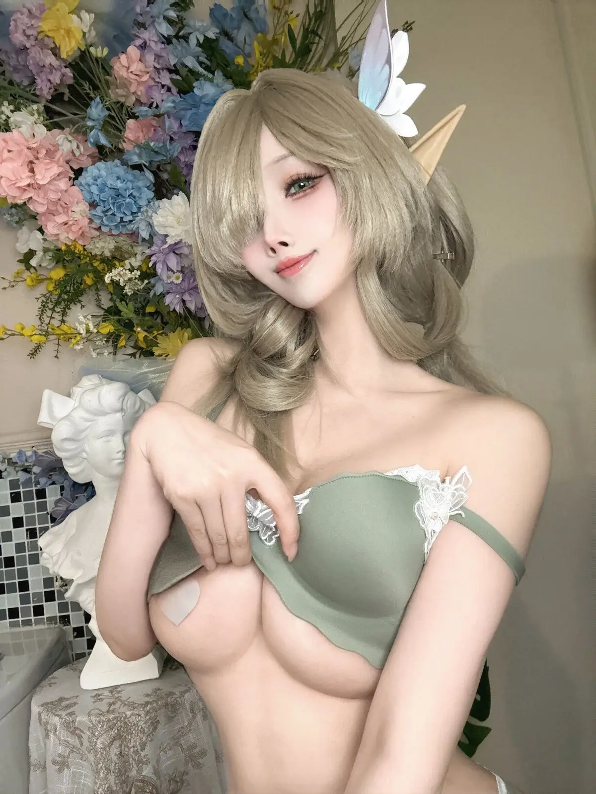 This stunning image features Coser Rioko Liang Liang Zi embodying the character Seven Provinces from Azur Lane. With her flowing blonde hair and distinctive elf ears she exudes an ethereal and captivating beauty. The delicate light green lingerie adorned with intricate white lace elegantly highlights her figure. Rioko Liang Liang Zi's mesmerizing gaze and graceful pose create a romantic and alluring atmosphere. The backdrop of vibrant flowers and a classic sculpture adds a touch of sophistication to the overall scene. This impressive cosplay showcases Rioko Liang Liang Zi's dedication and passion offering a fresh and captivating perspective into the world of Azur Lane.#CoserRiokoLiangLiangZi #AzurLane #SevenProvinces #LingerieCosplay #SexyCosplay