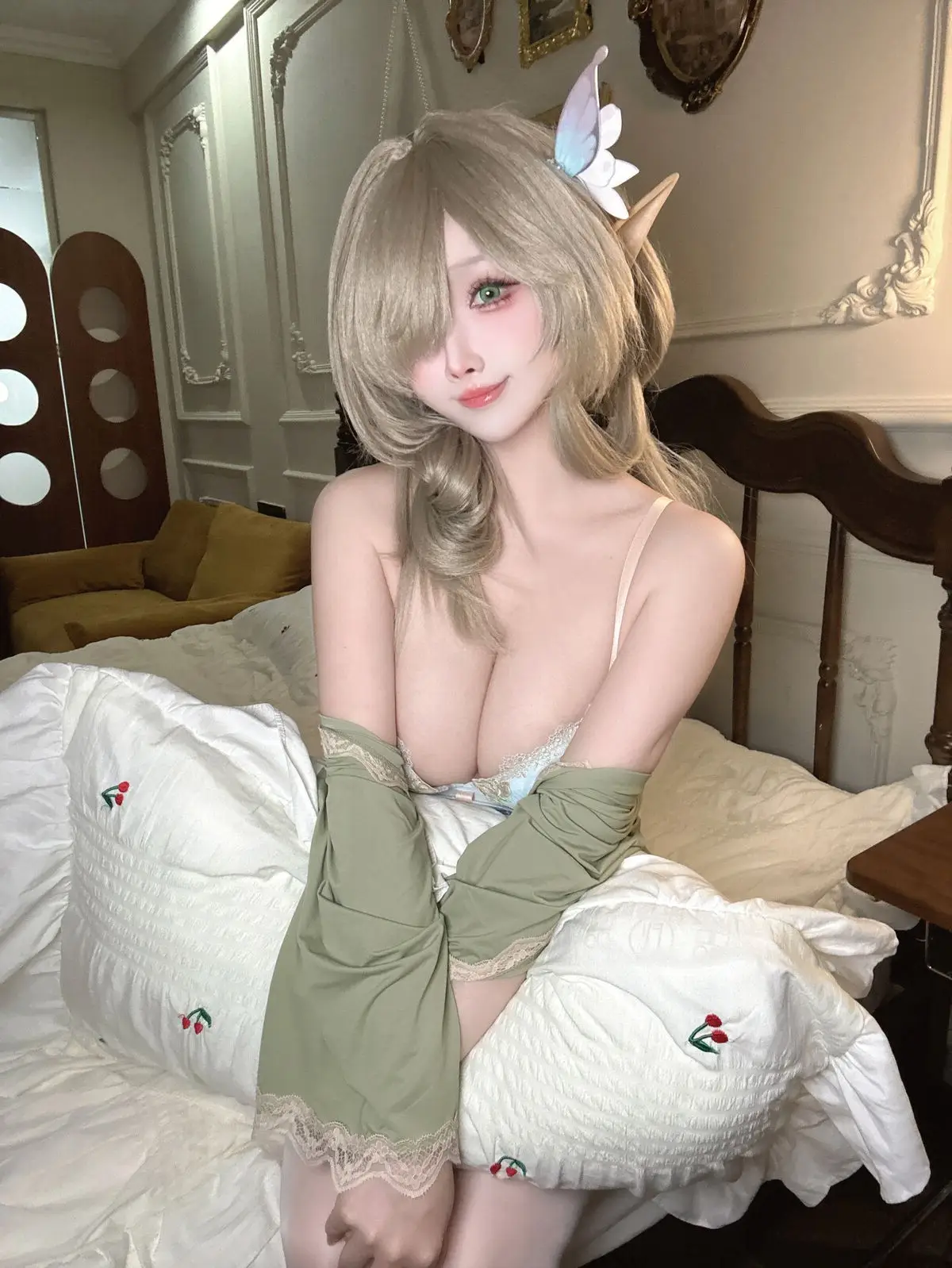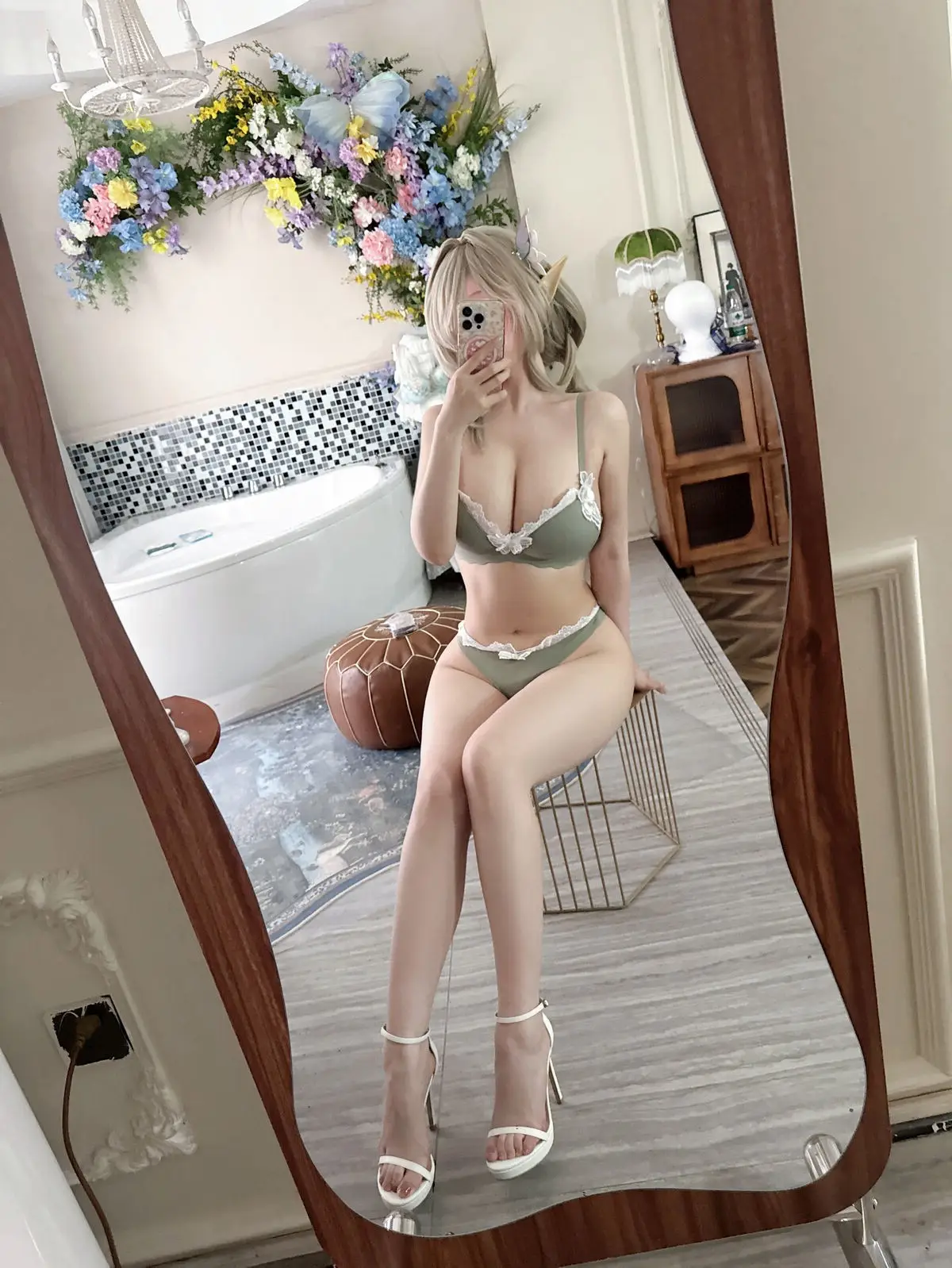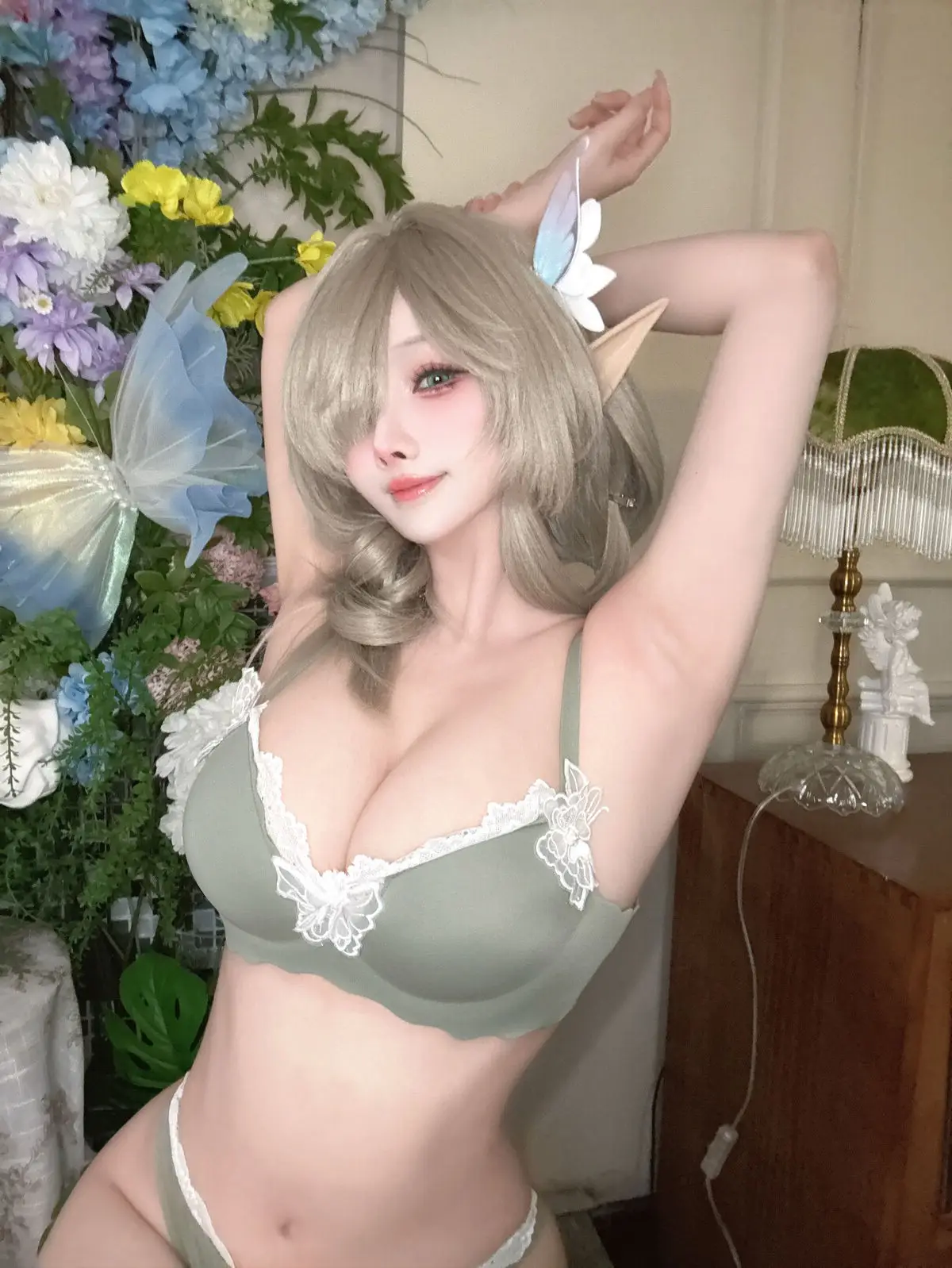 This stunning image features Coser Rioko Liang Liang Zi embodying the character Seven Provinces from Azur Lane. With her flowing blonde hair and distinctive elf ears she exudes an ethereal and captivating beauty. The delicate light green lingerie adorned with intricate white lace elegantly highlights her figure. Rioko Liang Liang Zi's mesmerizing gaze and graceful pose create a romantic and alluring atmosphere. The backdrop of vibrant flowers and a classic sculpture adds a touch of sophistication to the overall scene. This impressive cosplay showcases Rioko Liang Liang Zi's dedication and passion offering a fresh and captivating perspective into the world of Azur Lane.#CoserRiokoLiangLiangZi #AzurLane #SevenProvinces #LingerieCosplay #SexyCosplay