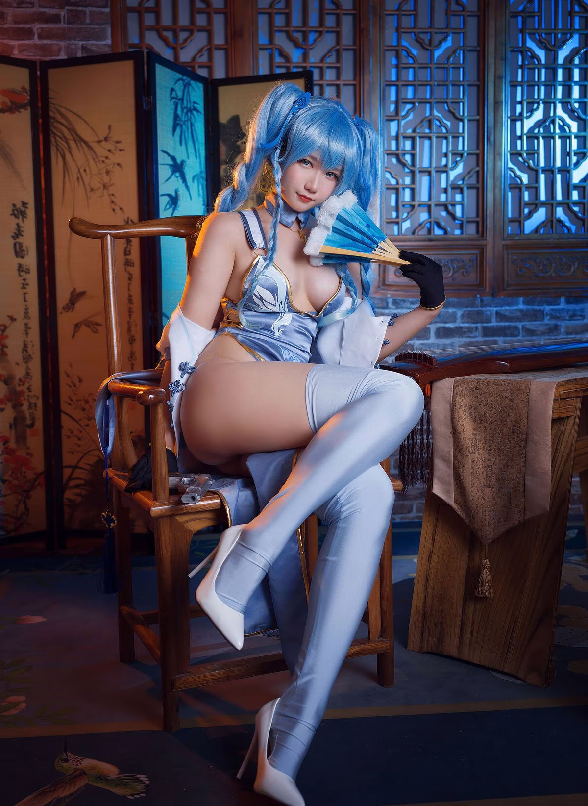 Immerse yourself in the captivating world of Girls' Frontline through the stunning portrayal by Coser 麻花麻花酱. This photoshoot showcases her alluring and refined beauty, donning a distinctive character costume in harmonious shades of blue and white. Every detail of the cosplay is meticulously crafted, from her flowing blue hair to the seductive long white stockings, creating an utterly enchanting look. Coser 麻花麻花酱's expressive gaze, combined with her elegant pose on a traditional wooden chair and the classic architectural backdrop, accentuates the character's grace and charm. This collection is more than just a vibrant recreation; it's an artistic masterpiece that evokes emotion and admiration from viewers.