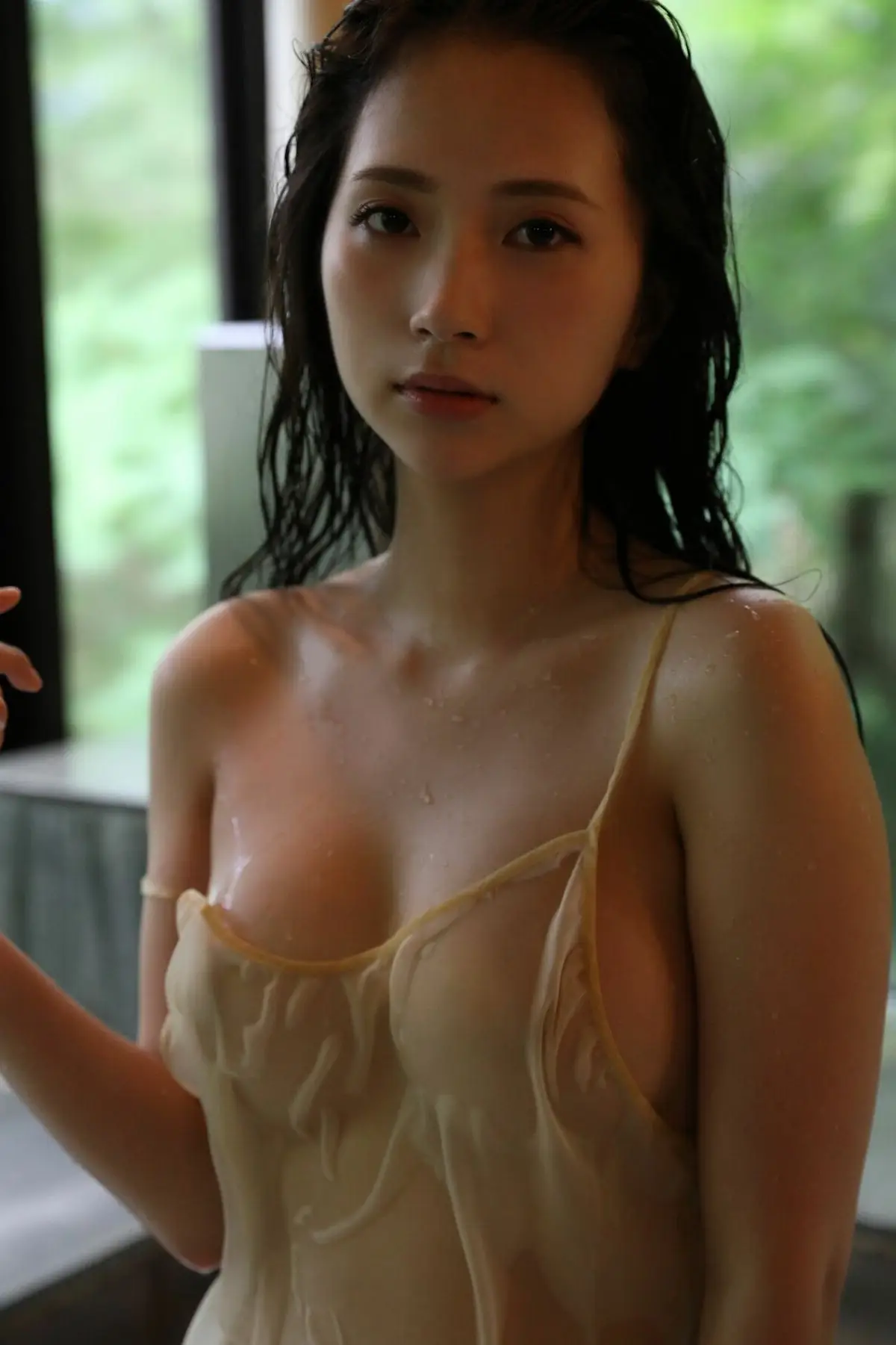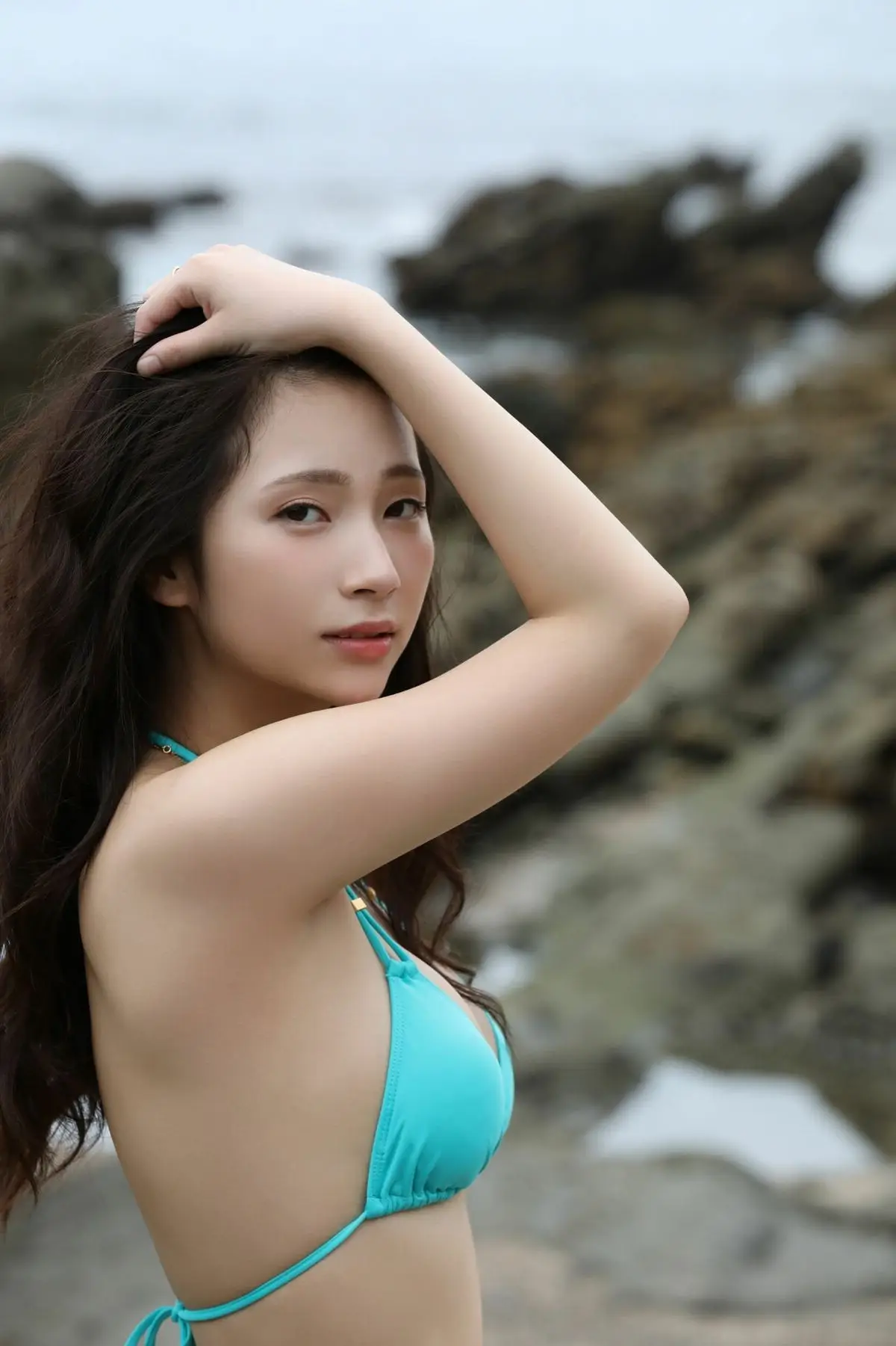 This stunning image captures Miho Machiyama, a captivating beauty from Keio University, in a moment of serene allure. With her flowing dark hair and mesmerizing gaze, she leans gracefully against a rock, showcasing her natural charm in a vibrant turquoise bikini. This photograph is part of the FRIDAY Digital Photo Book "秘宿 潮騒" (Secret Inn Tide Sound), where Miho Machiyama embodies elegance and sensuality amidst a picturesque natural backdrop. Her unique blend of intellectual grace and alluring presence makes her a focal point, promising an unforgettable visual journey for viewers delving into this complete Part02 collection.