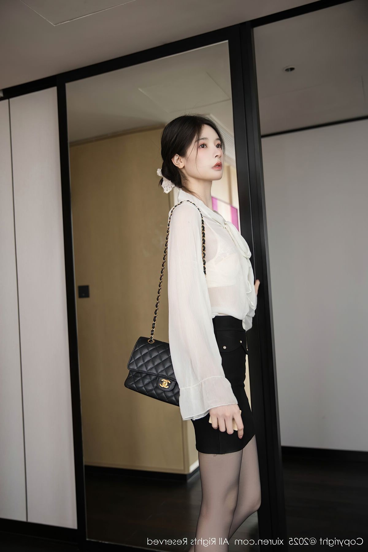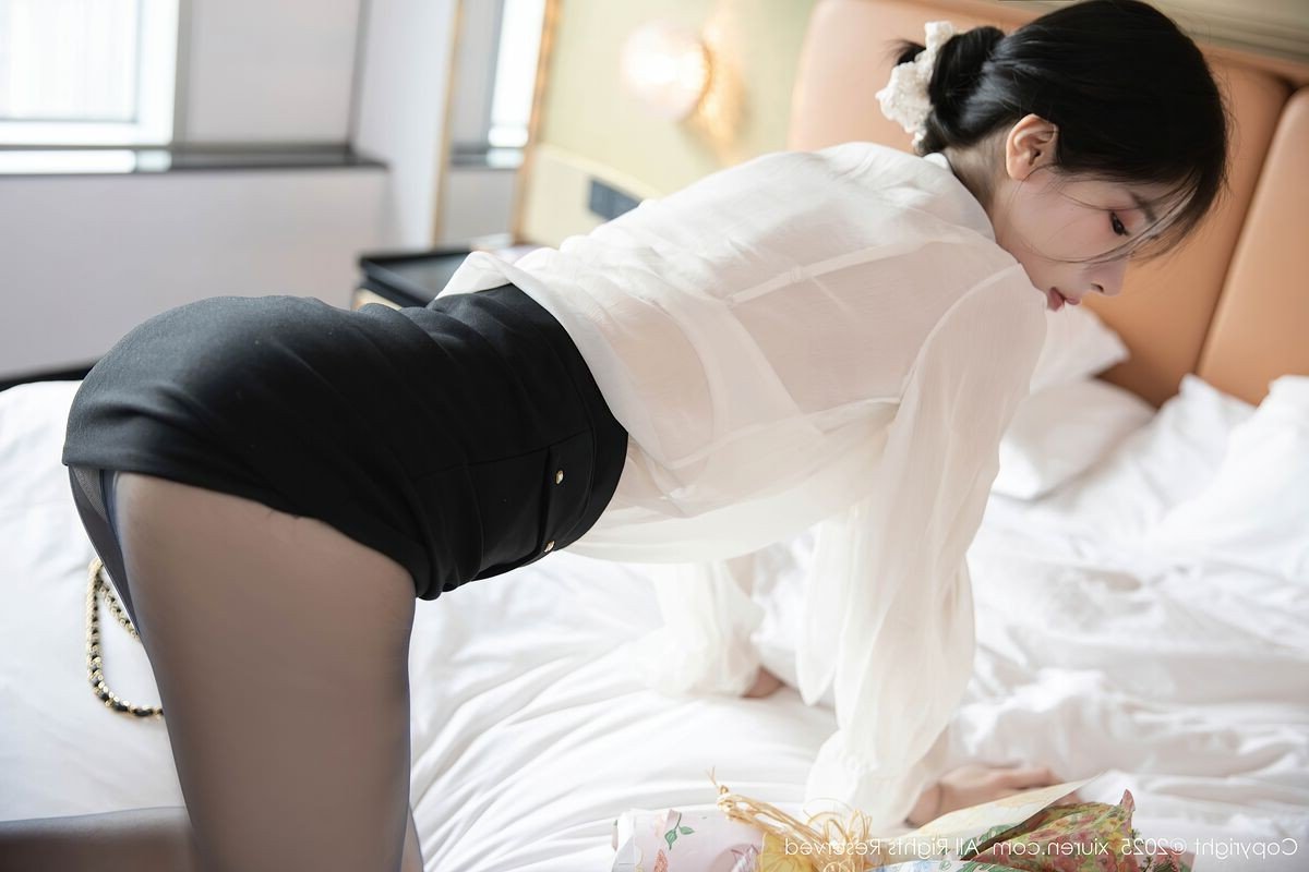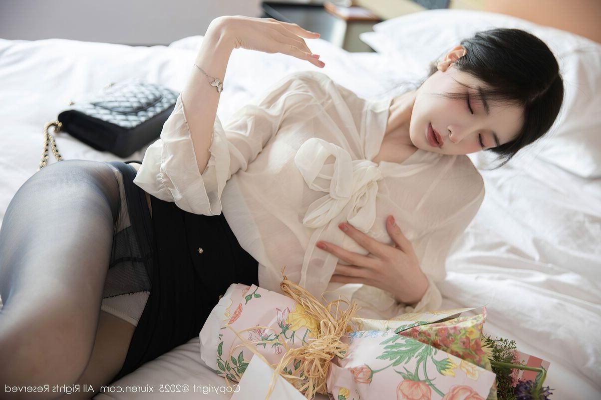 In this XiuRen No.10319 collection model Bu Ding WOW embodies a captivating blend of allure and sophistication. Reclining gracefully on a pristine white bed she exudes an irresistible charm. Dressed in a delicate white blouse paired with a form-fitting black mini skirt Bu Ding WOW highlights her slender figure and long legs elegantly accentuated by sheer pantyhose and luxurious black high heels. Every detail from her thoughtful gaze to her confident pose speaks volumes of her captivating presence. This ensemble both modest and subtly provocative not only enhances her physical contours but also showcases her confident and enchanting demeanor. This collection is a must-see for anyone seeking an exquisite display of refined beauty and irresistible appeal.