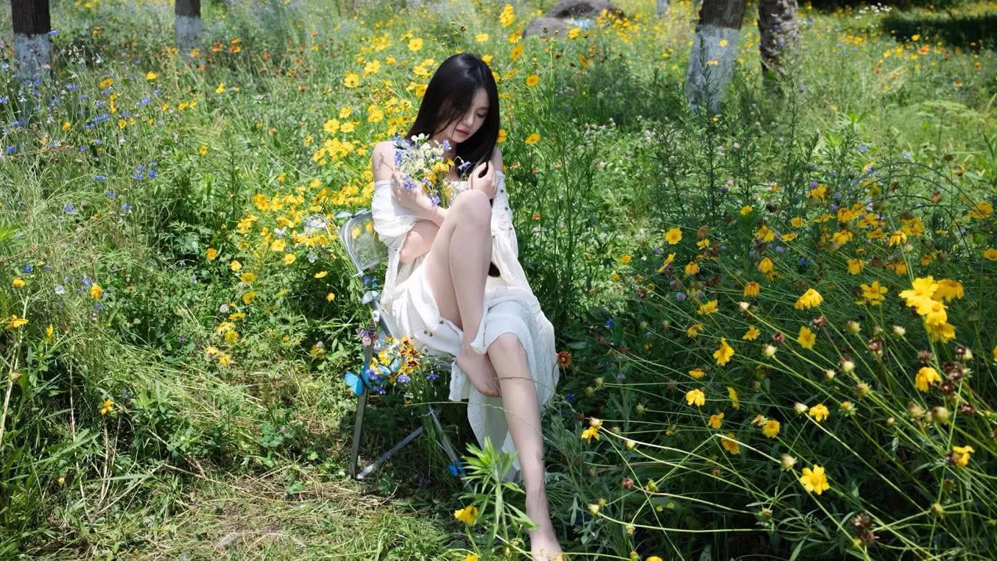 VGU No.92 unveils a poetic scene where the pristine beauty of a young woman merges with refreshing nature. She sits amidst a vibrant carpet of yellow and blue wildflowers, her long flowing hair and pure white dress accentuating her gentle grace. Soft sunlight filters through the lush green foliage, adding a shimmering ethereal quality to this peaceful moment. The small bouquet in her hands feels like an integral part of this dreamy summer tableau, evoking a sense of freedom and absolute tranquility. This image is not just a still moment but an invitation to immerse oneself in the pure beauty of nature and the human spirit. It is a captivating and emotionally rich visual story. #Vietnamese #pretty #charm