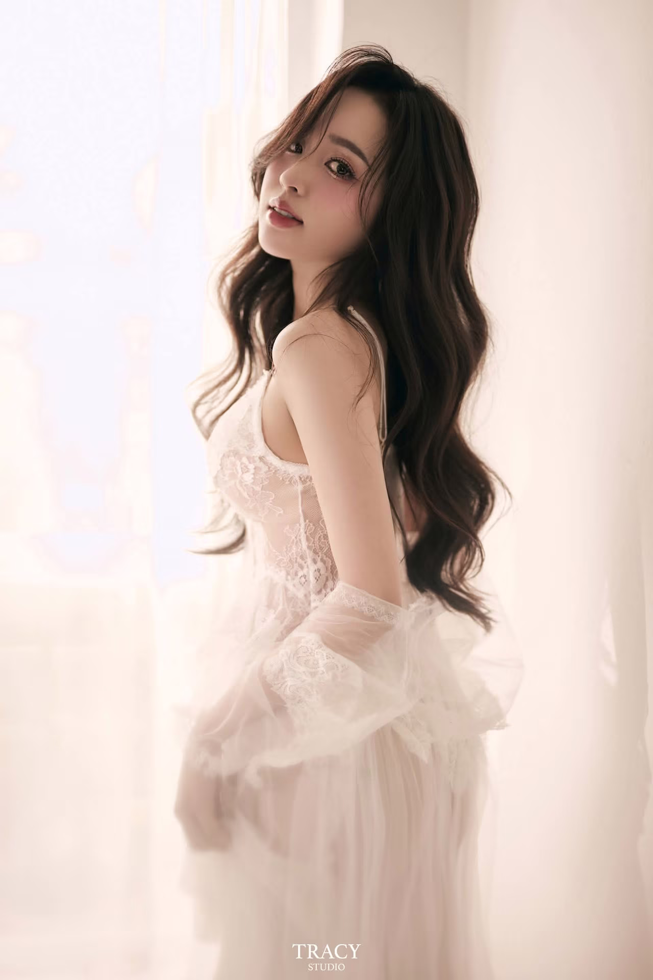 This captivating image beautifully portrays the delicate and alluring charm of a young woman. She is gracefully posed on a bed, adorned in exquisite white lace lingerie that accentuates her slender figure and radiant skin. Soft, natural light streams in from the window, creating a dreamy and romantic boudoir atmosphere. Her expression conveys a subtle shyness yet undeniable magnetism, with deep eyes and flowing long hair. This is more than just a portrait; it's an artistic boudoir moment where natural beauty and sensuality are elegantly expressed. The photograph evokes a sense of intimacy, tenderness, and irresistible allure, inviting viewers to appreciate the sophistication and inner beauty of the subject. #Vietnamese #pretty #charm