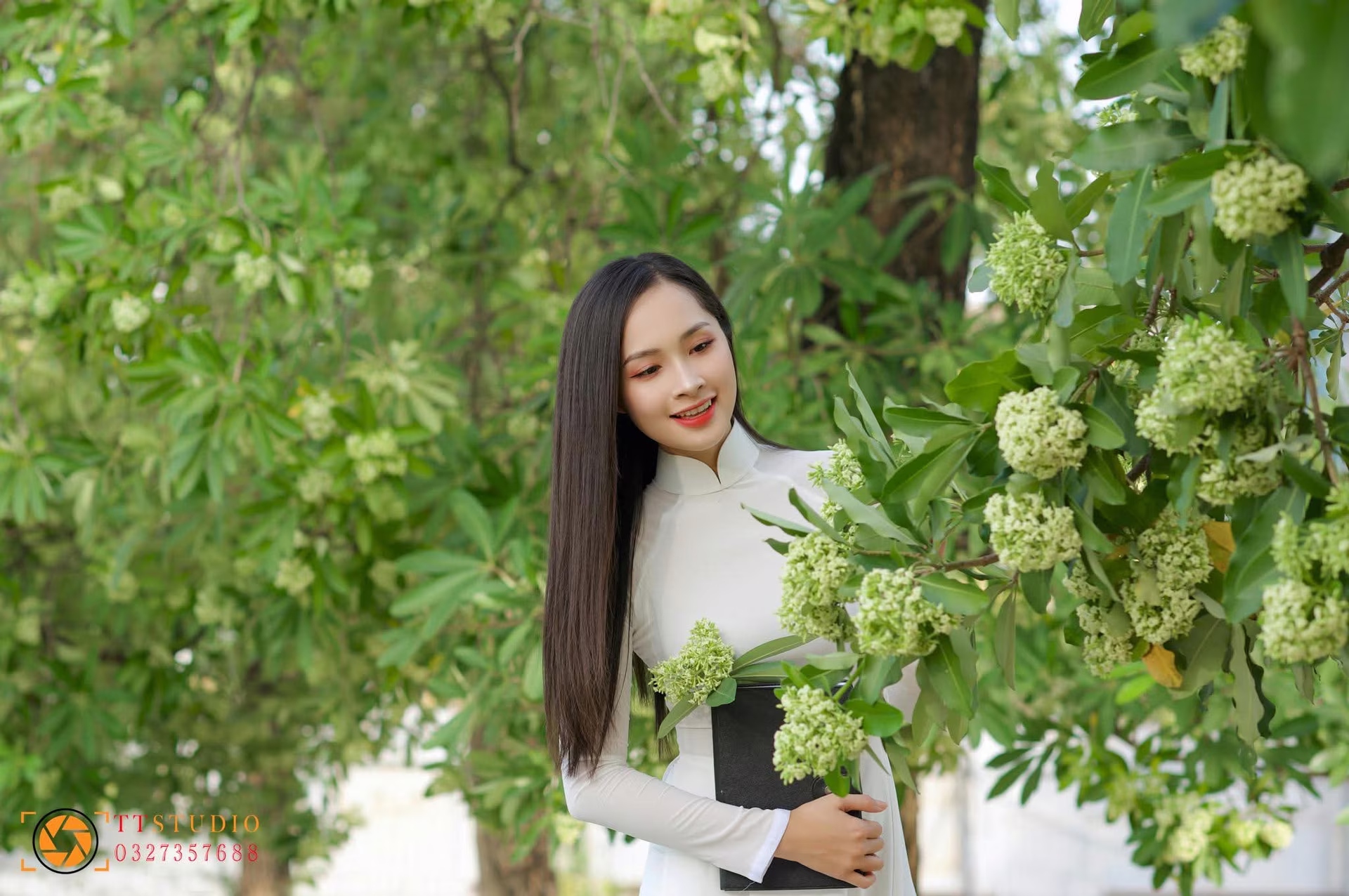 XVG No.14: Vietnamese Beauty, Graceful Girl in White Ao Dai Under Blossoming Trees, Evoking Timeless Elegance.