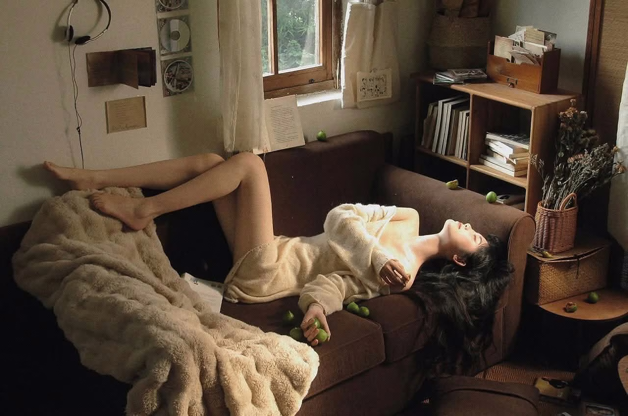 VGU No.86 captures a scene of profound tranquility and warmth In this inviting corner a young woman finds solace in a moment of pure relaxation Soft afternoon sunlight streams through the window casting a gentle glow that illuminates the room and creates a dreamy atmosphere She reclines comfortably on a plush sofa with an open book and a plate of vibrant green fruits adding fresh accents to the serene setting This image evokes a slow living lifestyle where individuals discover comfort in stillness and the simple beauty of everyday existence It serves as an invitation to create one's own peaceful sanctuary a space to rejuvenate and immerse oneself in authentic moments #Vietnamese #pretty #charm