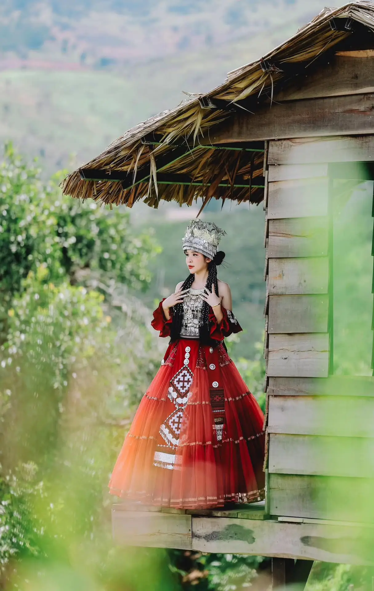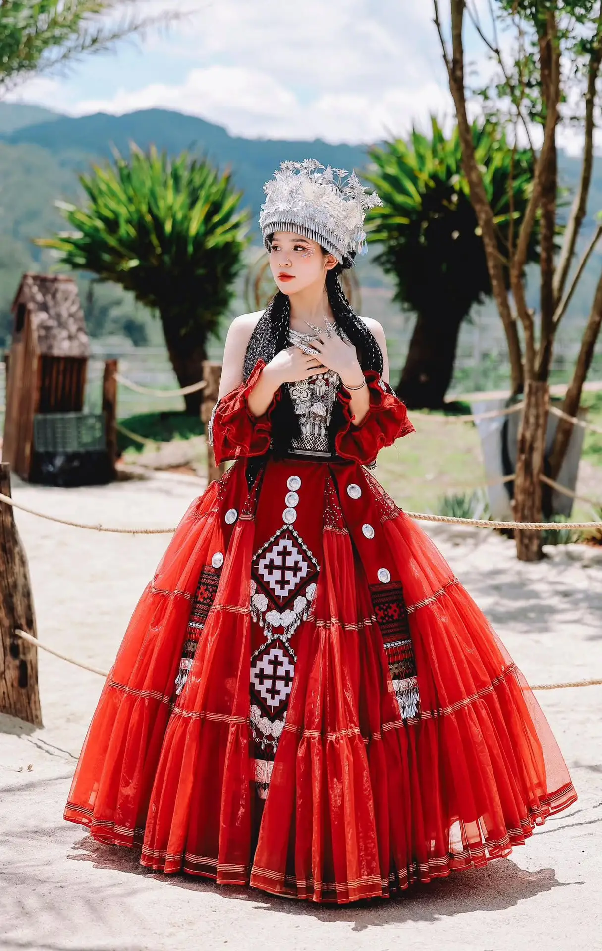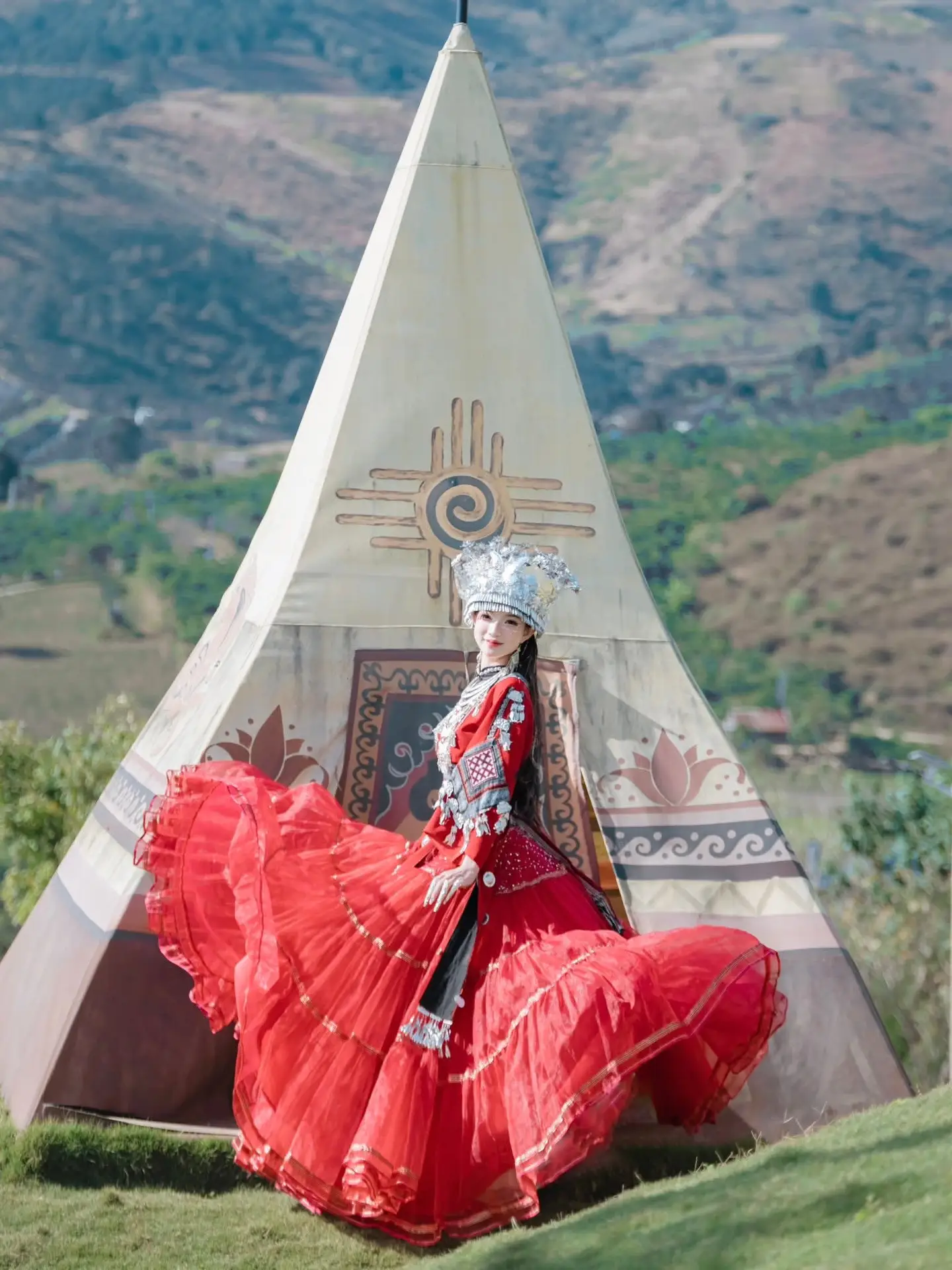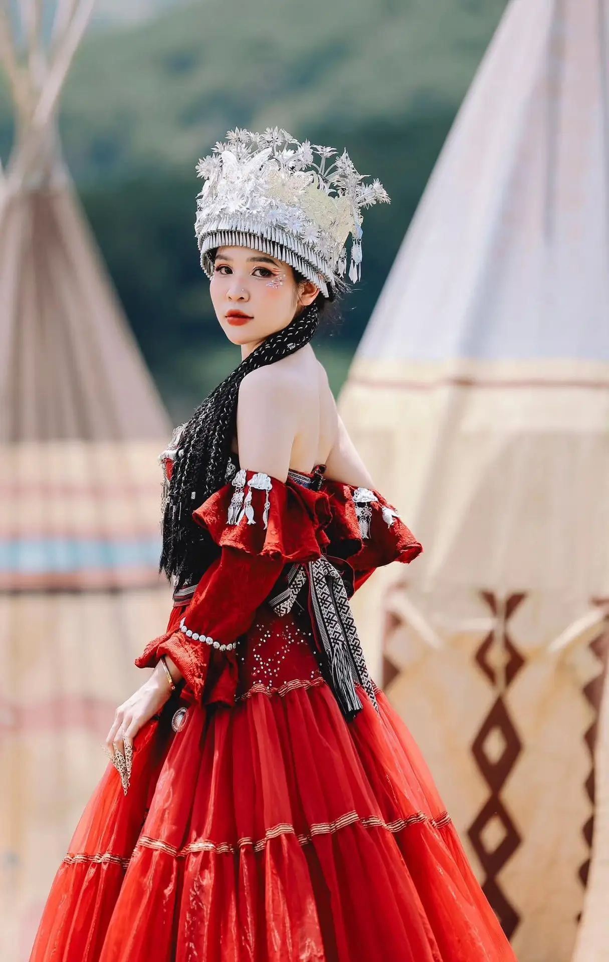 Image 1000024497 beautifully captures a young woman exuding captivating and mysterious charm. She is adorned in a vibrant red traditional costume, intricately detailed with exquisite embroidery and a magnificent silver headpiece. Her gaze is enchanting, inviting viewers to explore the cultural depth behind her beauty. In the background, ethnic-style tents create a unique and authentic setting. The image radiates pride in cultural heritage, conveying the grace and elegance of the woman. This photograph is not just a visual; it is a narrative of beauty and identity.