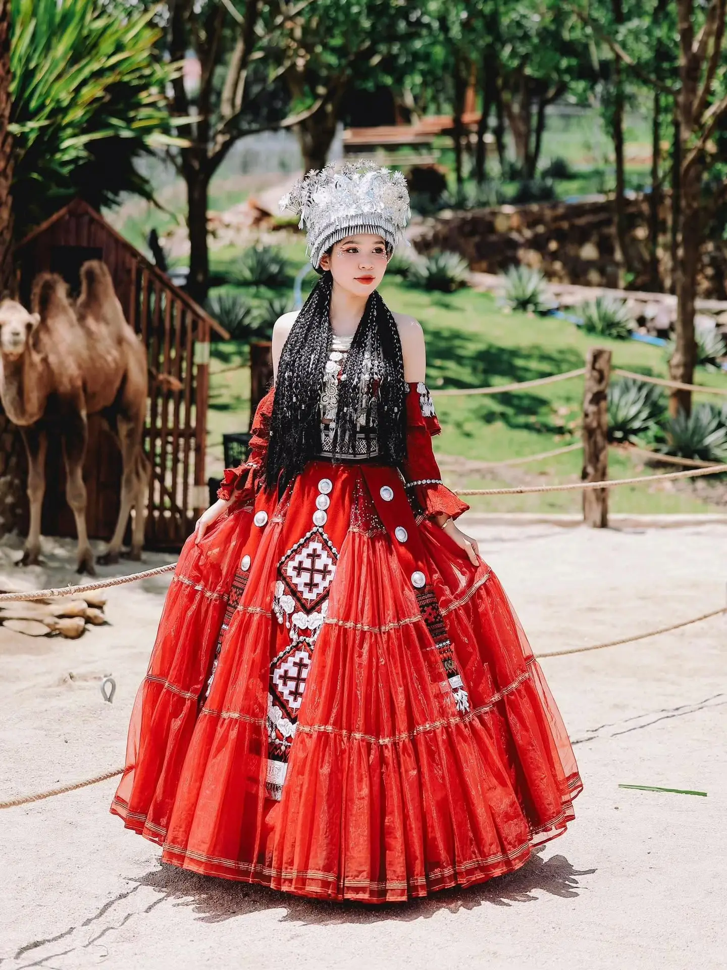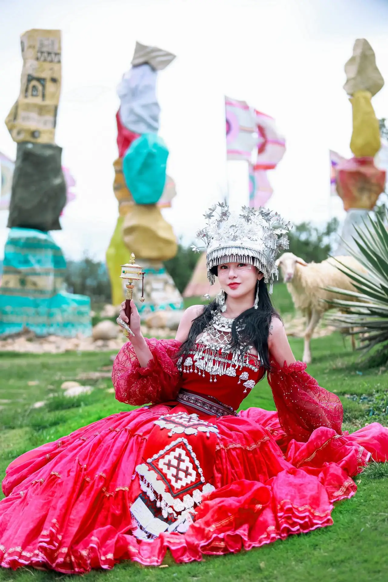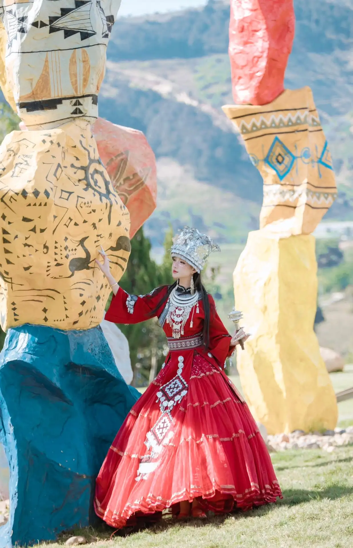 Image 1000024497 beautifully captures a young woman exuding captivating and mysterious charm. She is adorned in a vibrant red traditional costume, intricately detailed with exquisite embroidery and a magnificent silver headpiece. Her gaze is enchanting, inviting viewers to explore the cultural depth behind her beauty. In the background, ethnic-style tents create a unique and authentic setting. The image radiates pride in cultural heritage, conveying the grace and elegance of the woman. This photograph is not just a visual; it is a narrative of beauty and identity.