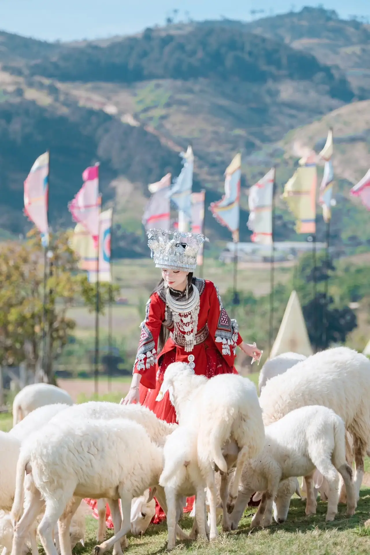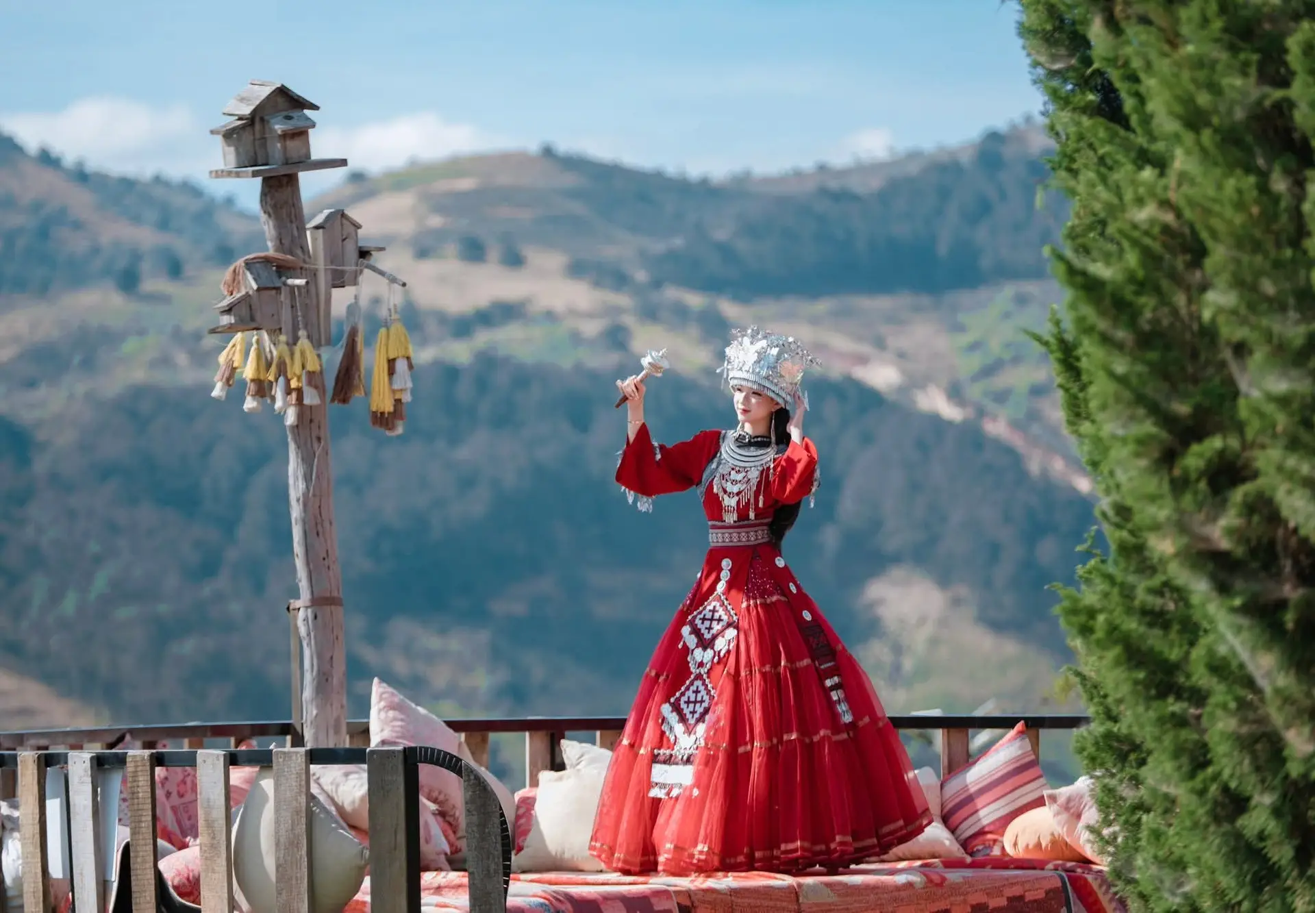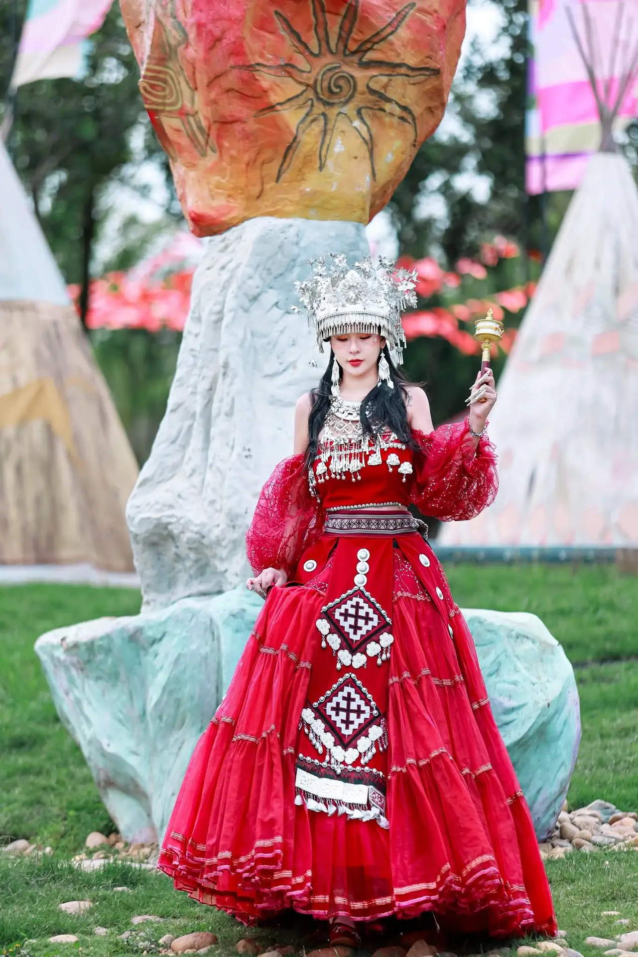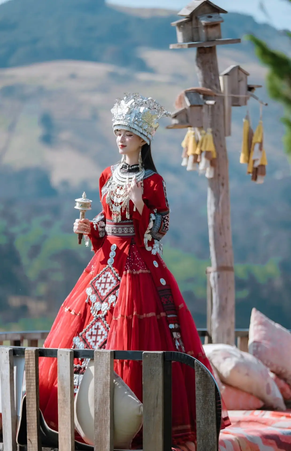 Image 1000024497 beautifully captures a young woman exuding captivating and mysterious charm. She is adorned in a vibrant red traditional costume, intricately detailed with exquisite embroidery and a magnificent silver headpiece. Her gaze is enchanting, inviting viewers to explore the cultural depth behind her beauty. In the background, ethnic-style tents create a unique and authentic setting. The image radiates pride in cultural heritage, conveying the grace and elegance of the woman. This photograph is not just a visual; it is a narrative of beauty and identity.
