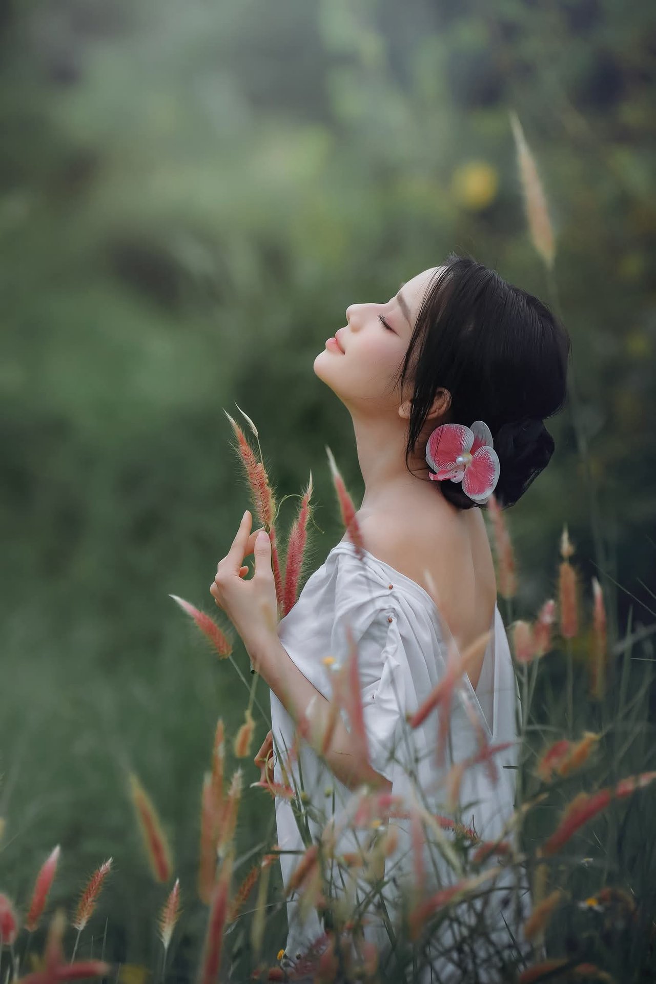 The XVG No6 photograph presents a stunning aesthetic portrait capturing the pure beauty of an East Asian woman The muse in her pristine white attire gently reveals her delicate bare shoulder merging with the tranquil natural surroundings Holding a white parasol and with a red flower adorning her hair she closes her eyes savoring a peaceful moment under the soft sunlight Every detail from the gentle lighting to the green hues of the foliage and tiny flowers contributes to a dreamy and aesthetically rich scene This is more than just a photograph it is an artistic creation evoking feelings of harmony between humanity and nature the eternal beauty of purity